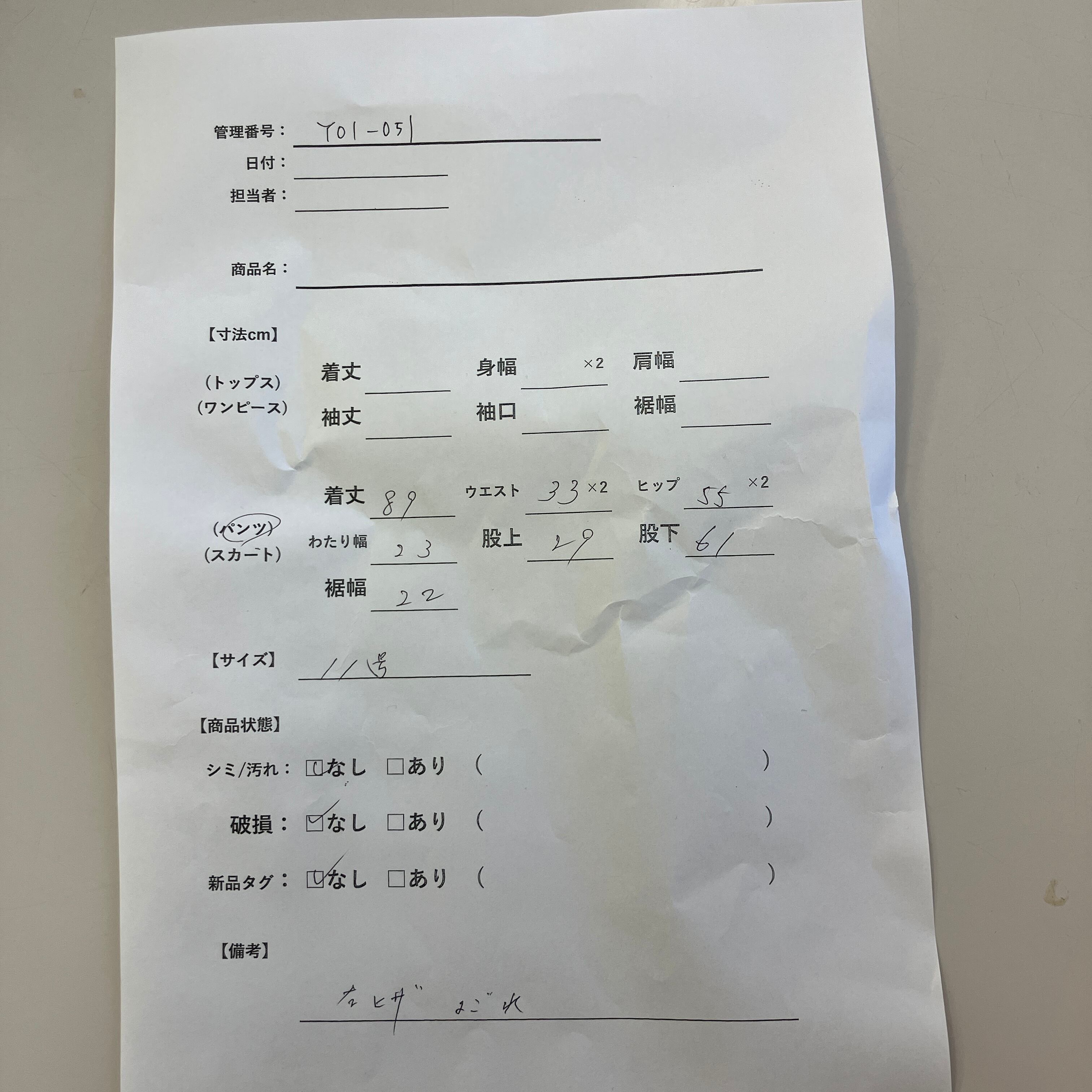 シミ/汚れ: あり(左ヒザ部分によごれあり)