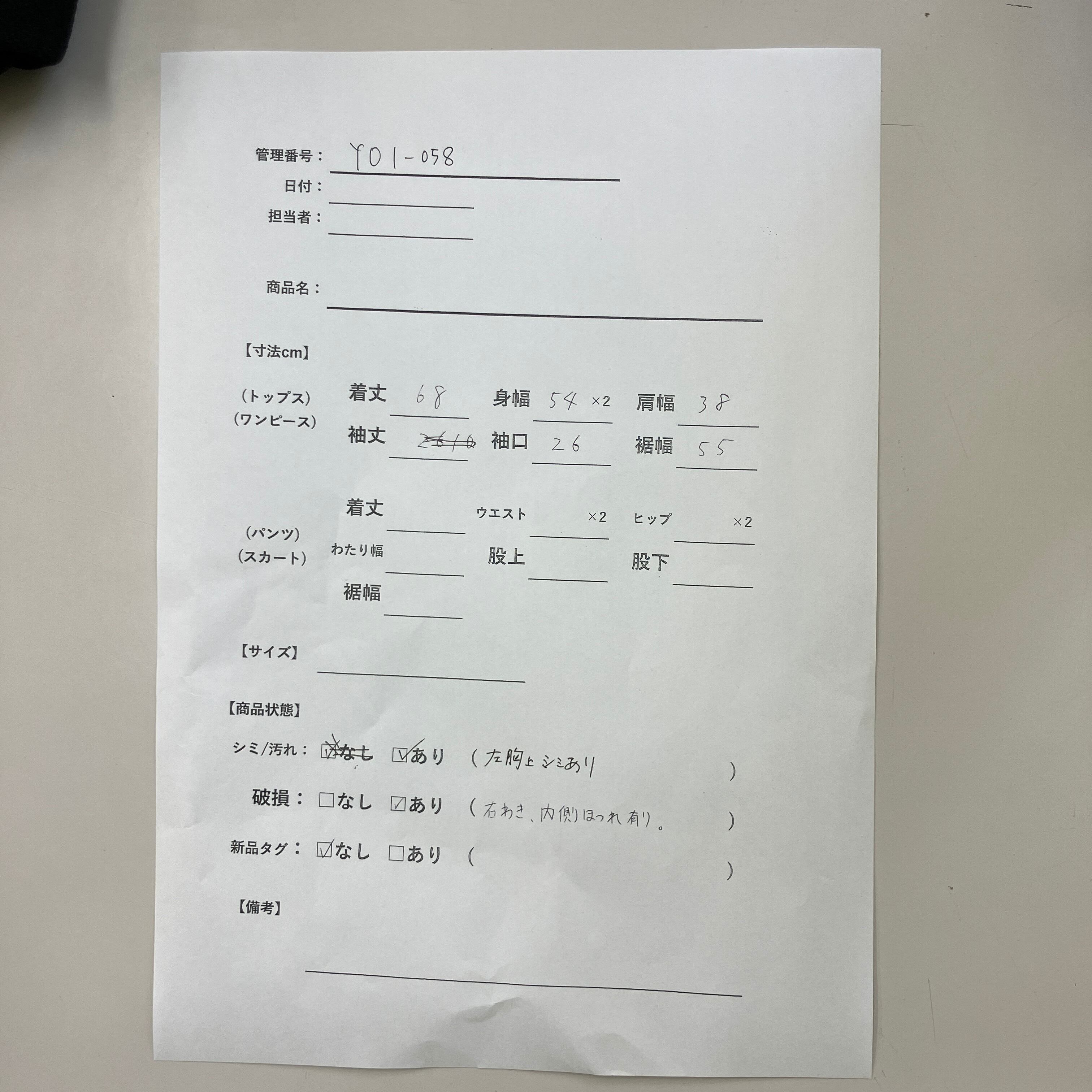 シミ/汚れ: あり(左胸上にシミあり)