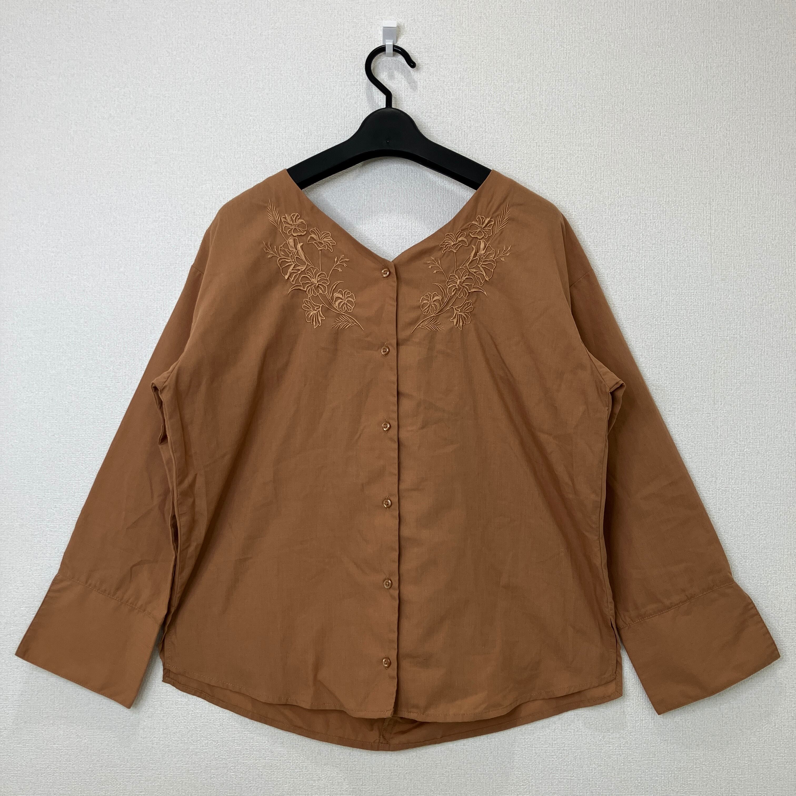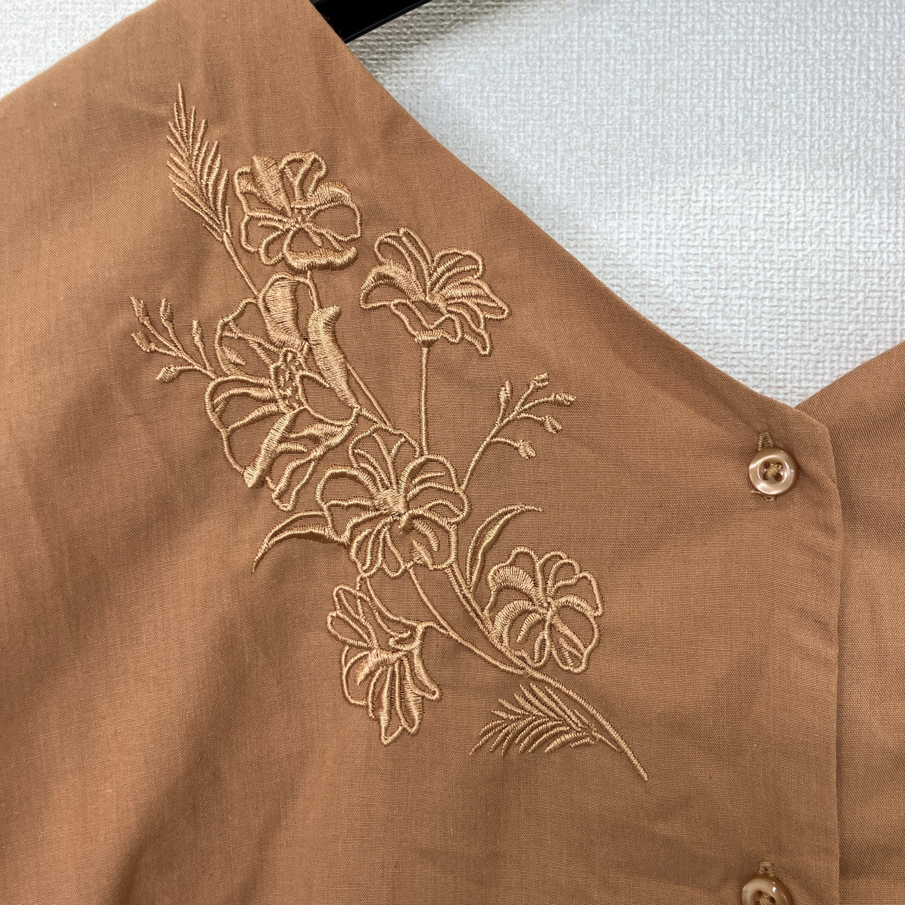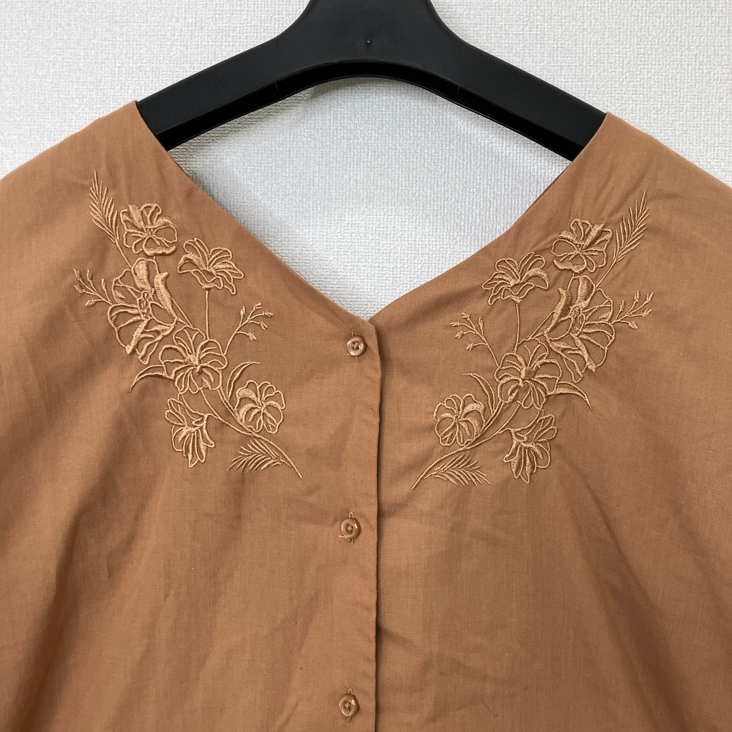 落ち着いたブラウンカラーに、胸元の繊細な花柄刺繍が上品なブラウスです。