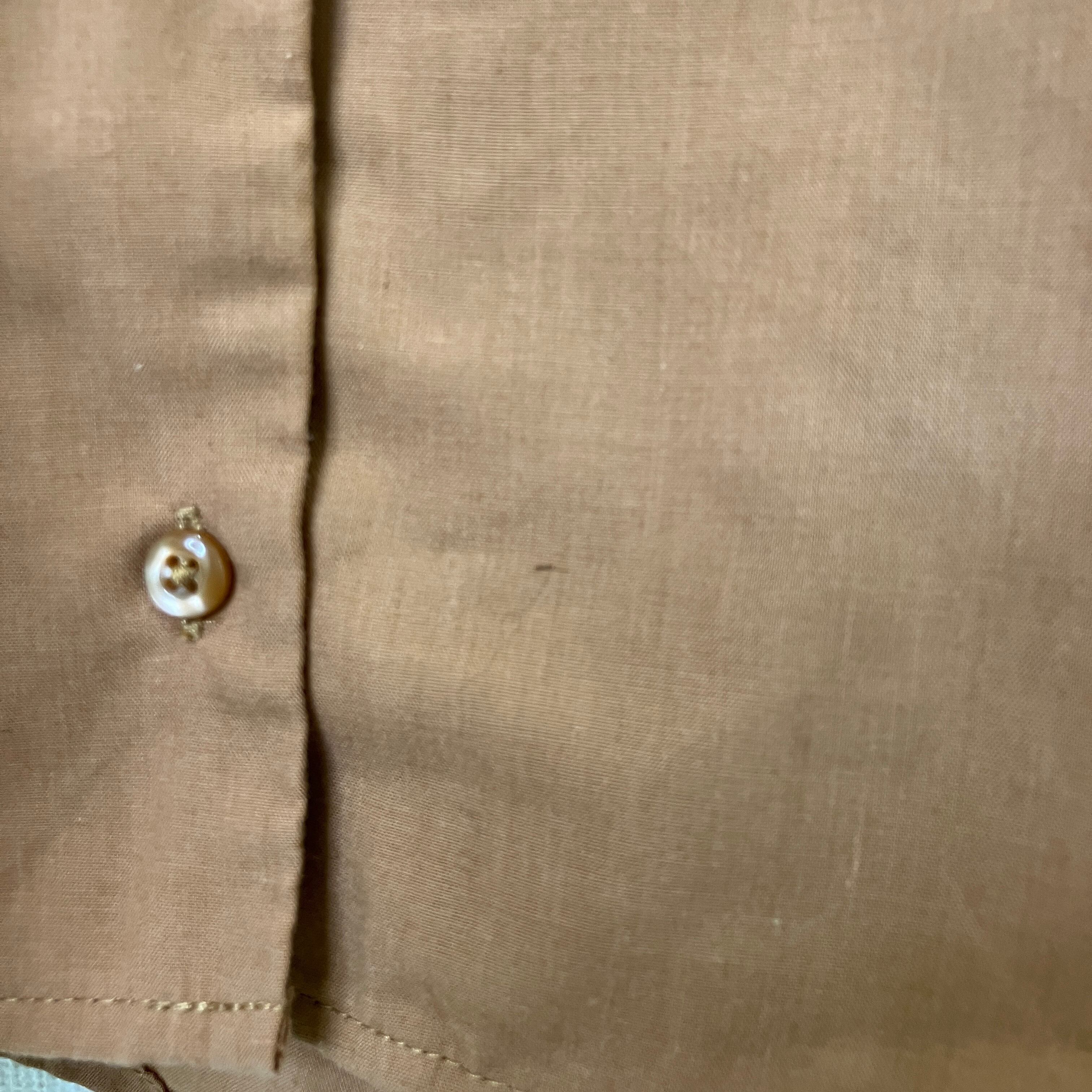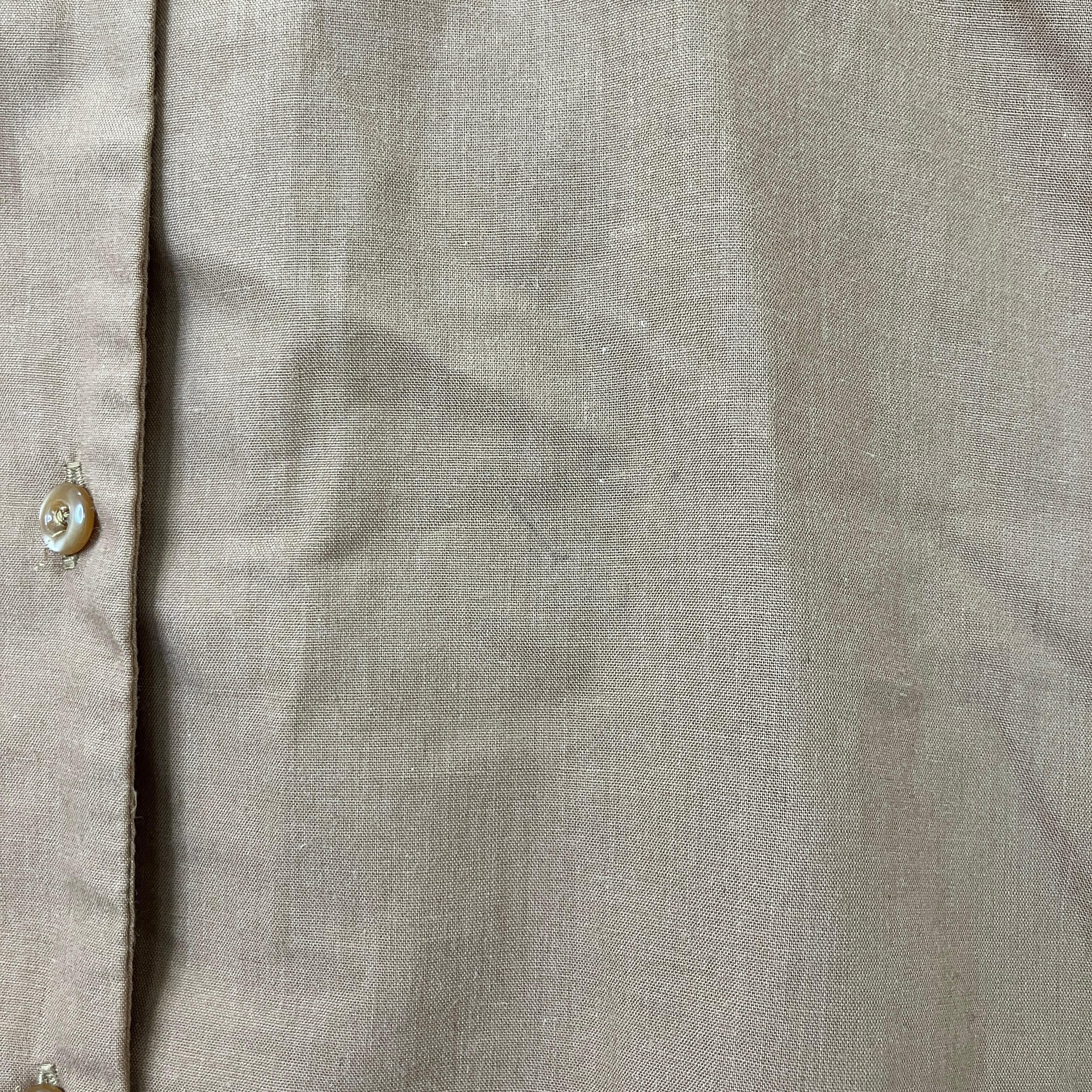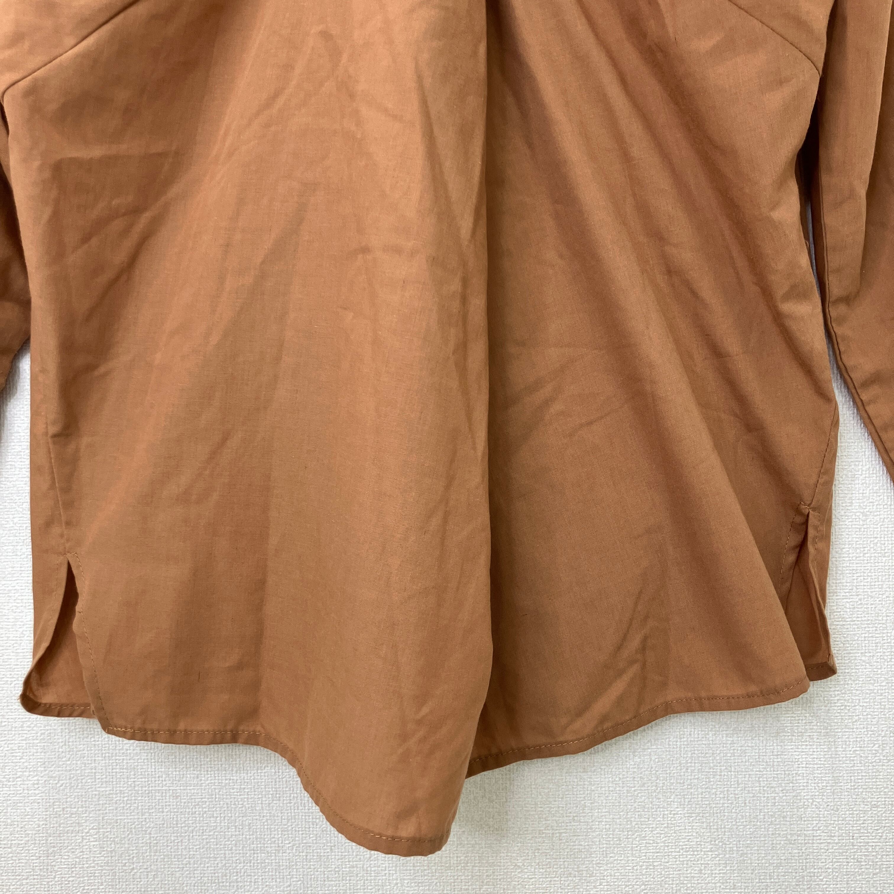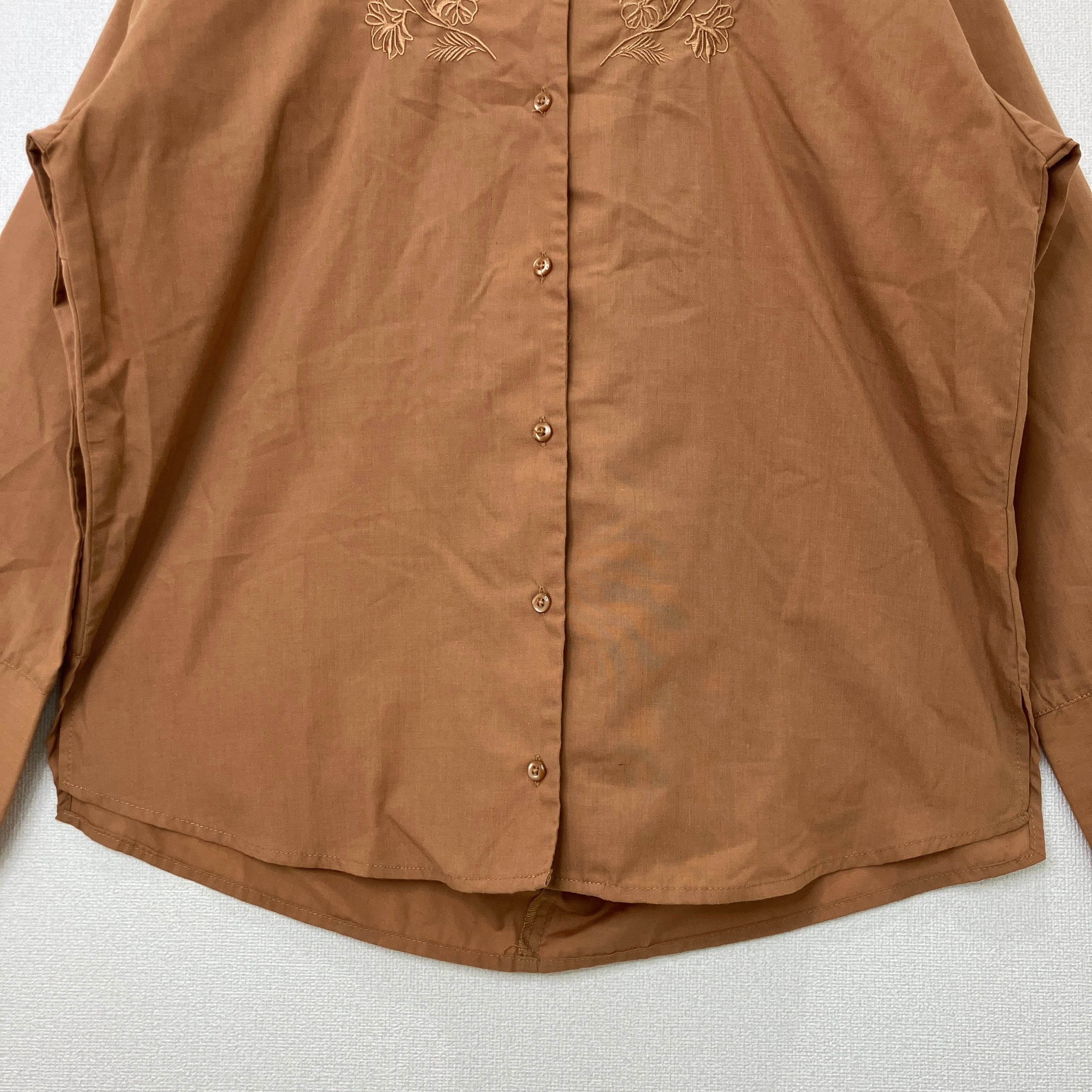 落ち着いたブラウンカラーに、胸元の繊細な花柄刺繍が上品なブラウスです。
