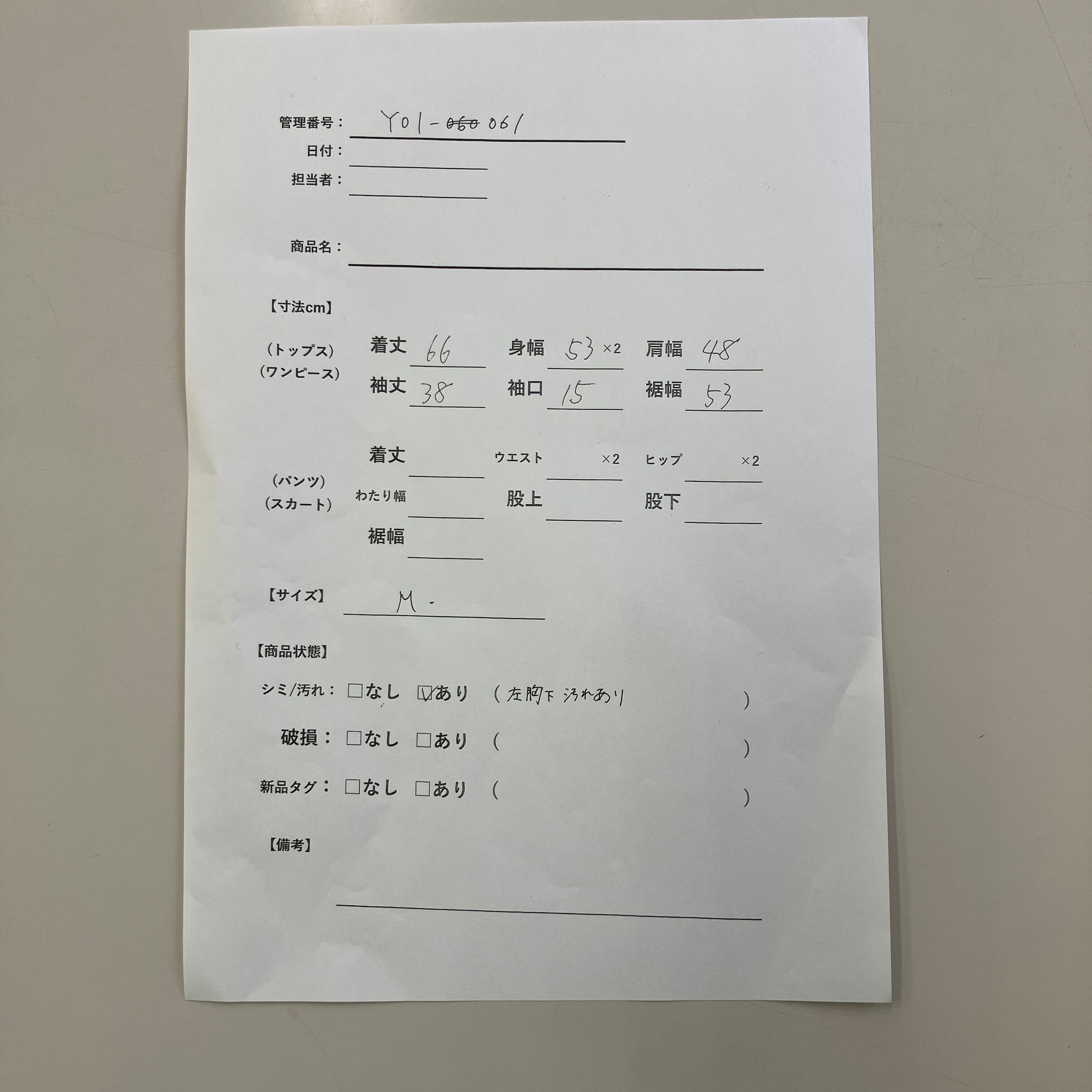 シミ/汚れ: あり(左胸下に汚れあり)