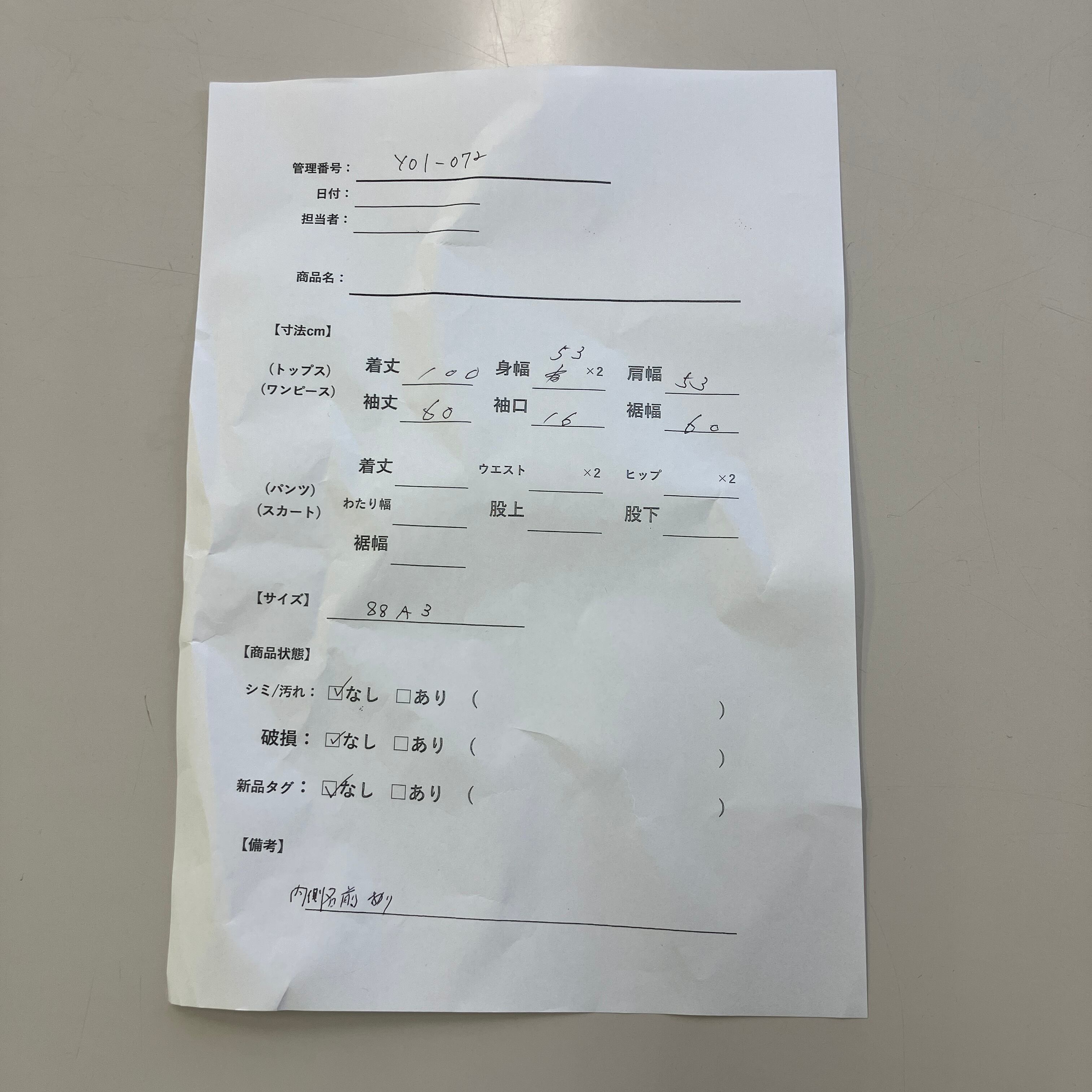 管理番号:Y01-072 #てまいらずアパレル商品一覧