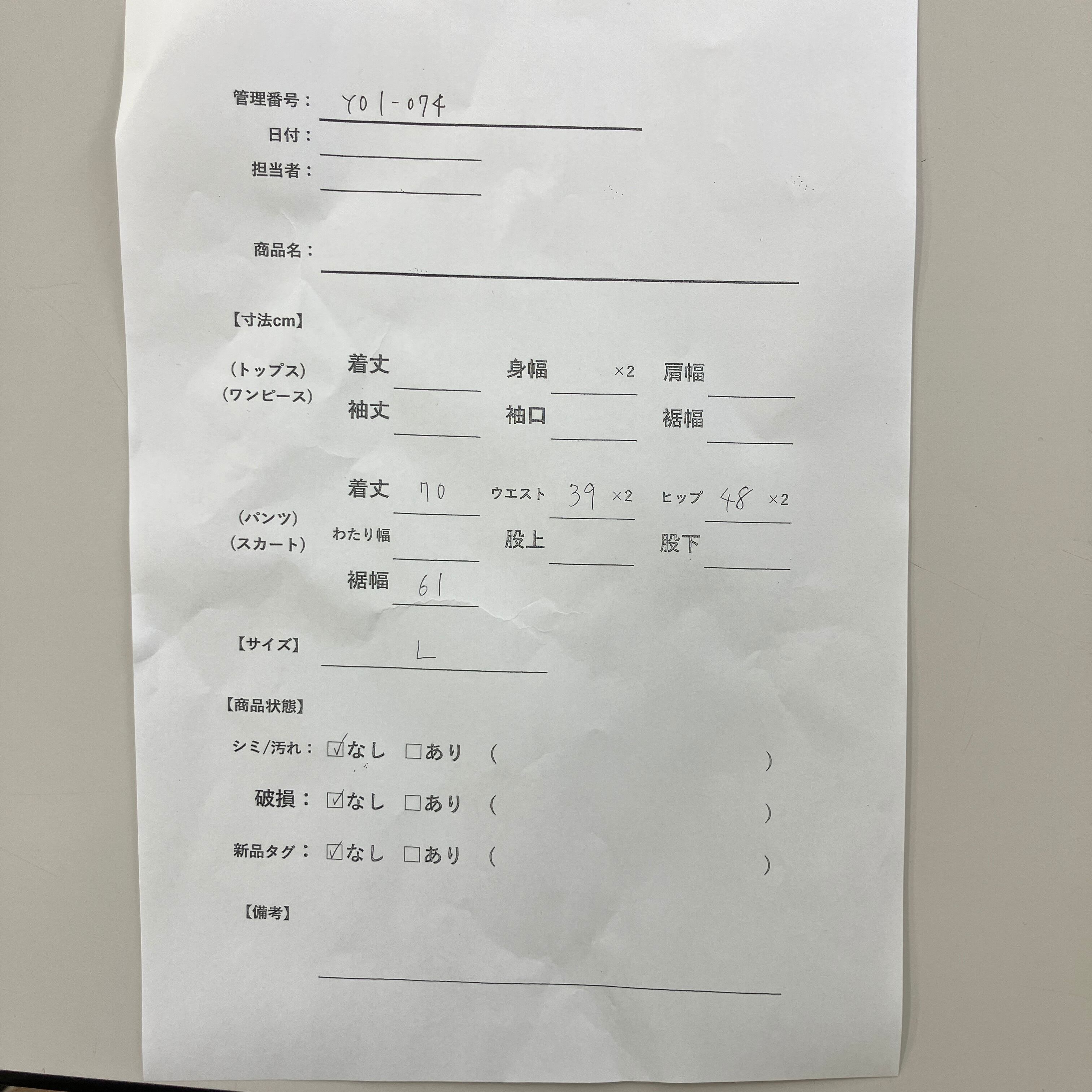 管理番号:Y01-074 #てまいらずアパレル商品一覧