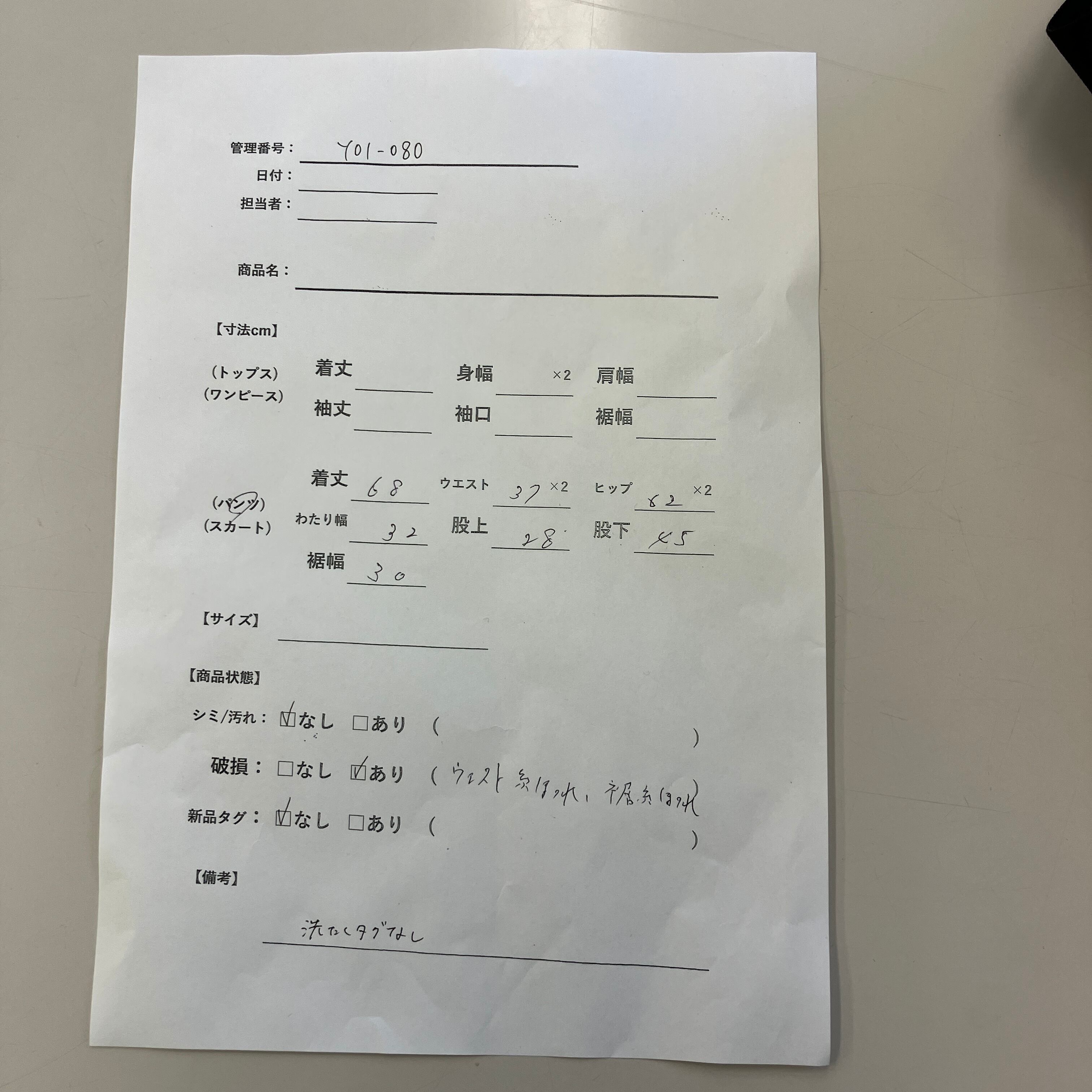 破損: あり(ウエスト部分および裾部分に糸のほつれあり)