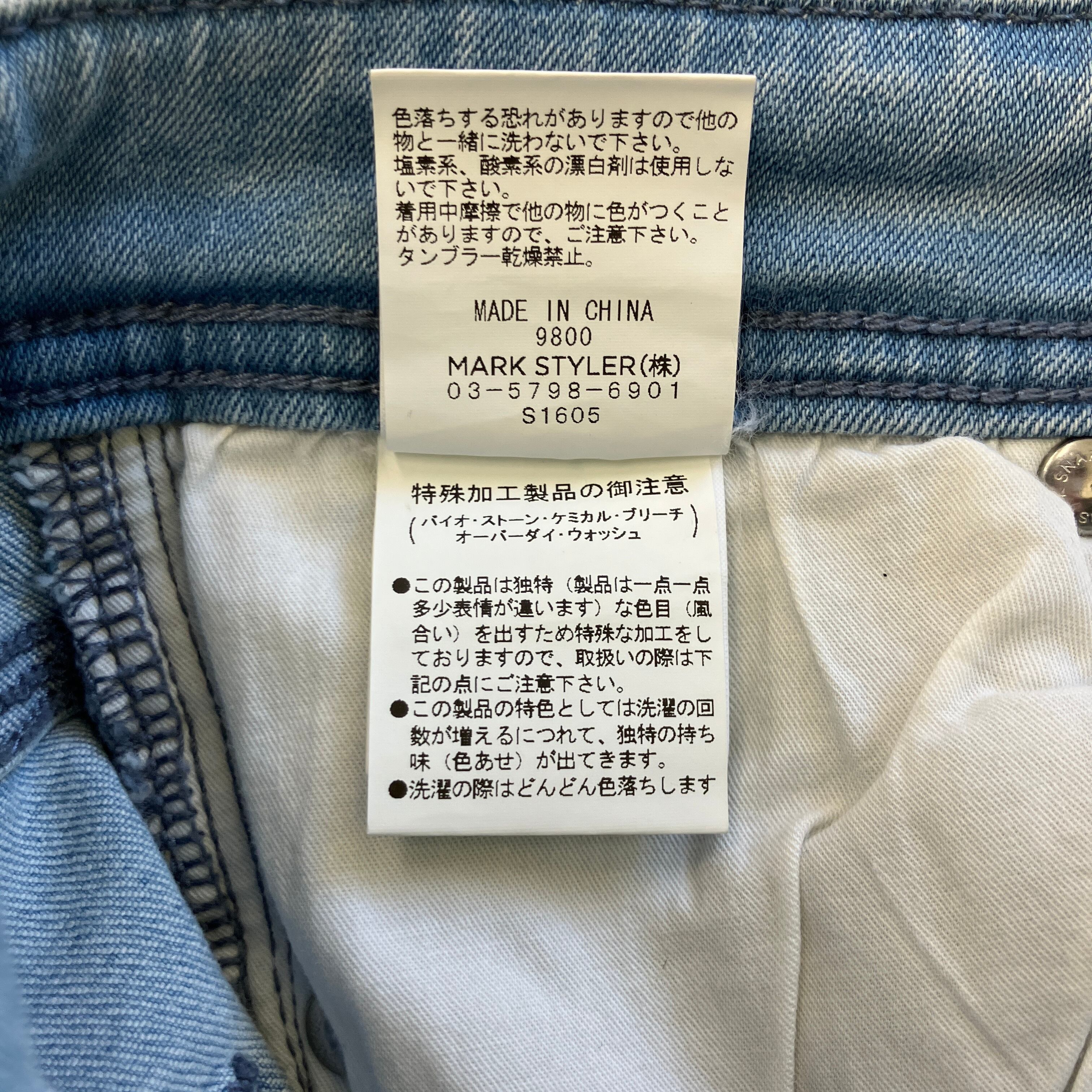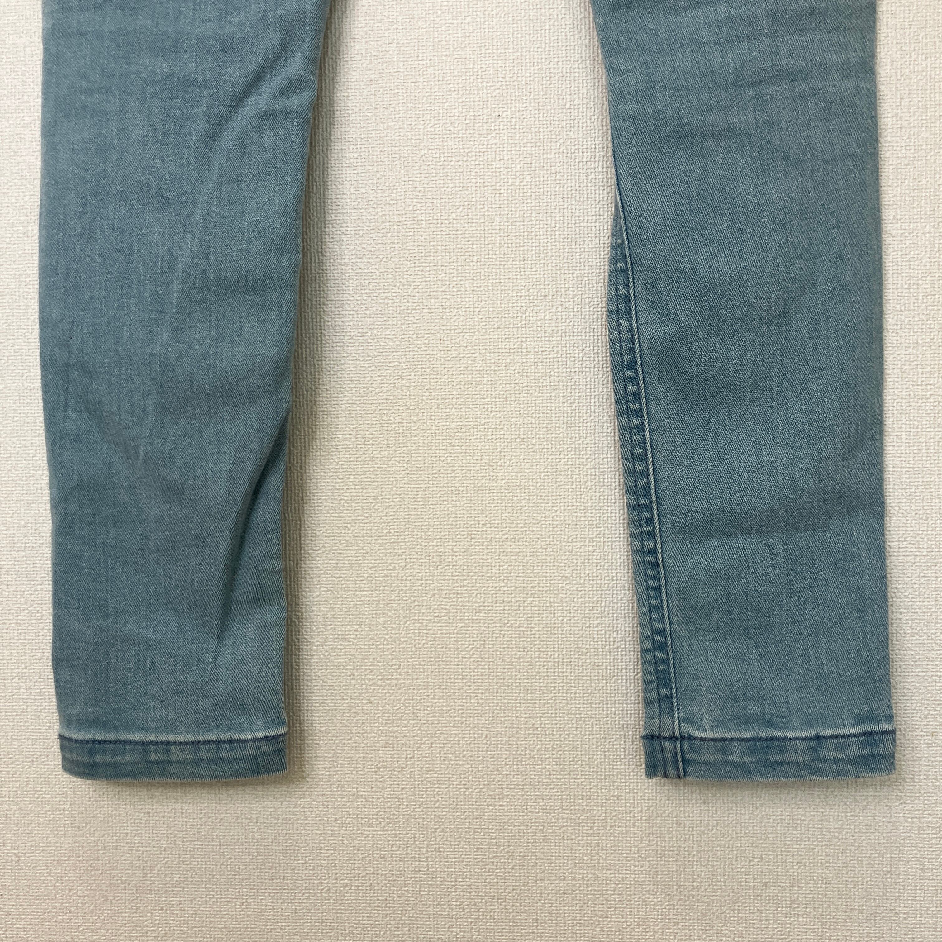 明るめのライトブルーカラーに、膝部分のクラッシュ加工や切りっぱなしの裾デザインが施されており、こなれ感のある一着です。