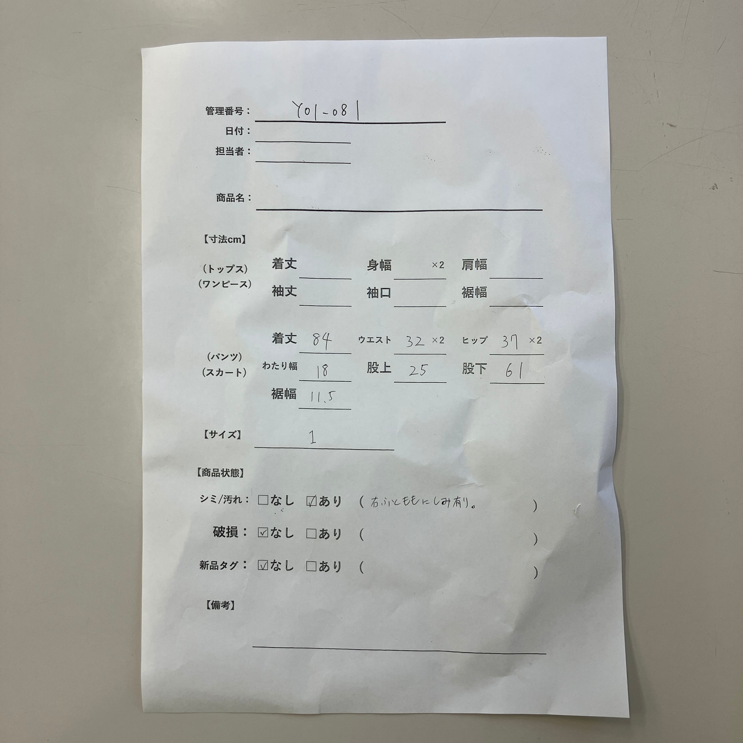 シミ/汚れ: あり(右ふとももにシミ有り)