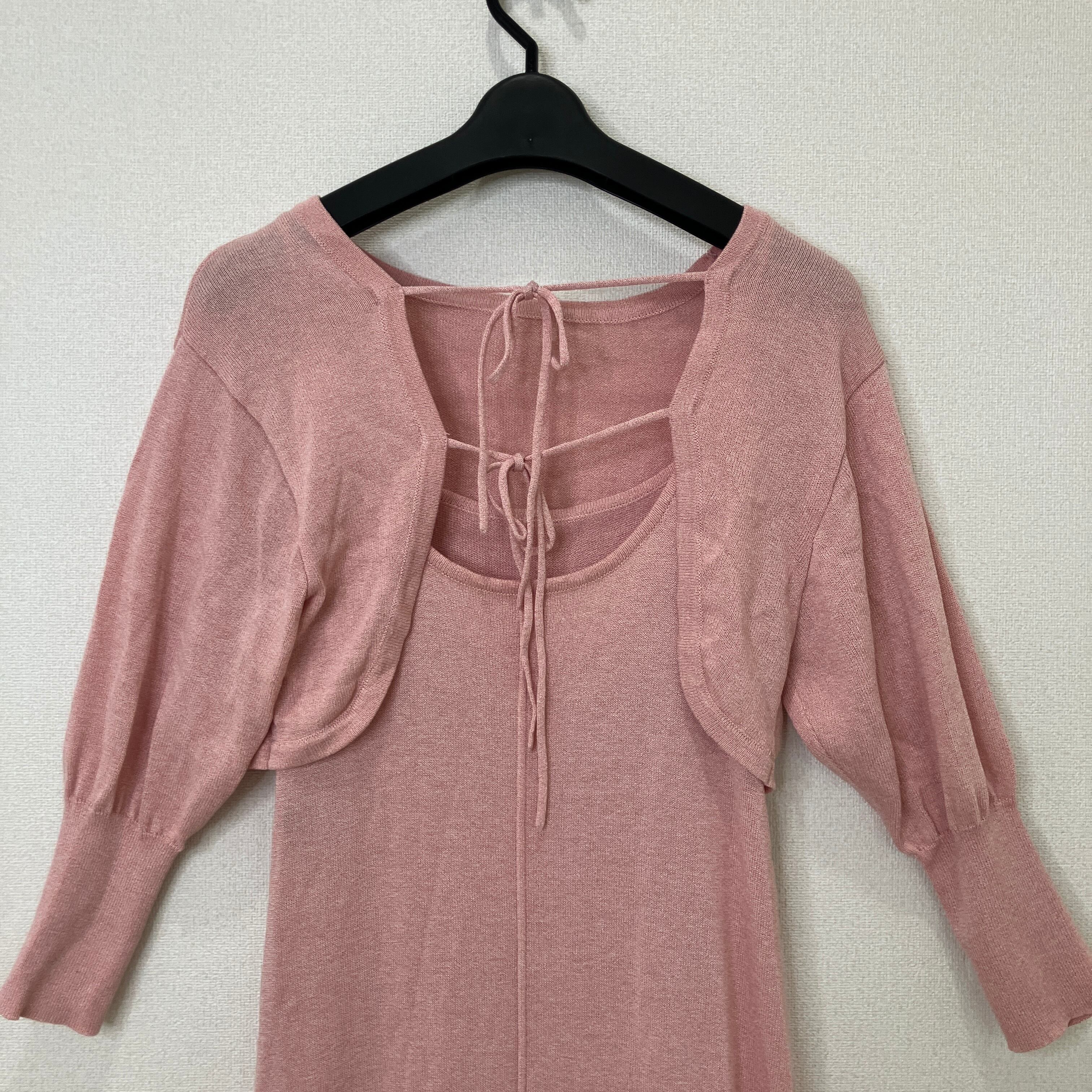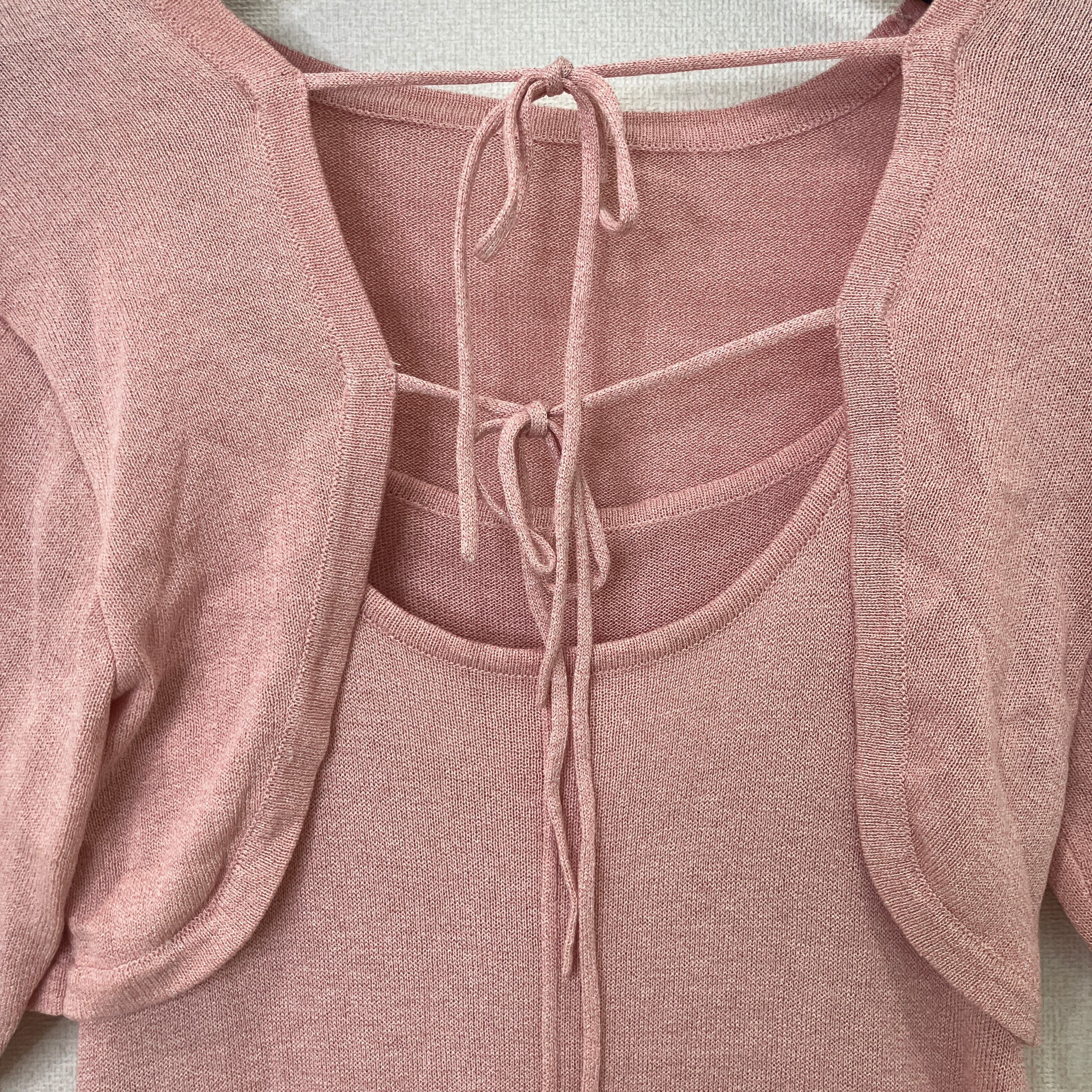 柔らかなピンクの色味と、ボレロのバックリボンデザインが女性らしい印象を与えます。