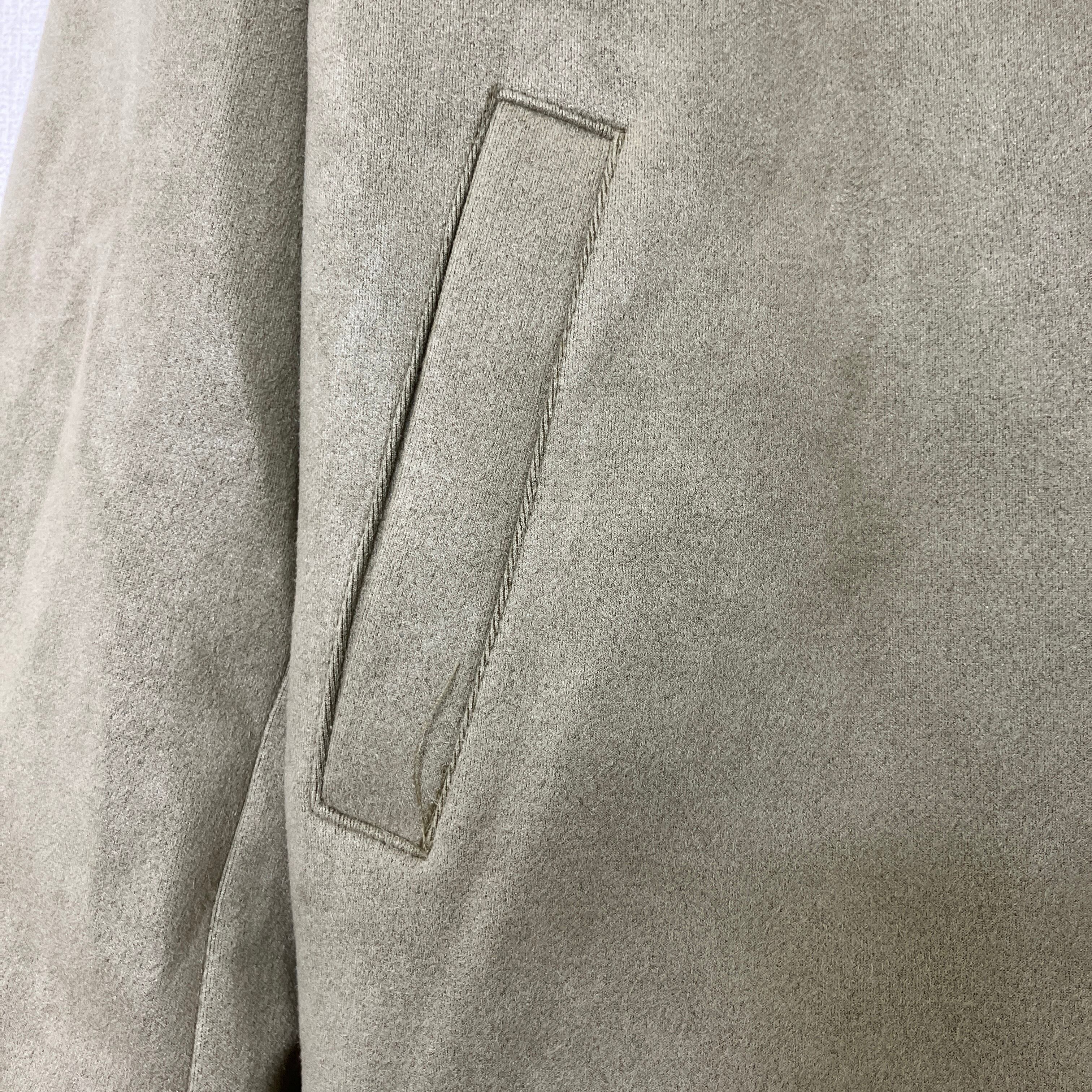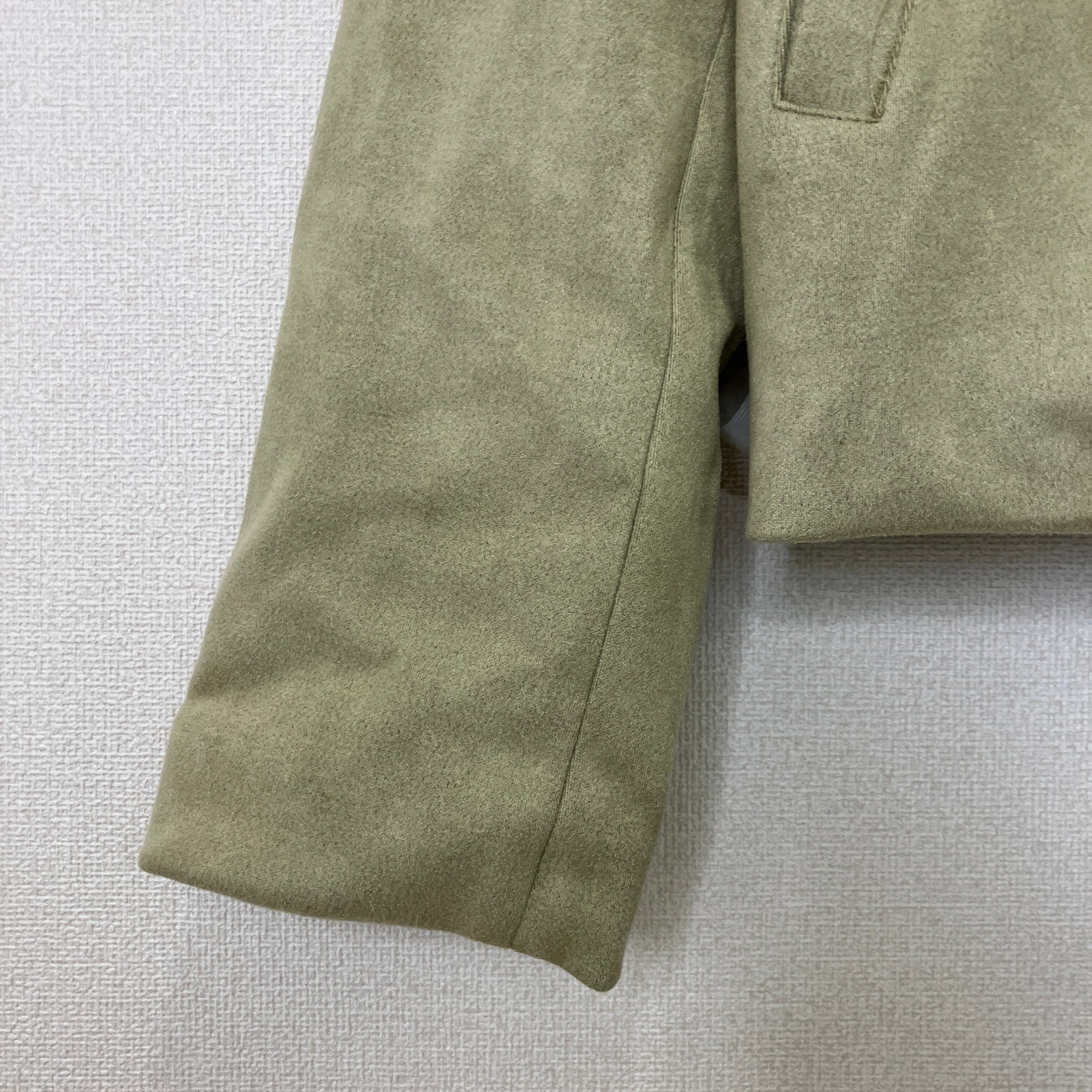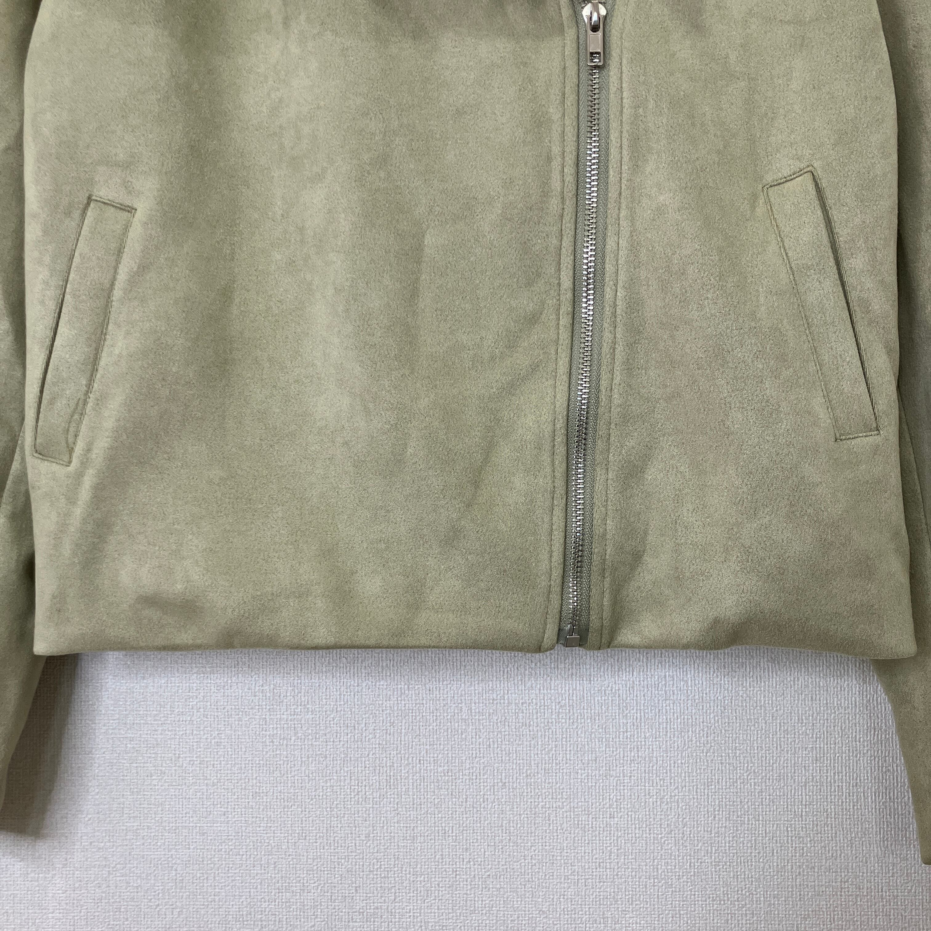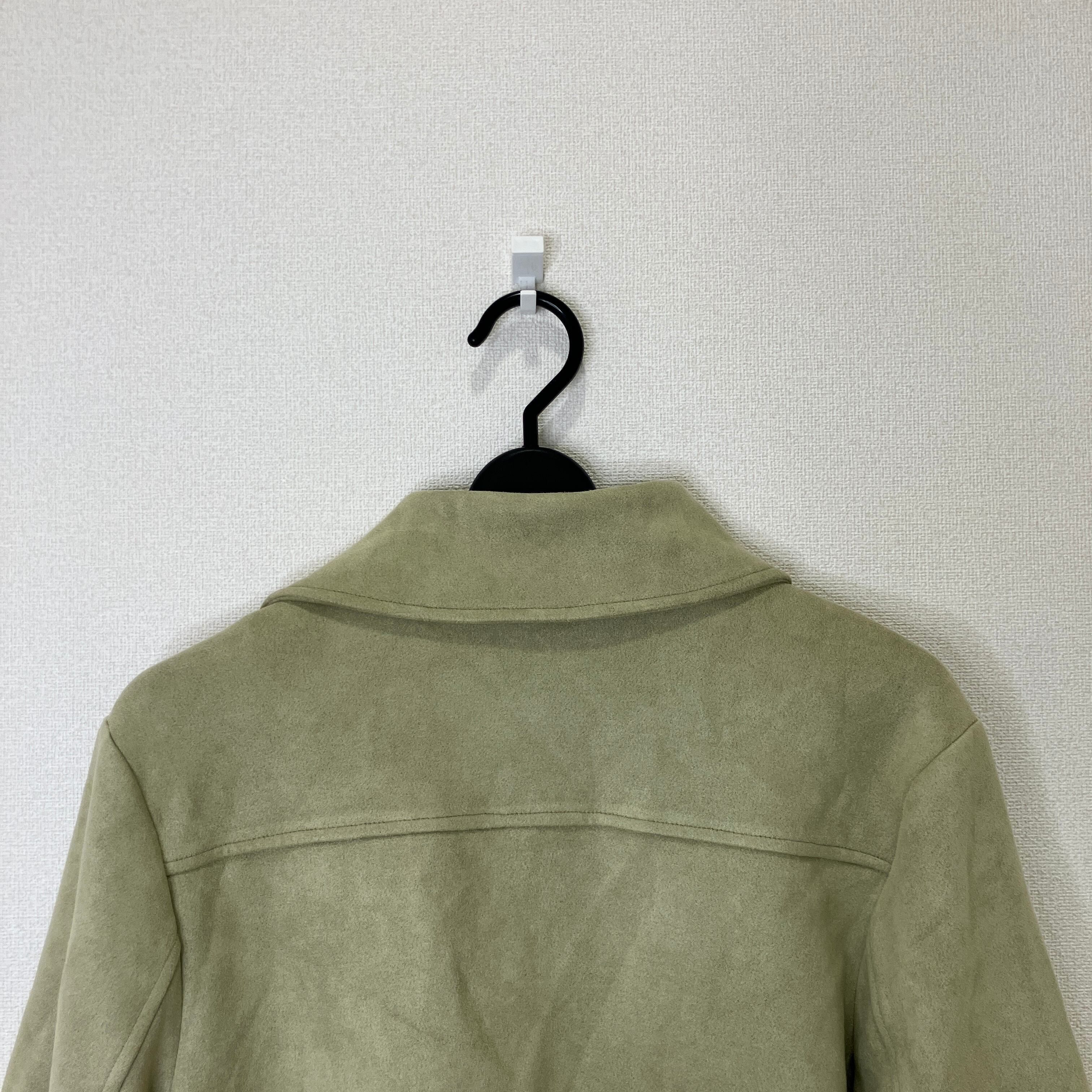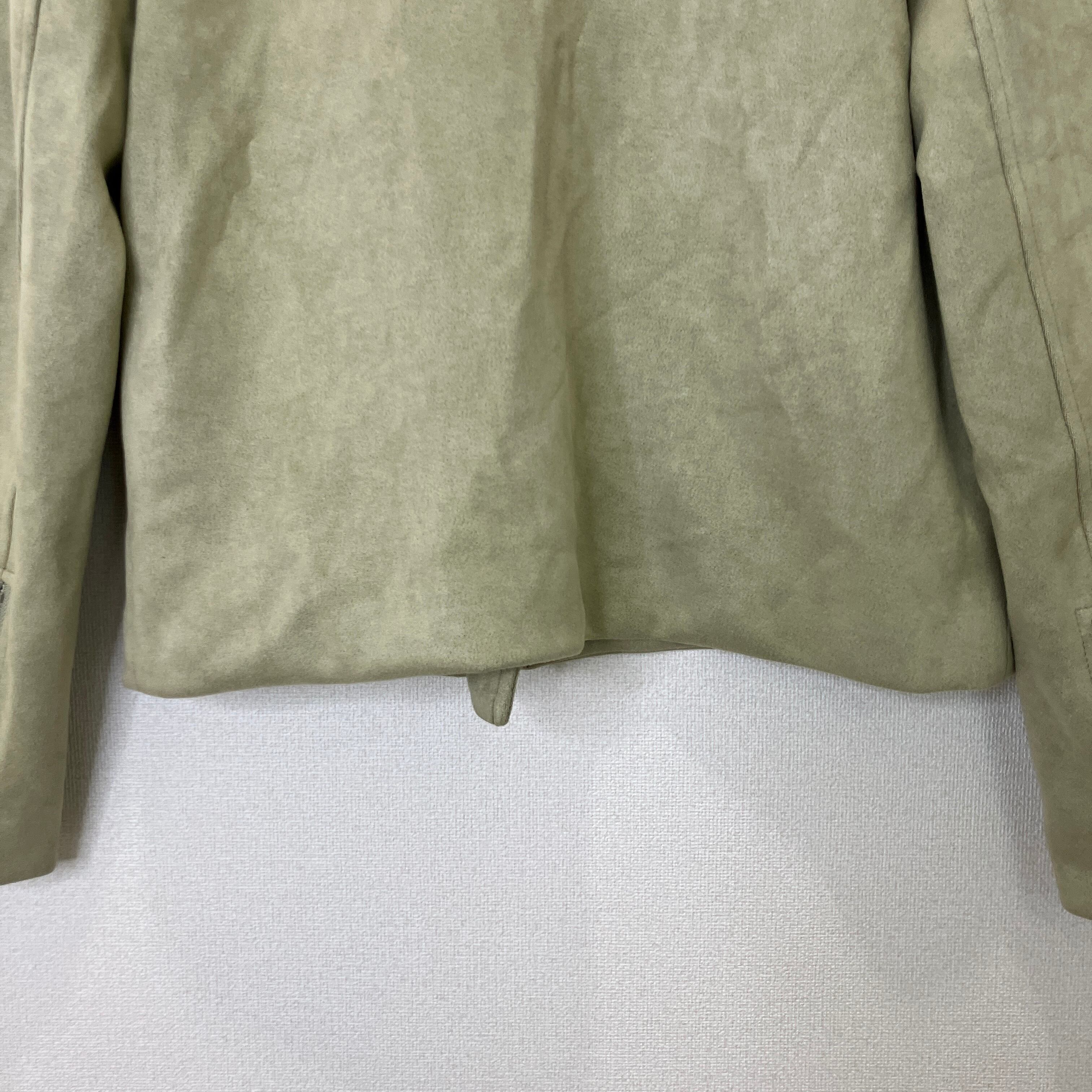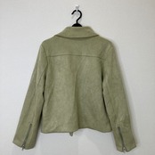 落ち着いたライトカーキ(オリーブ系)の色味が上品な、フェイクスエード素材のライダースジャケットです。