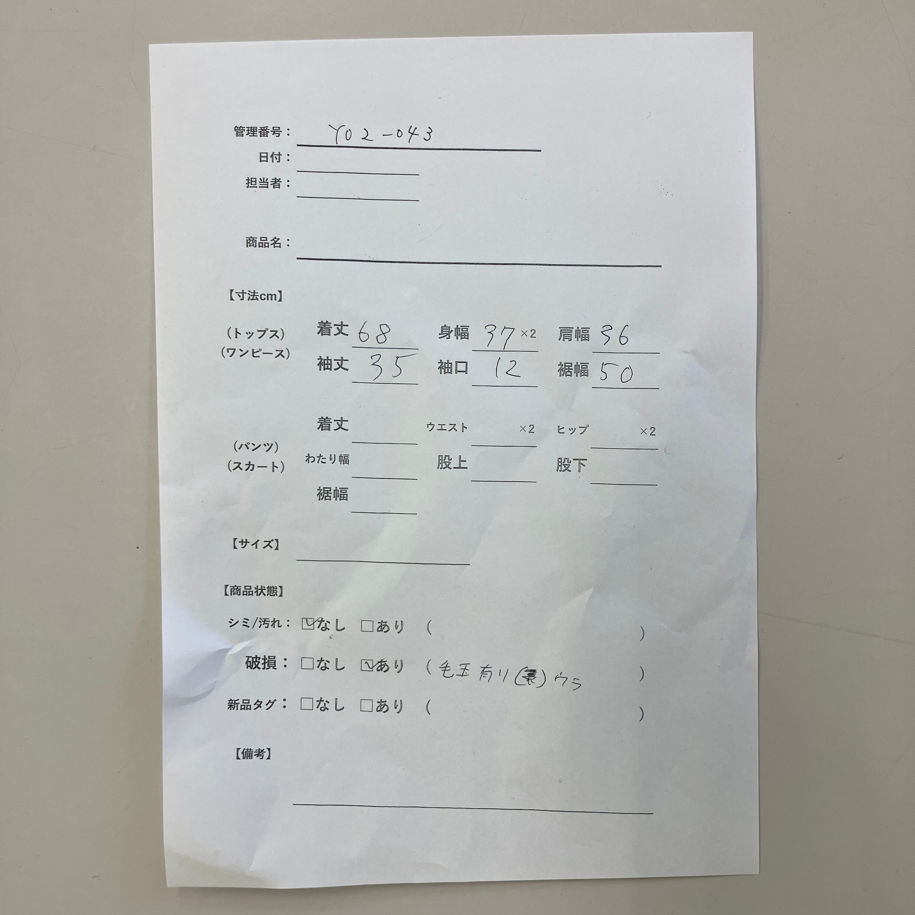 管理番号:Y02-043 #てまいらずアパレル商品一覧