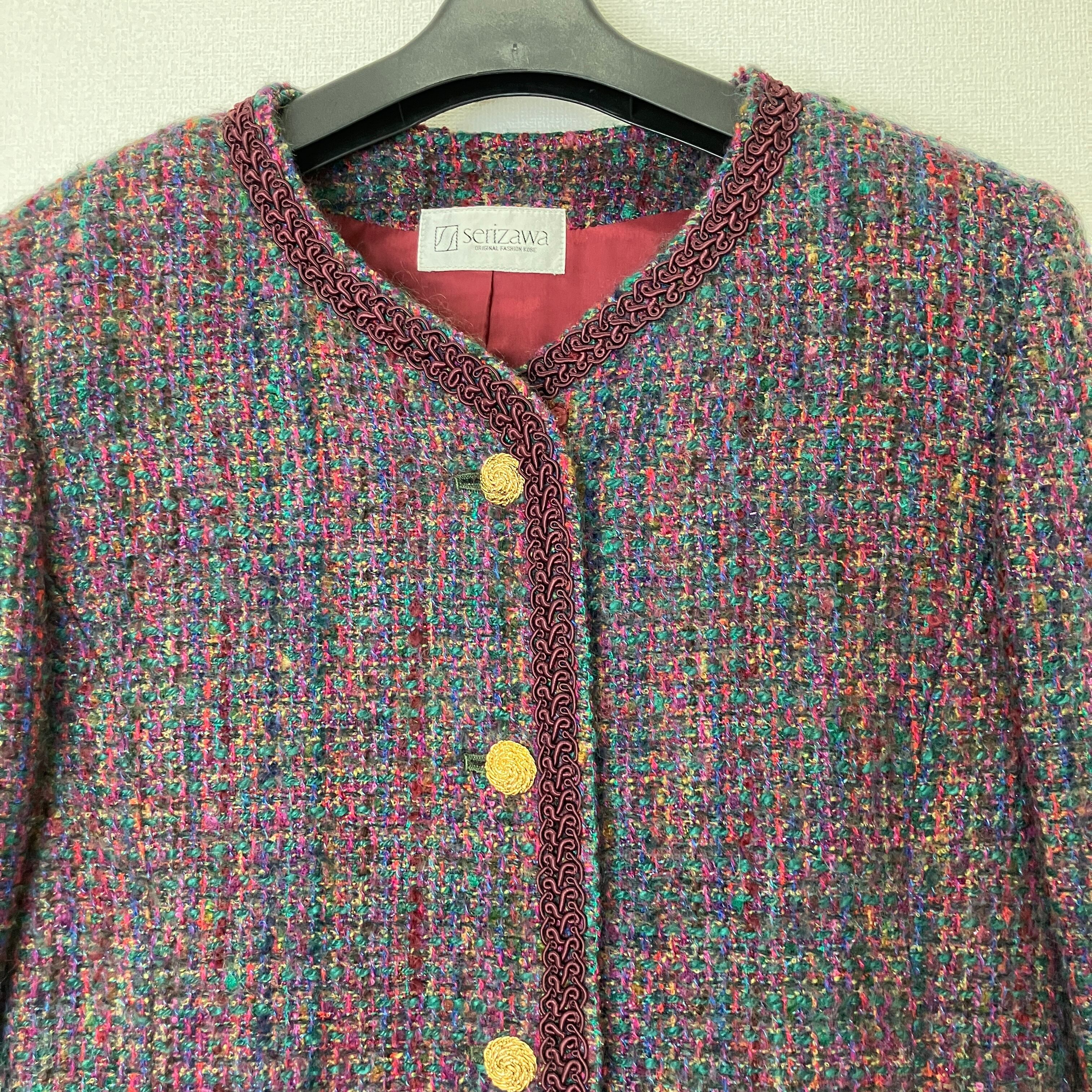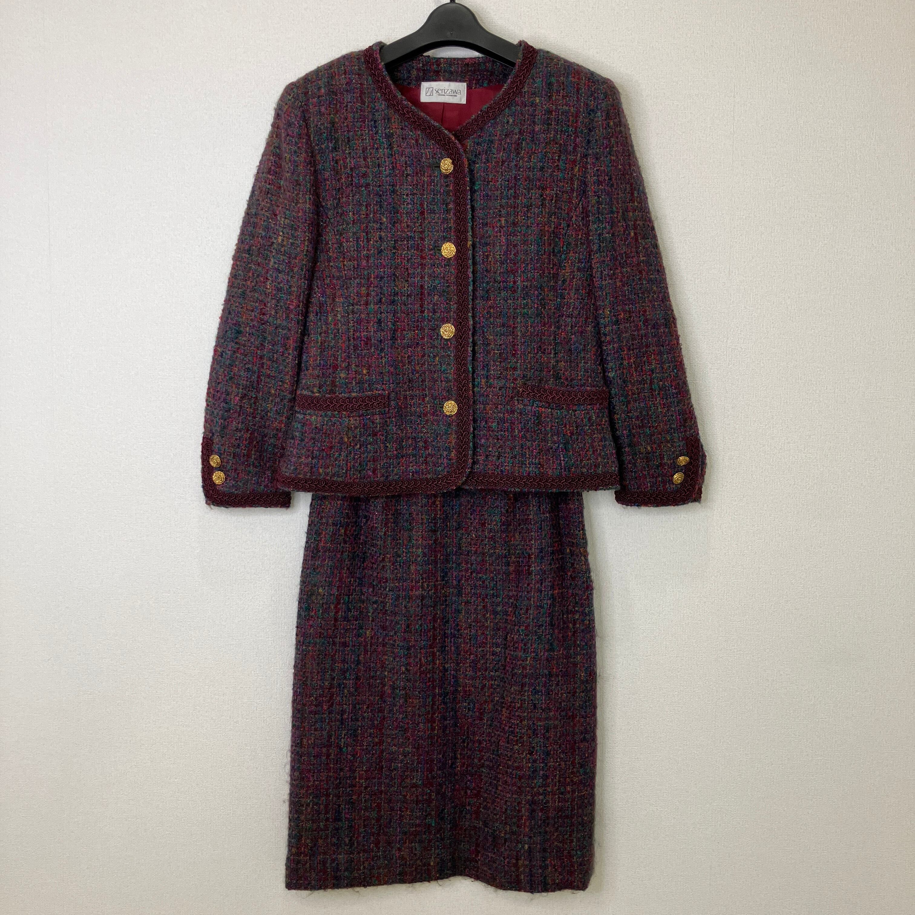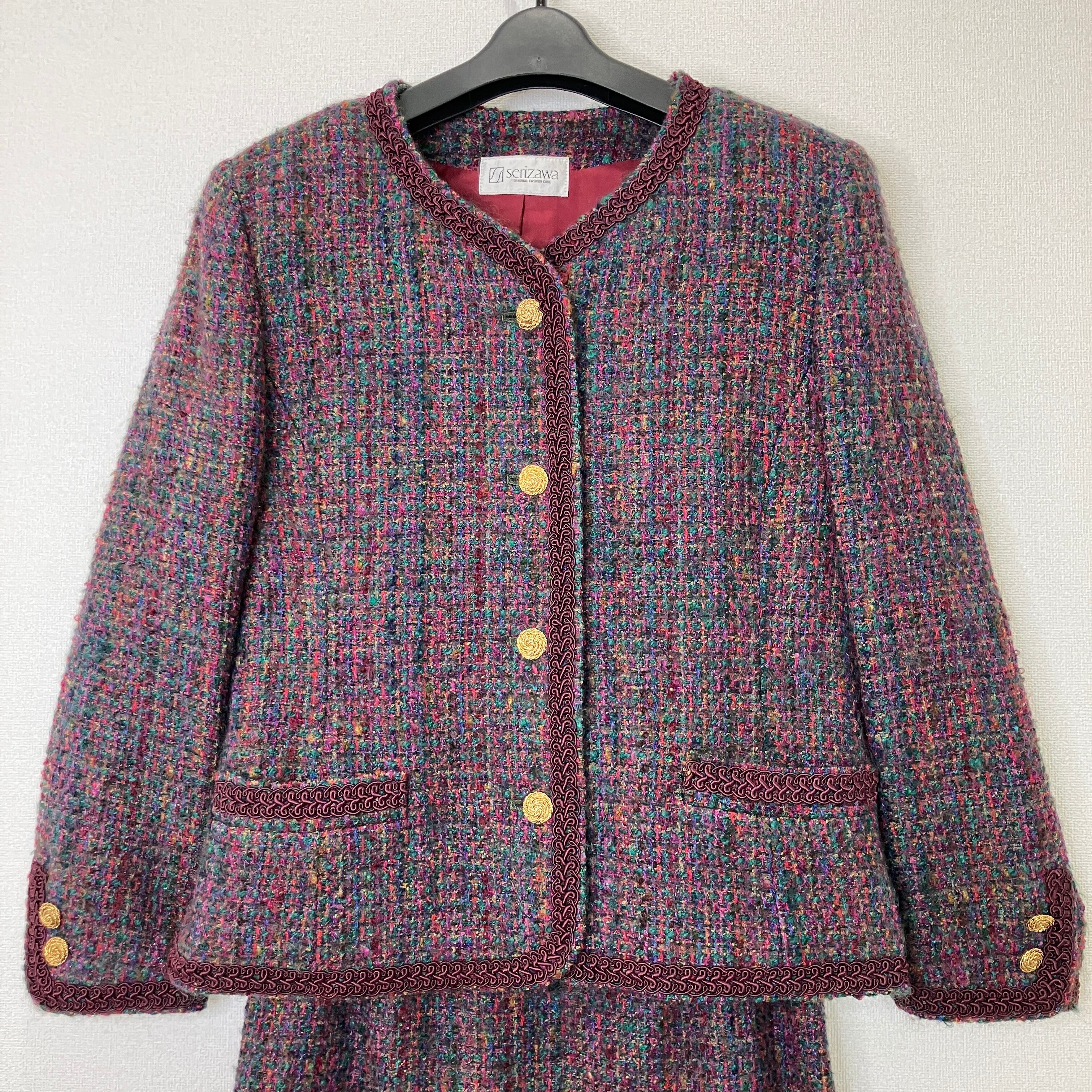 serizawa セリザワ ツイード セットアップ ノーカラージャケット スカート ボルドー マルチカラー