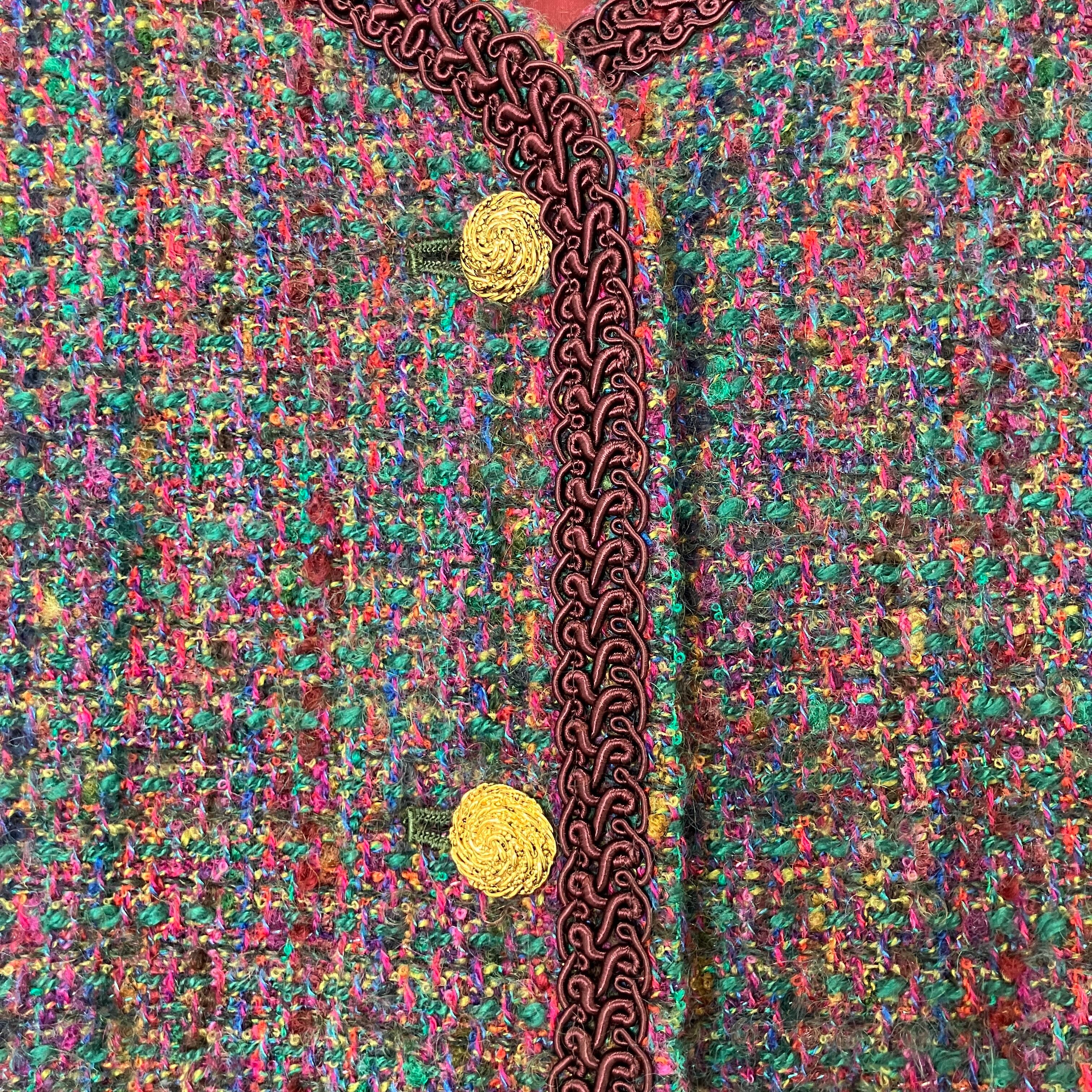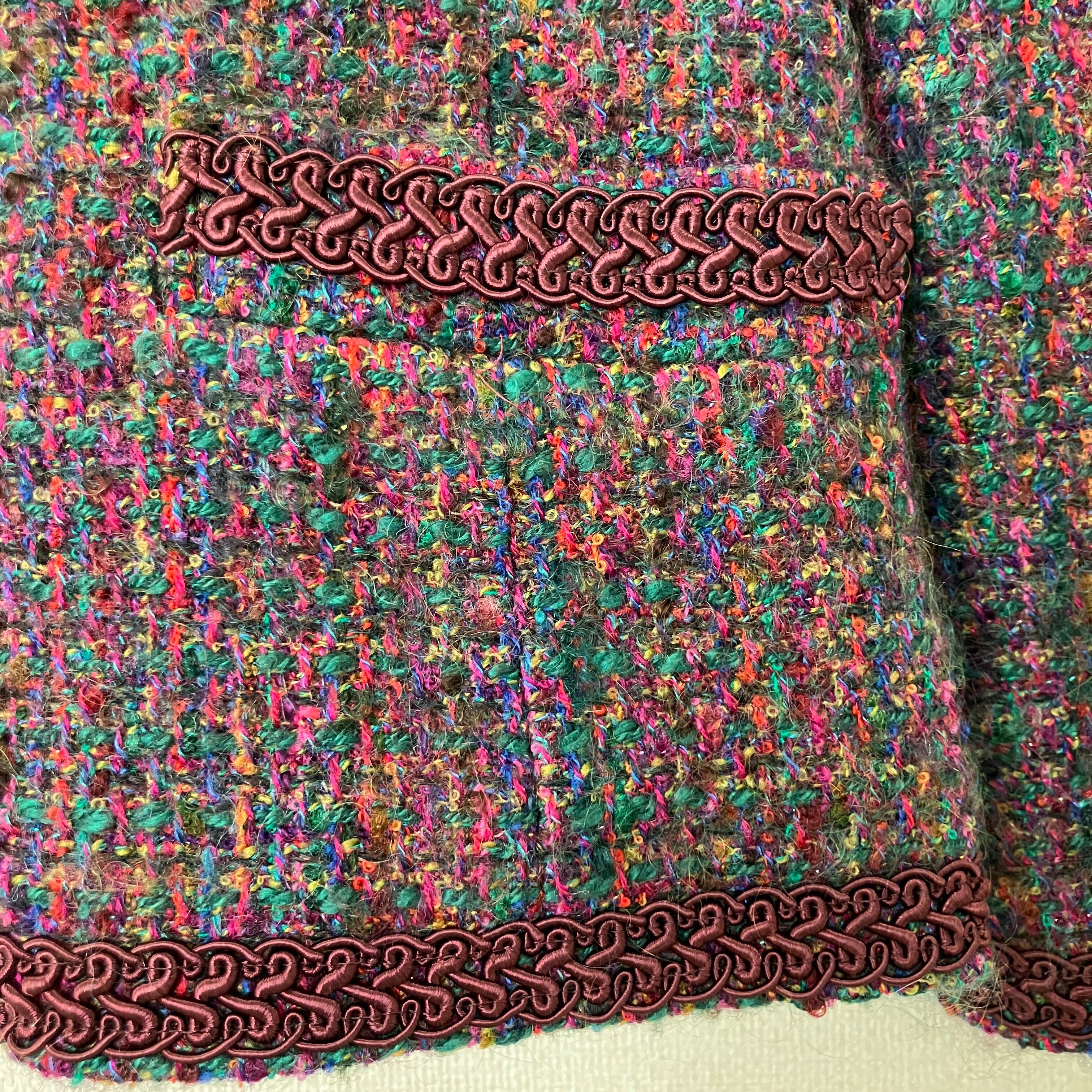 ボルドーを基調に、グリーンやイエローなどの多色使いの糸が織り込まれた華やかなデザインです。