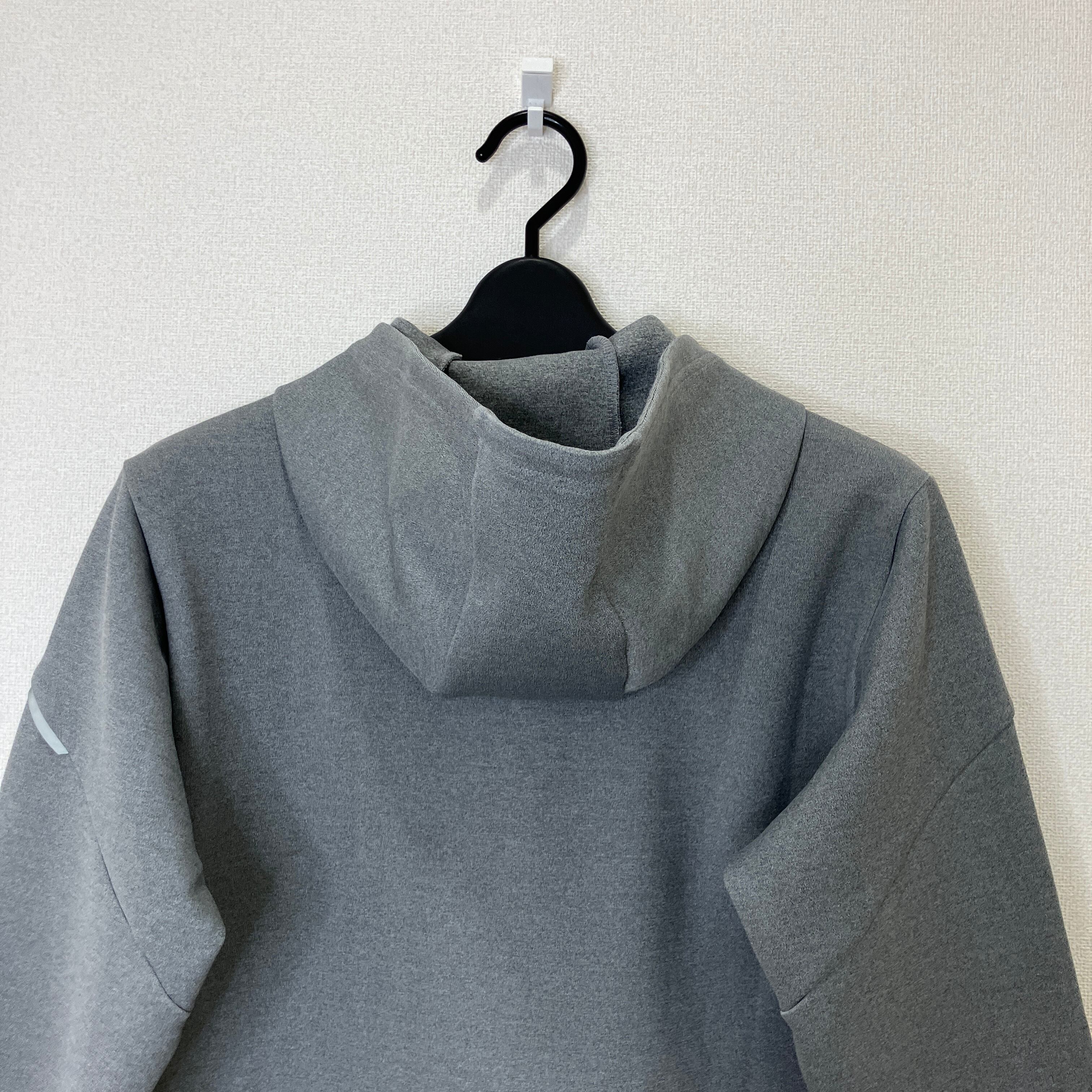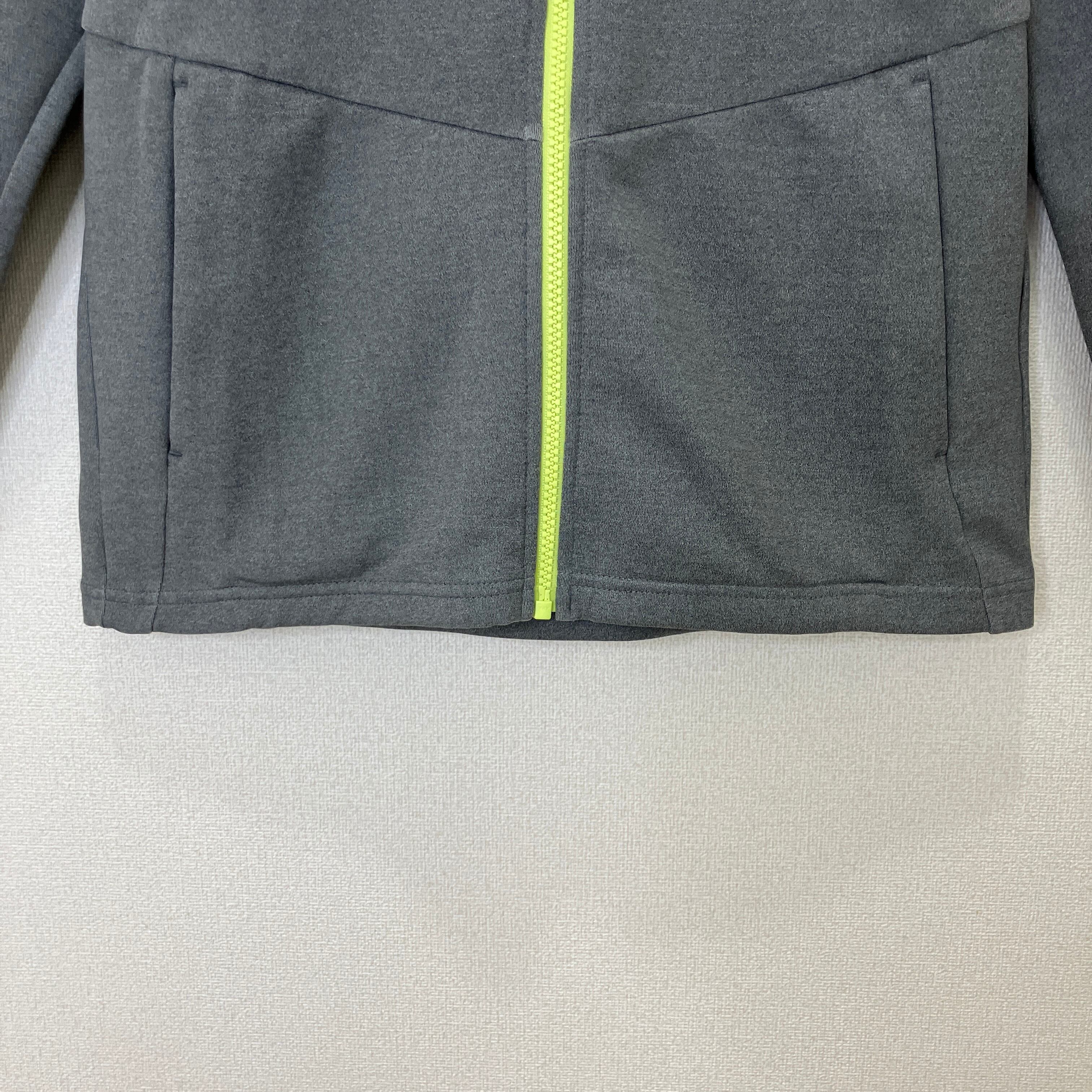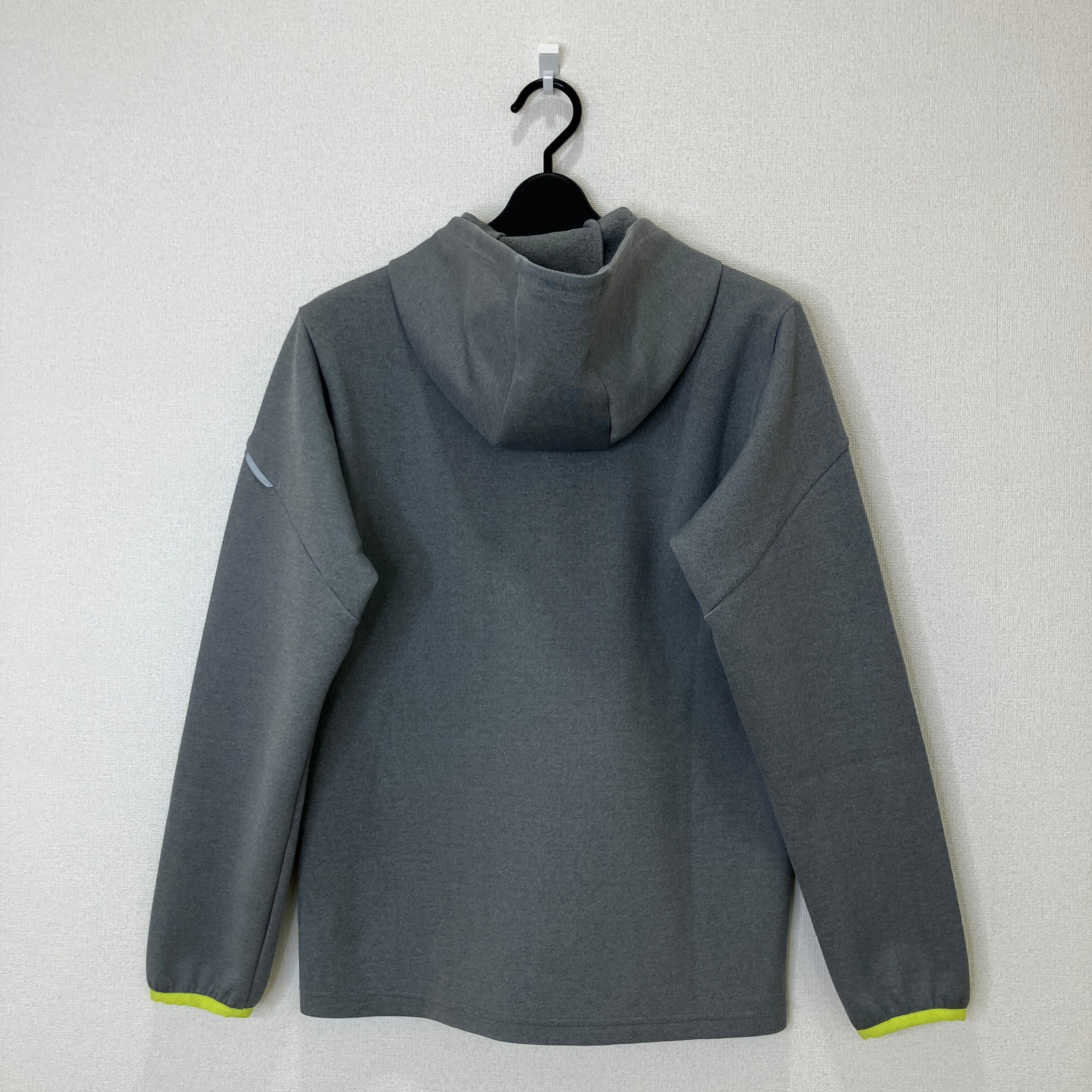 落ち着いたグレーの生地に、ライムイエローのジッパーとロゴが映えるスポーティーなデザインです。