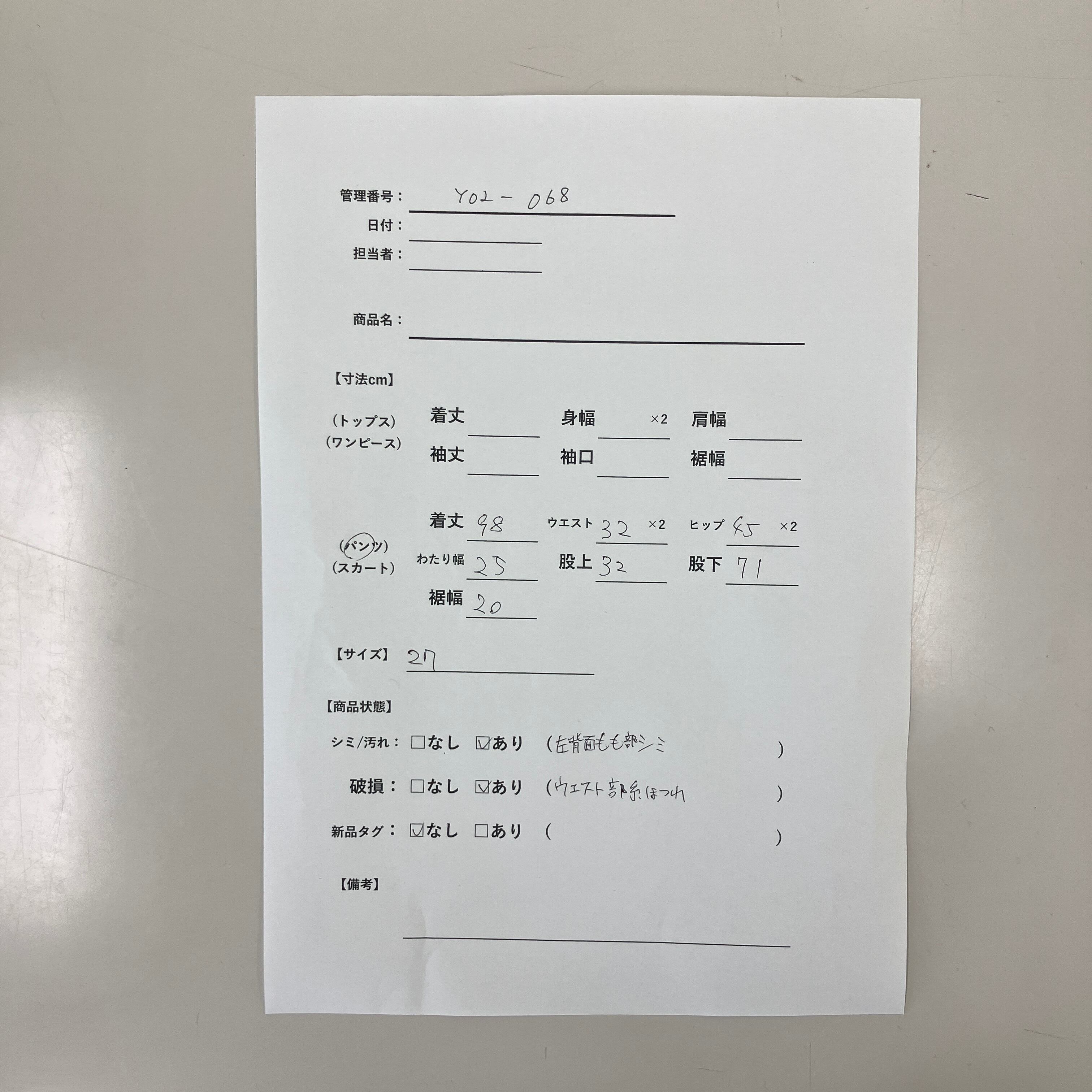 シミ/汚れ: あり(左背面もも部分に薄シミあり)