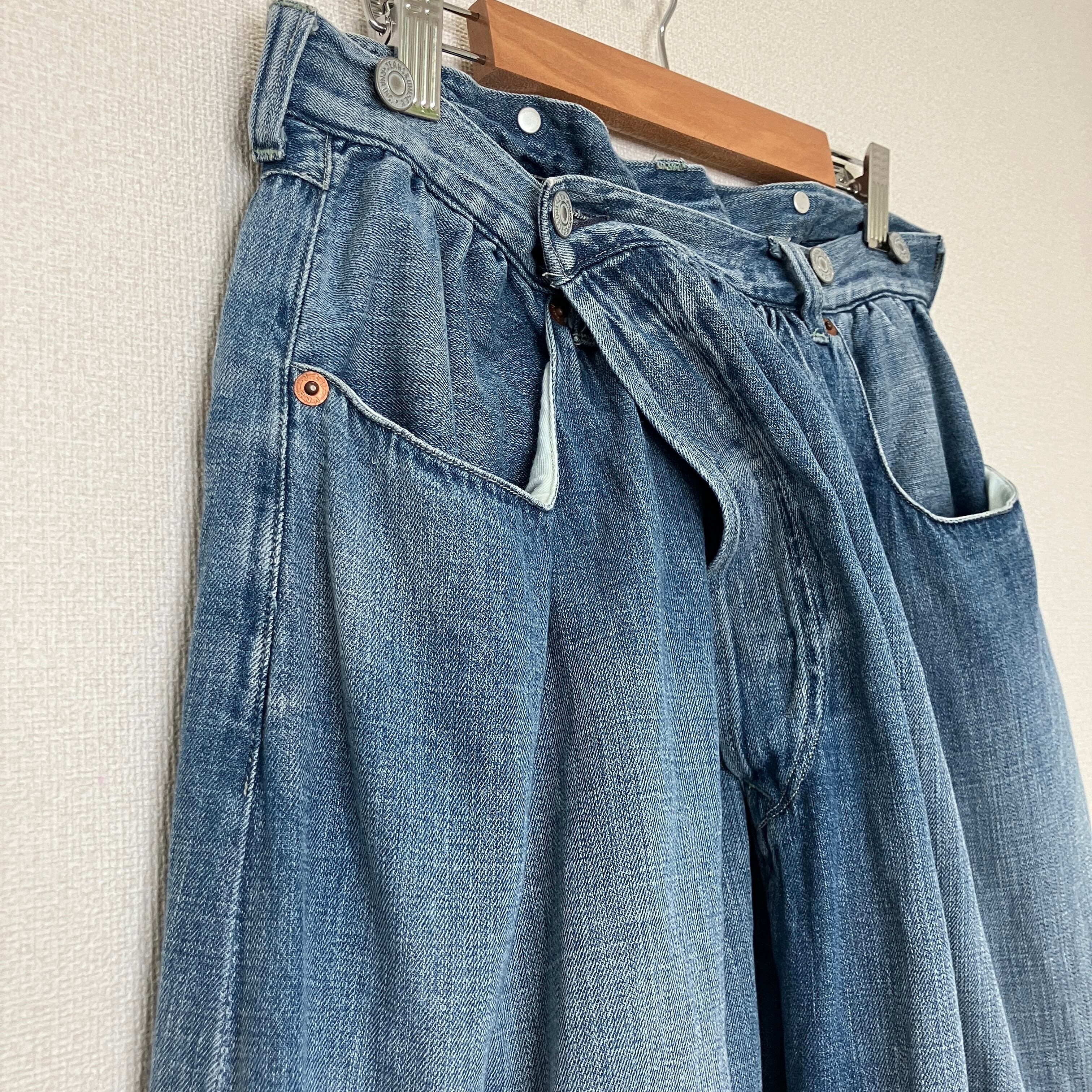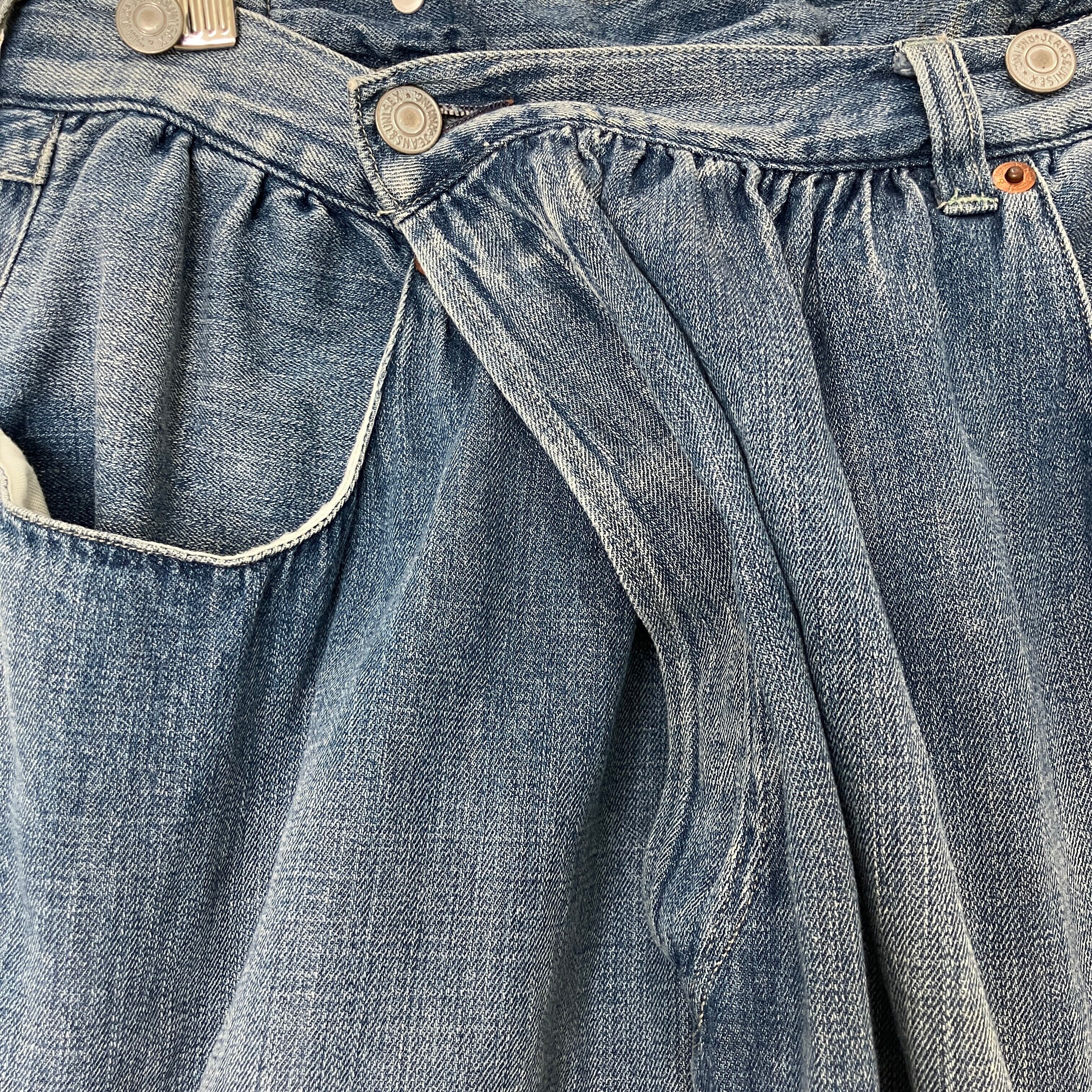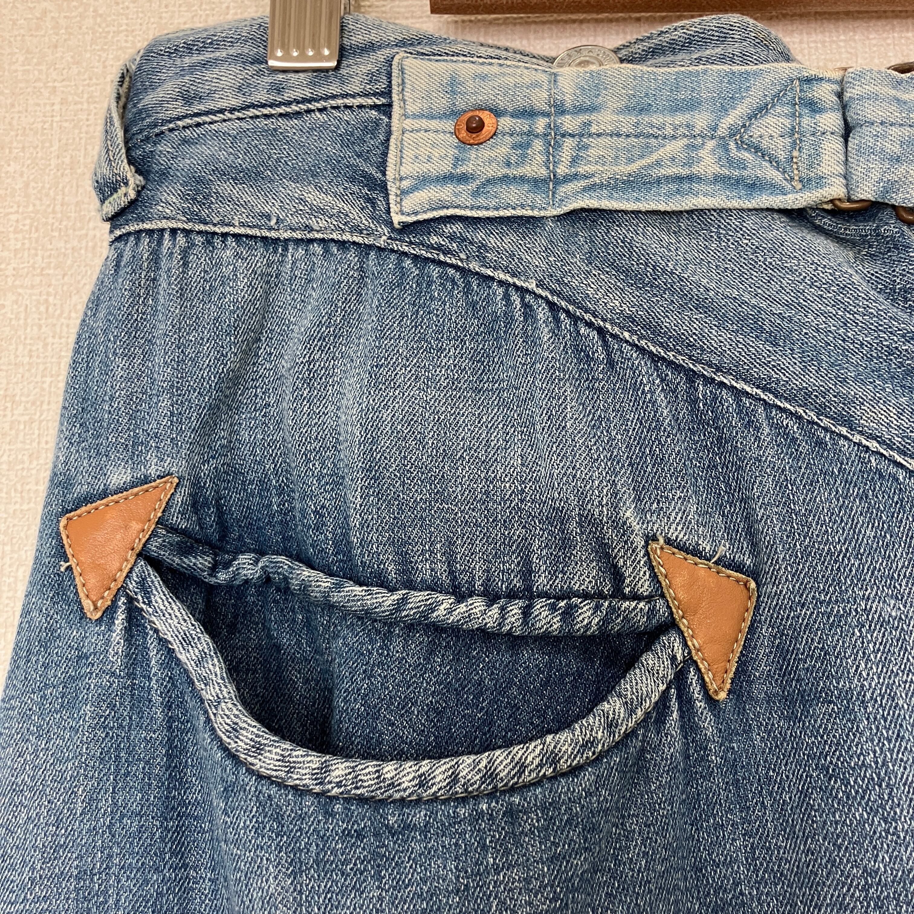 バックポケットのレザーパーツやシンチバック(尾錠)など、ワークウェアのようなディテールが特徴的です。