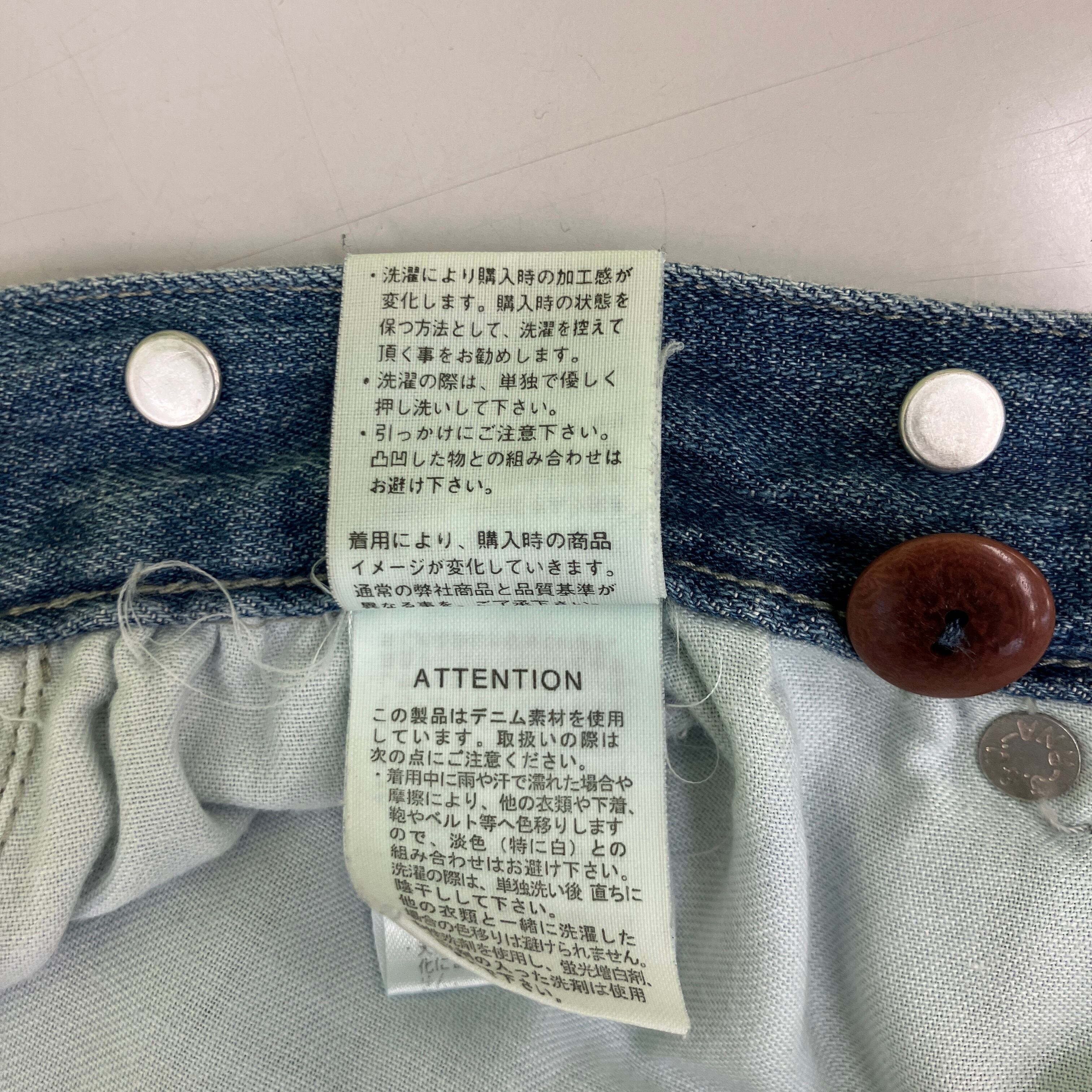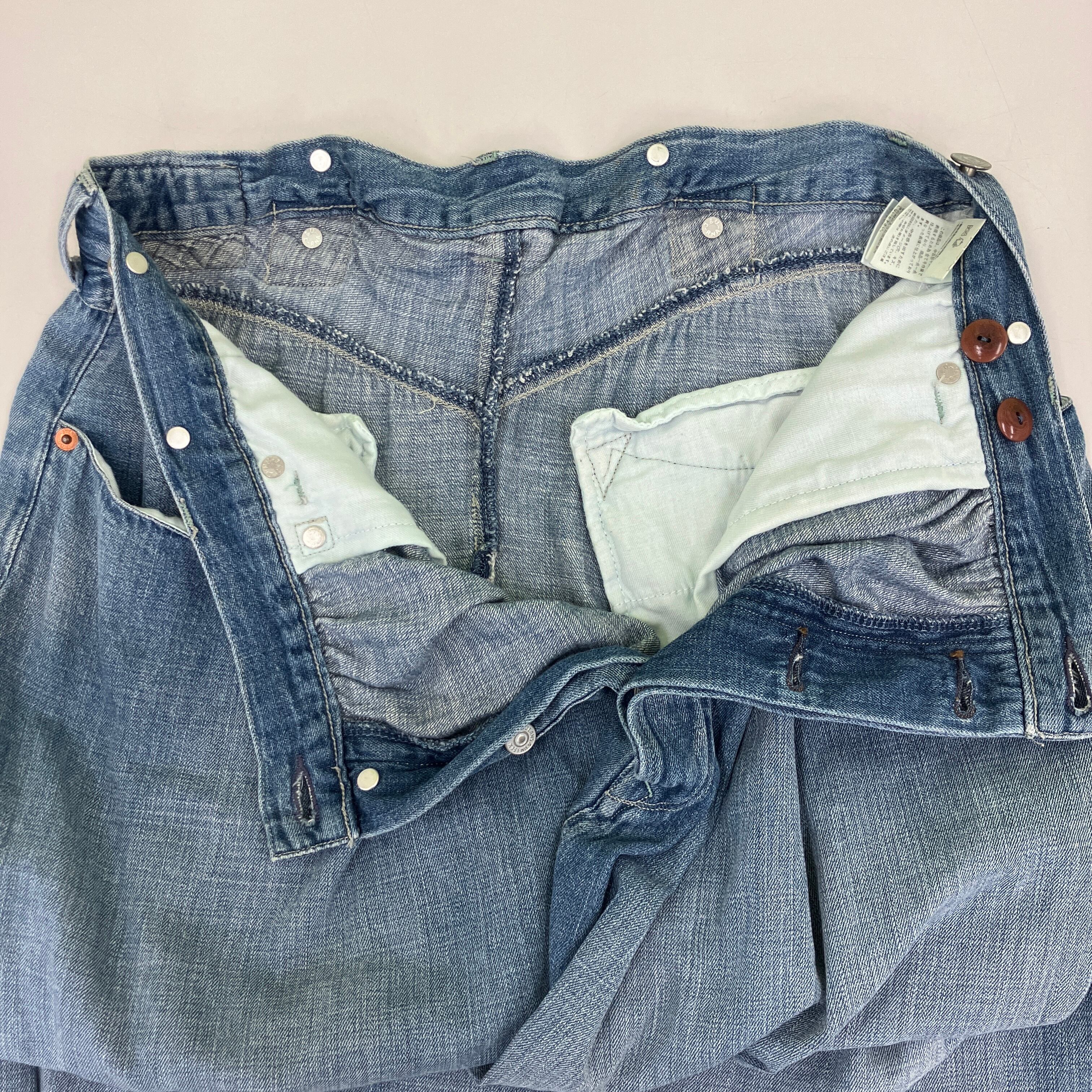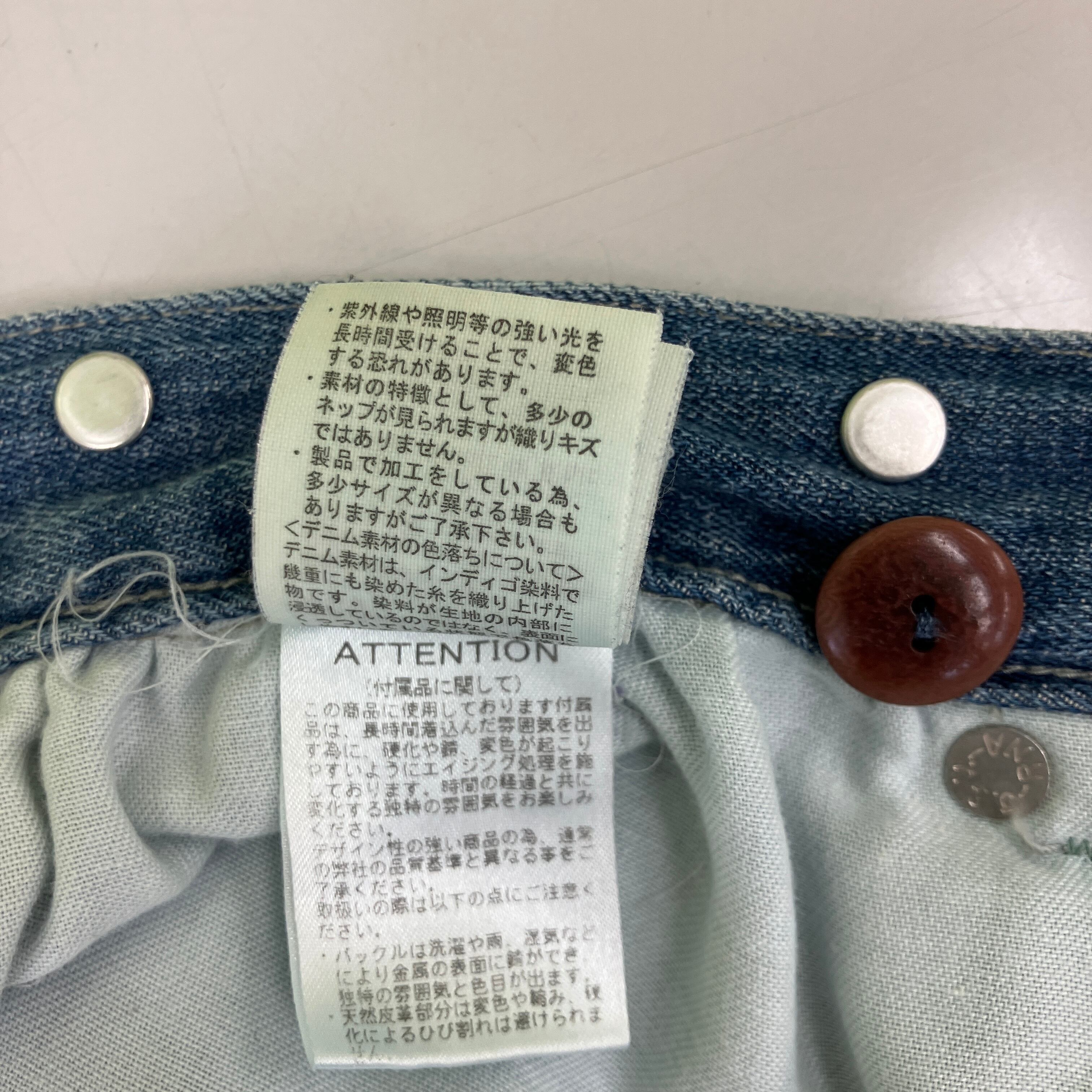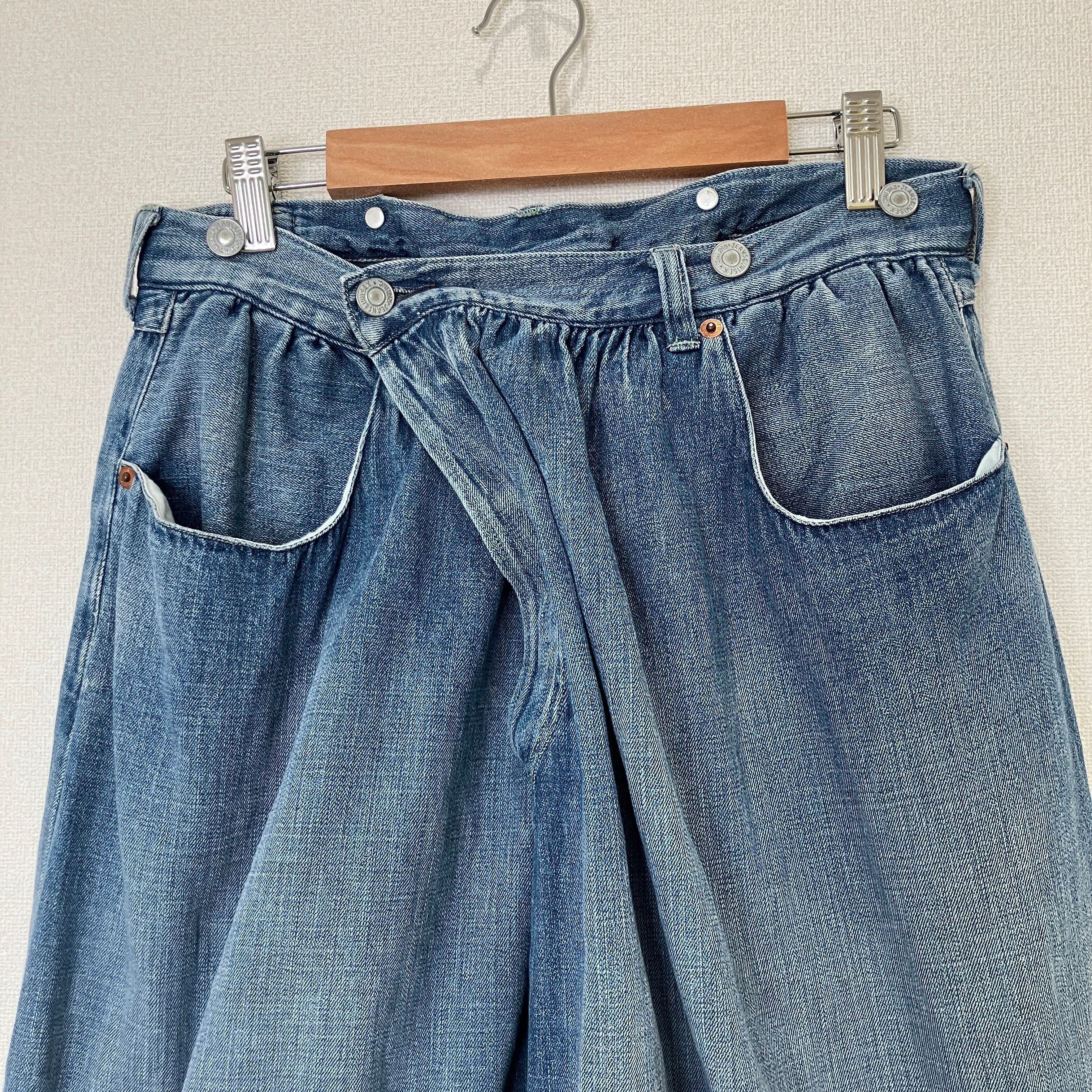 バックポケットのレザーパーツやシンチバック(尾錠)など、ワークウェアのようなディテールが特徴的です。