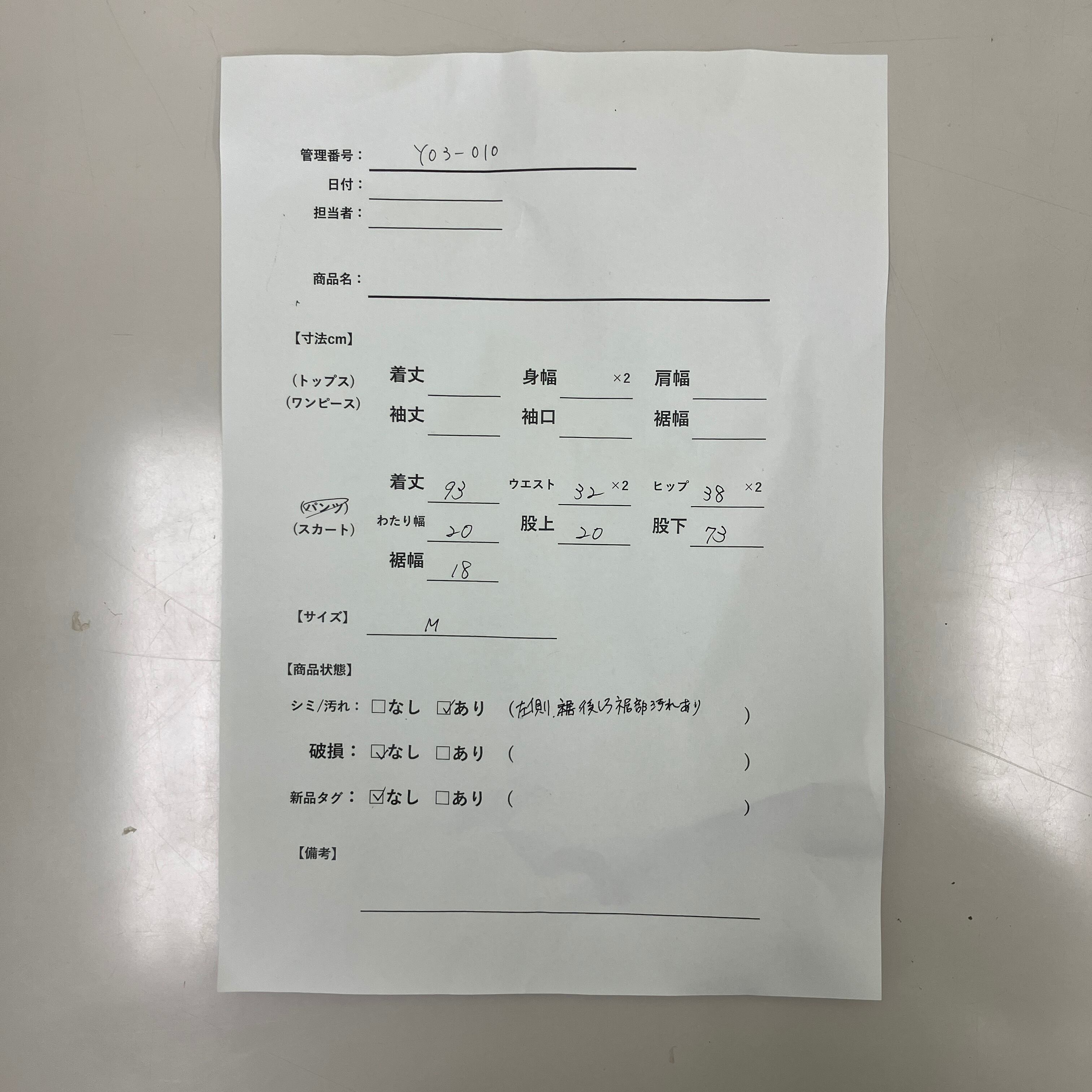 シミ/汚れ: あり(左側、後ろ裾部汚れあり)