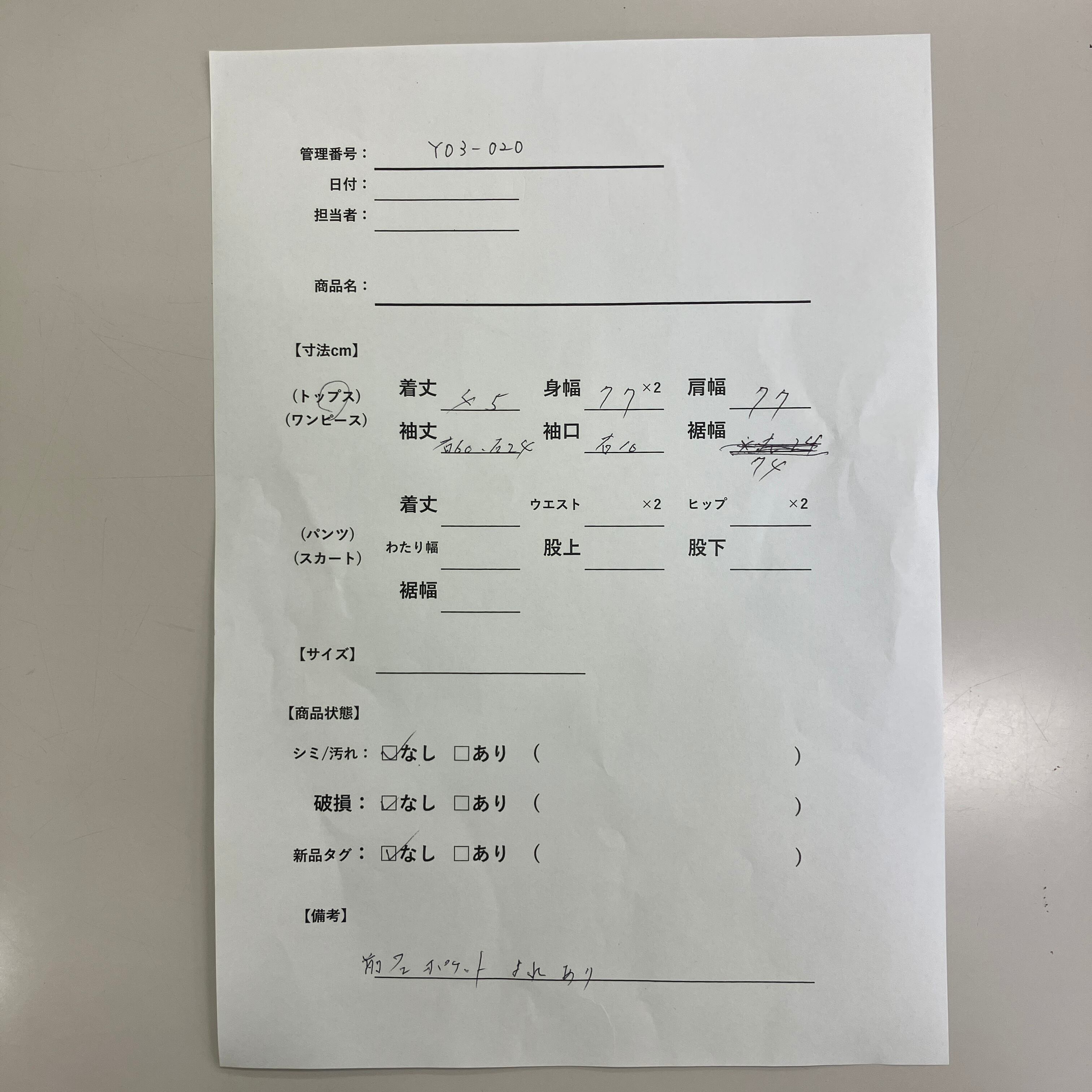 管理番号:Y03-020 #てまいらずアパレル商品一覧