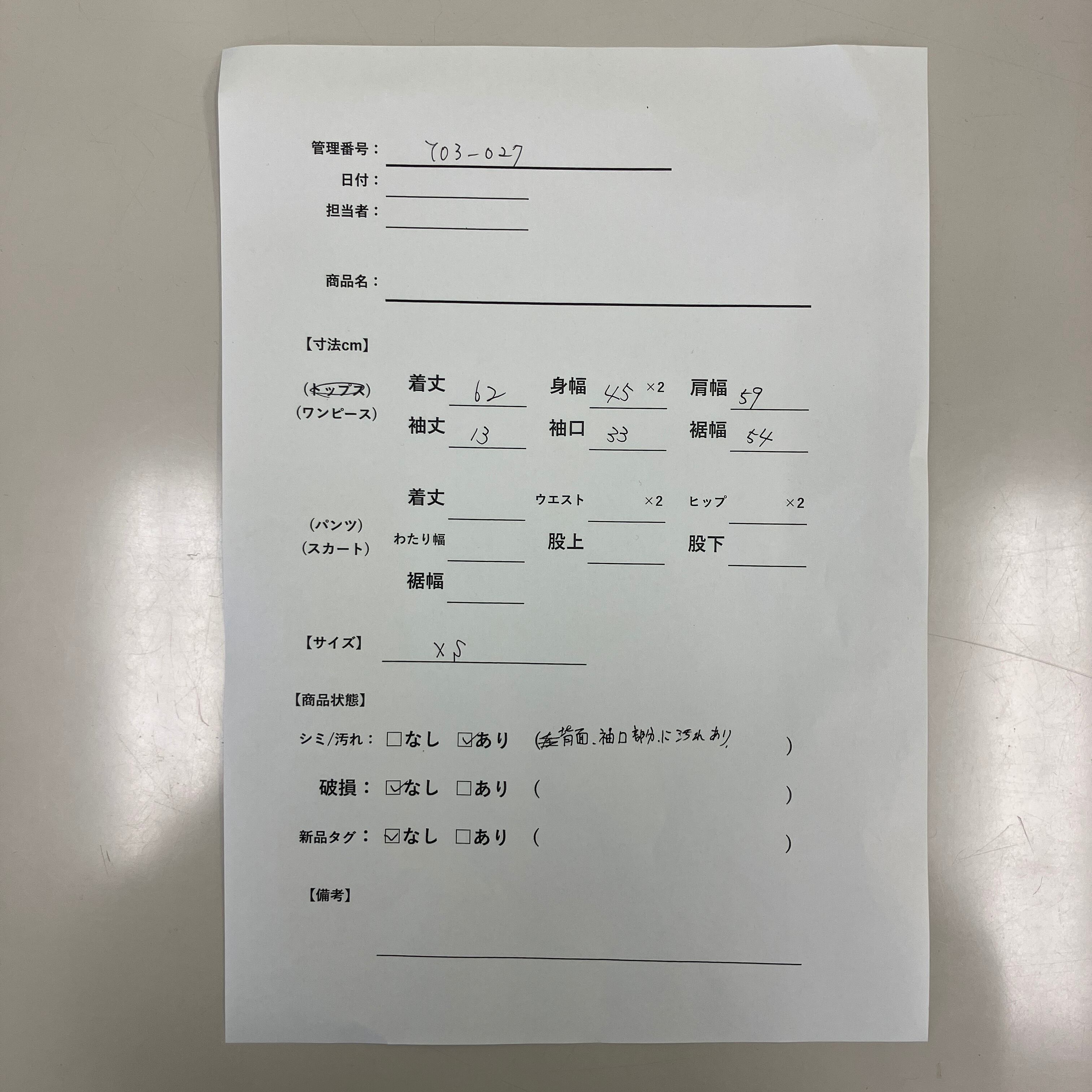 シミ/汚れ: あり(背面、袖口部分に汚れあり)