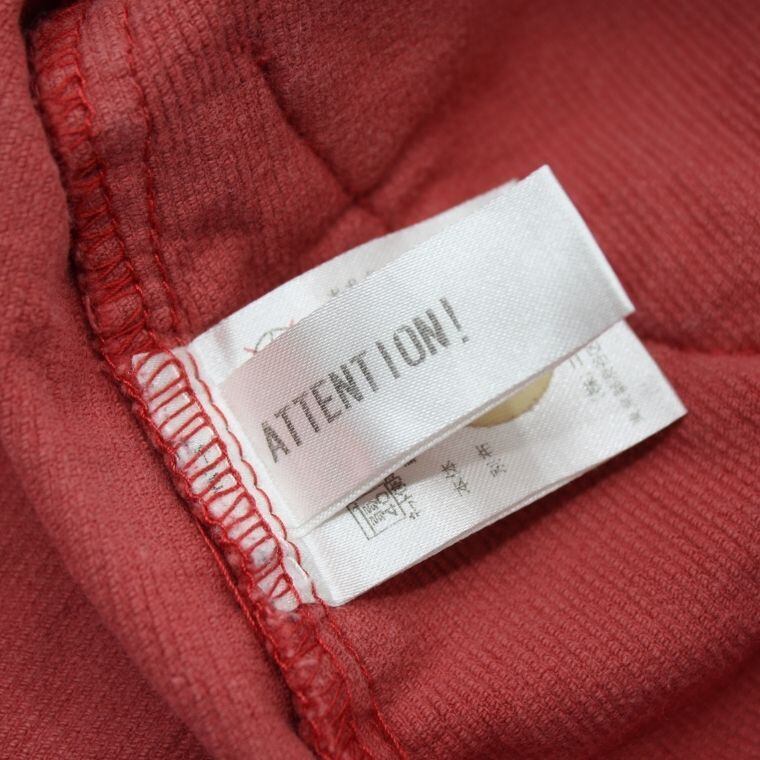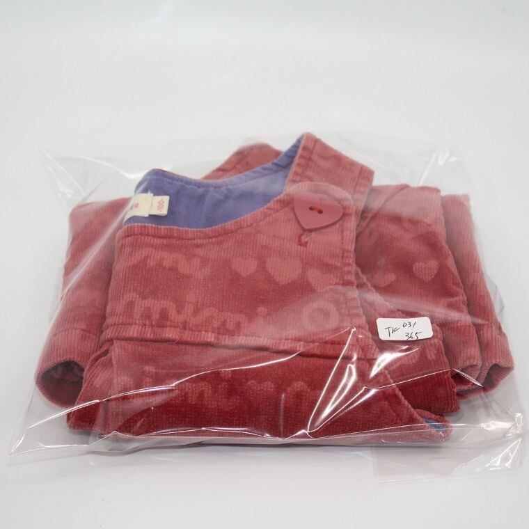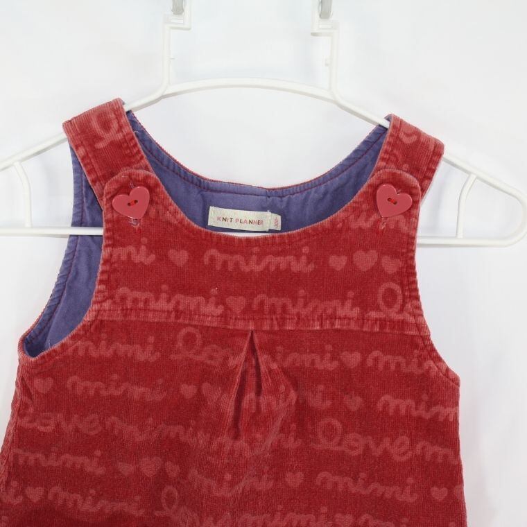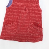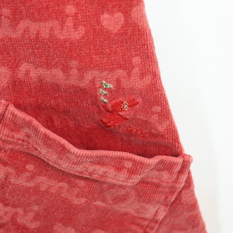赤色のコーデュロイ生地にハートやロゴ柄が入った可愛らしいデザインで、肩部分のハートボタンがアクセントになっています。