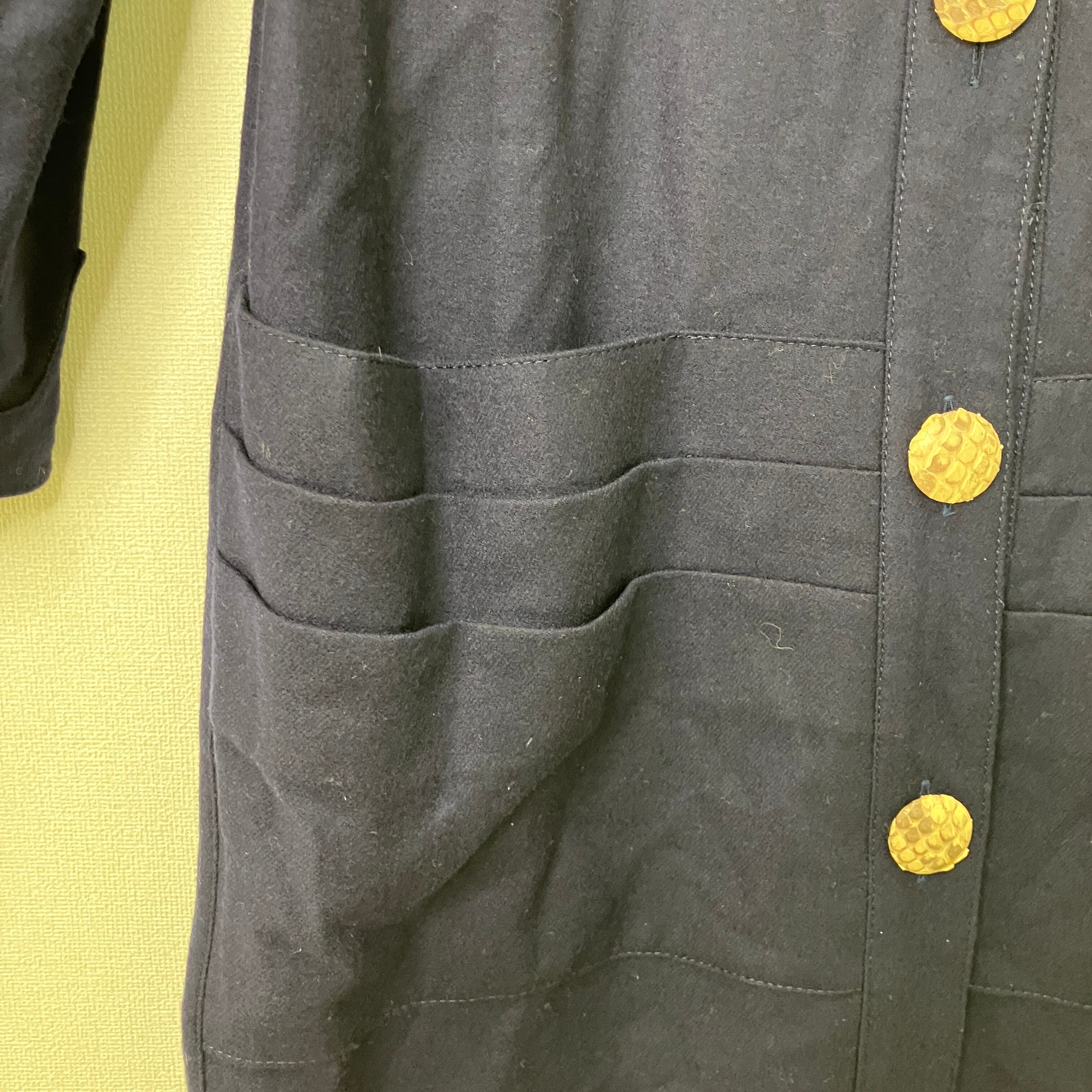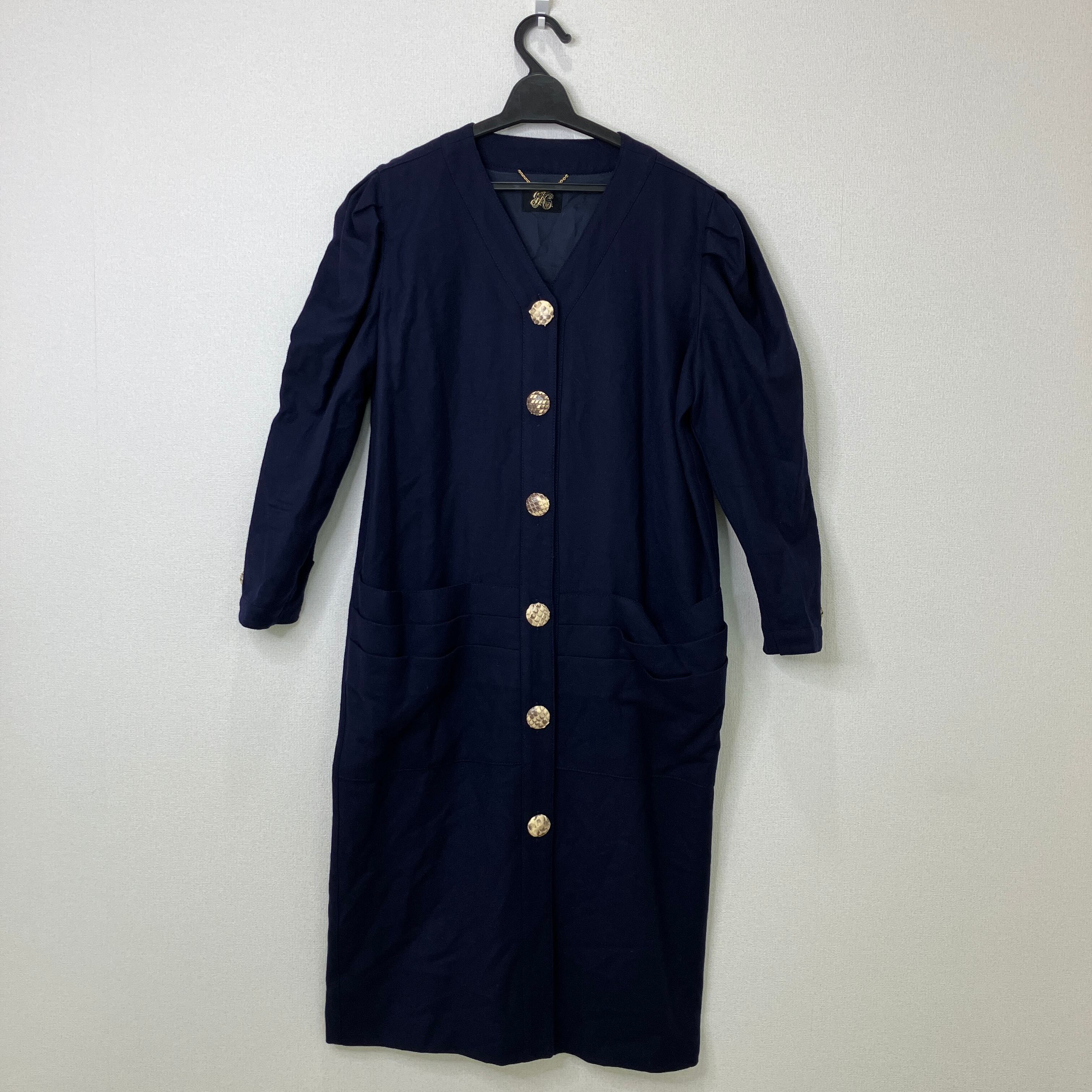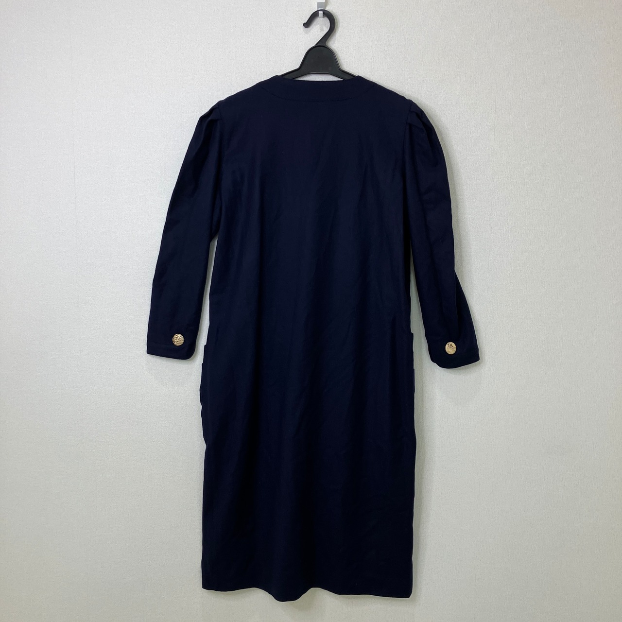 深みのあるネイビーにゴールドのボタンが映える、レリアンのロングワンピースです。