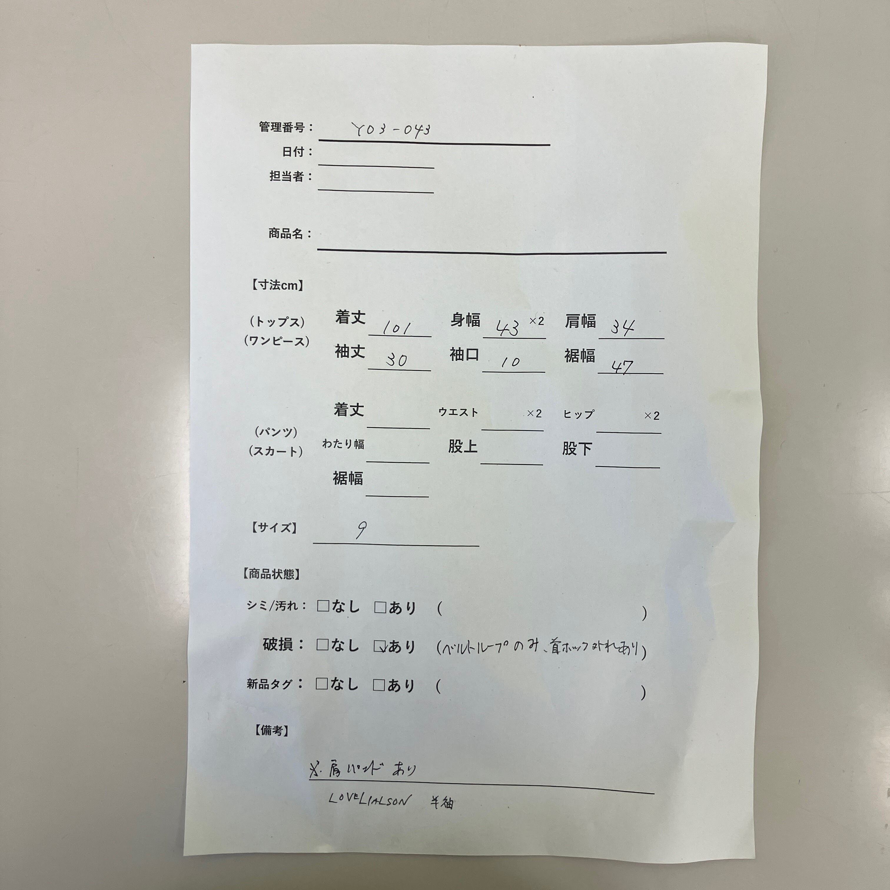 管理番号:Y03-043 #てまいらずアパレル商品一覧