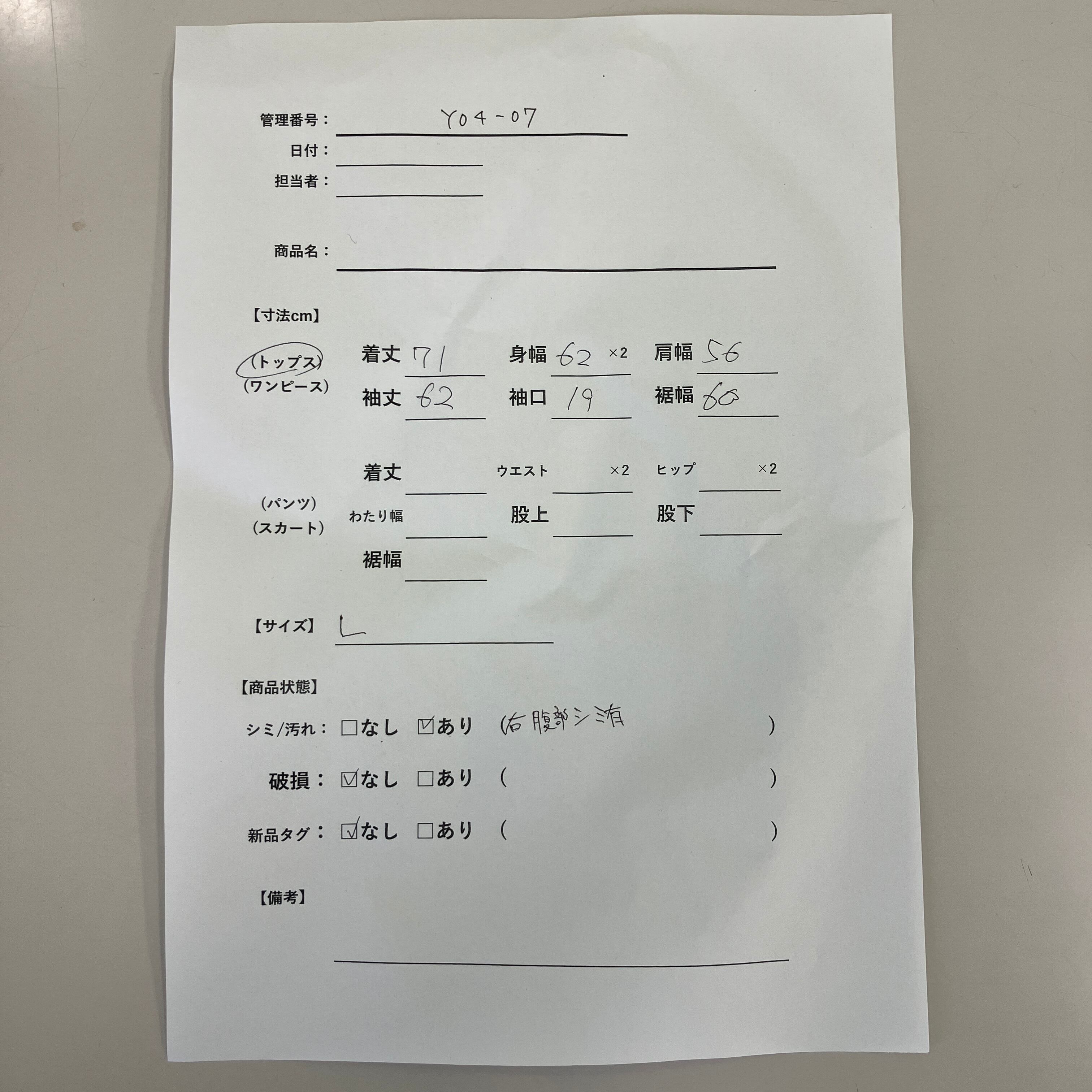 管理番号:Y04-007 #てまいらずアパレル商品一覧