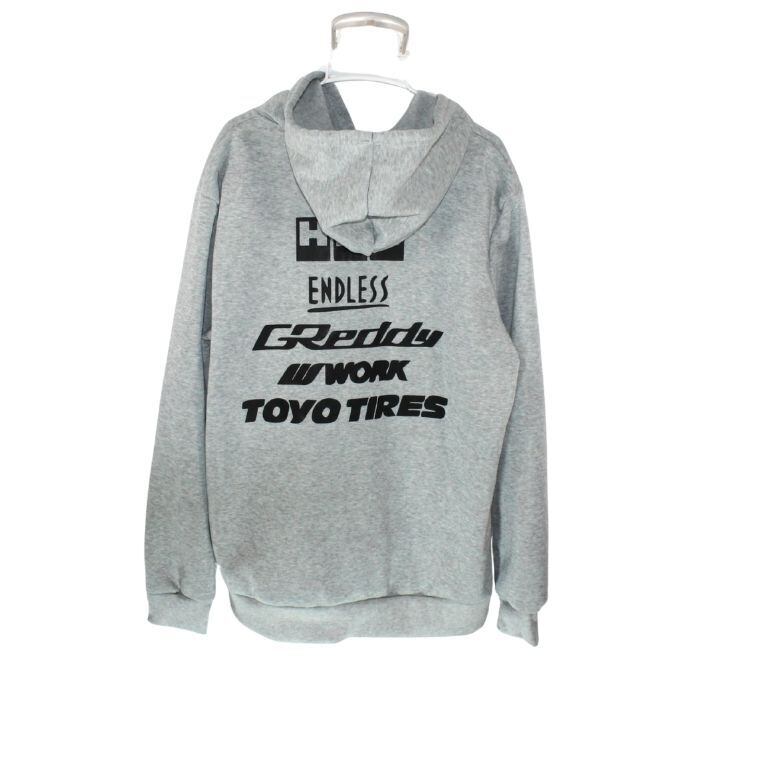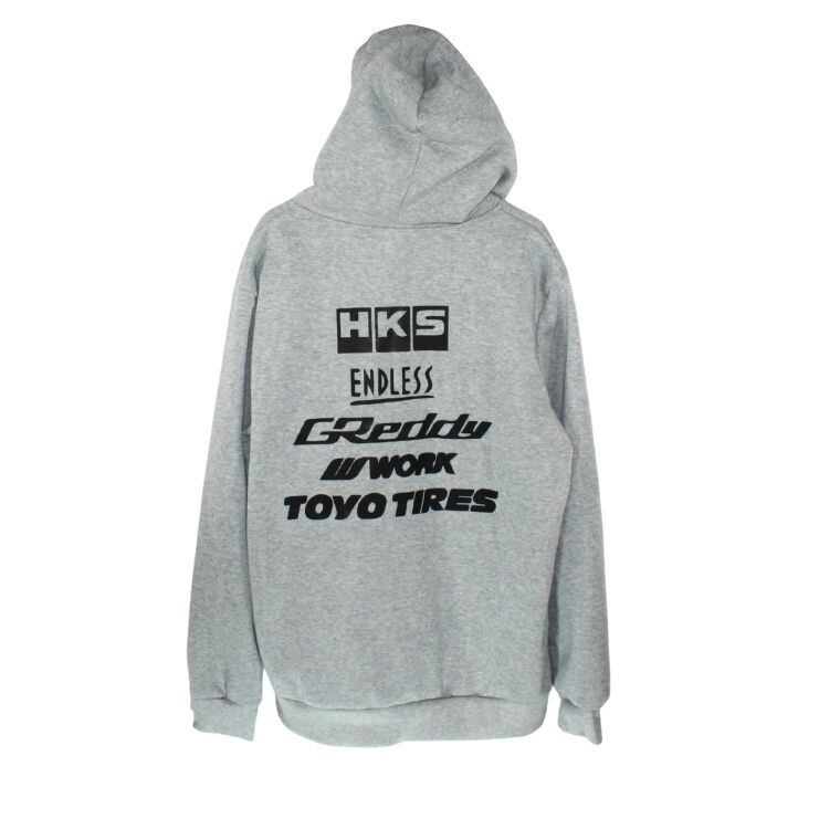 フロントにHKSロゴ、バックにはENDLESS・GReddy・WORK・TOYO TIRESなどのロゴがプリントされたインパクトのあるパーカーです。