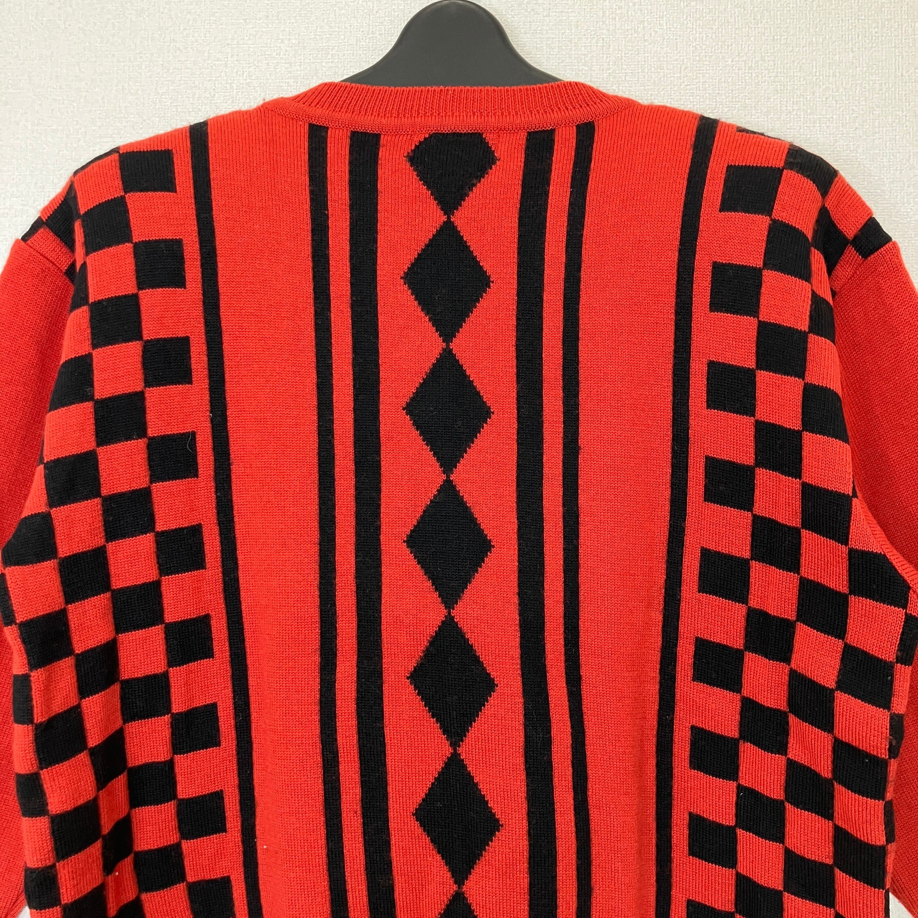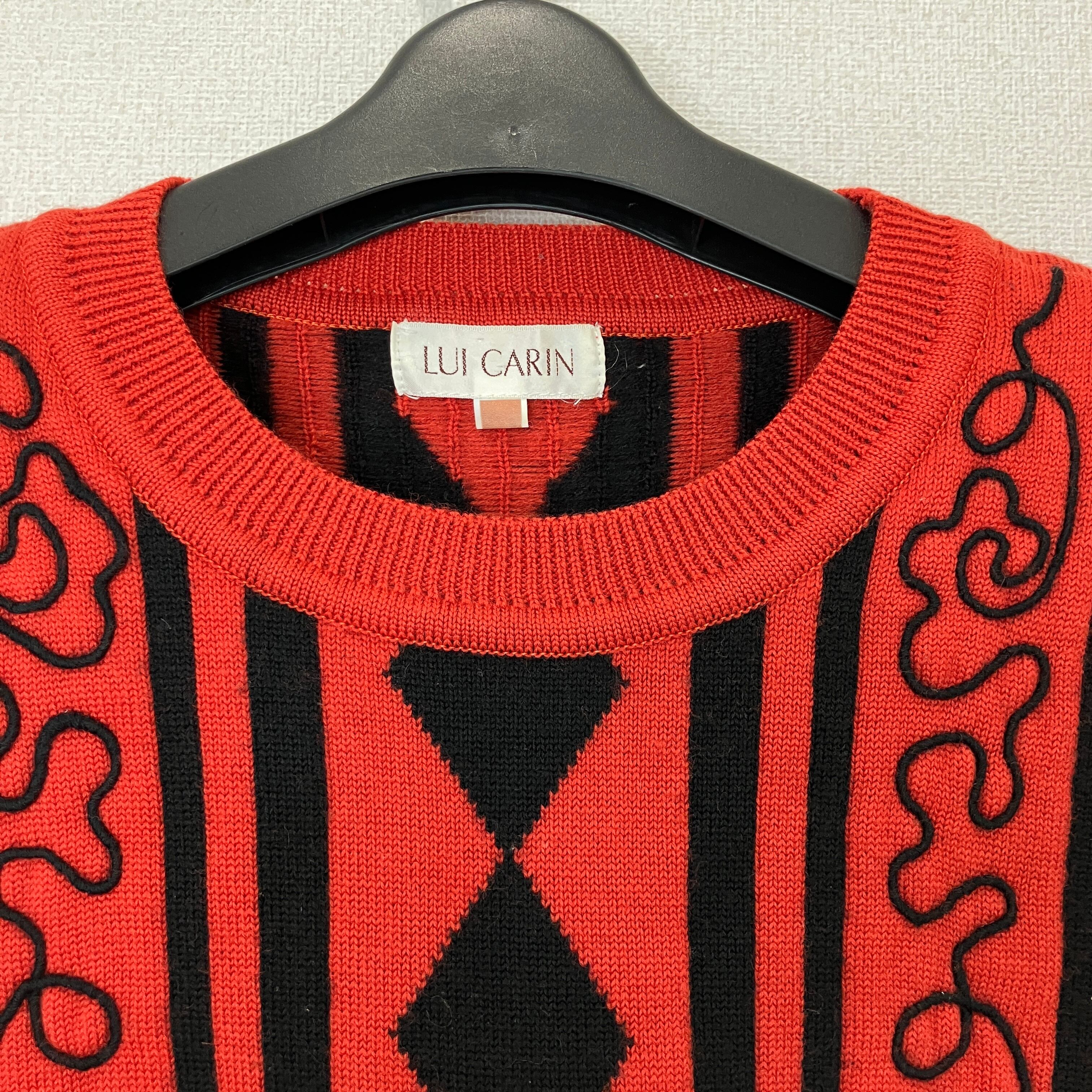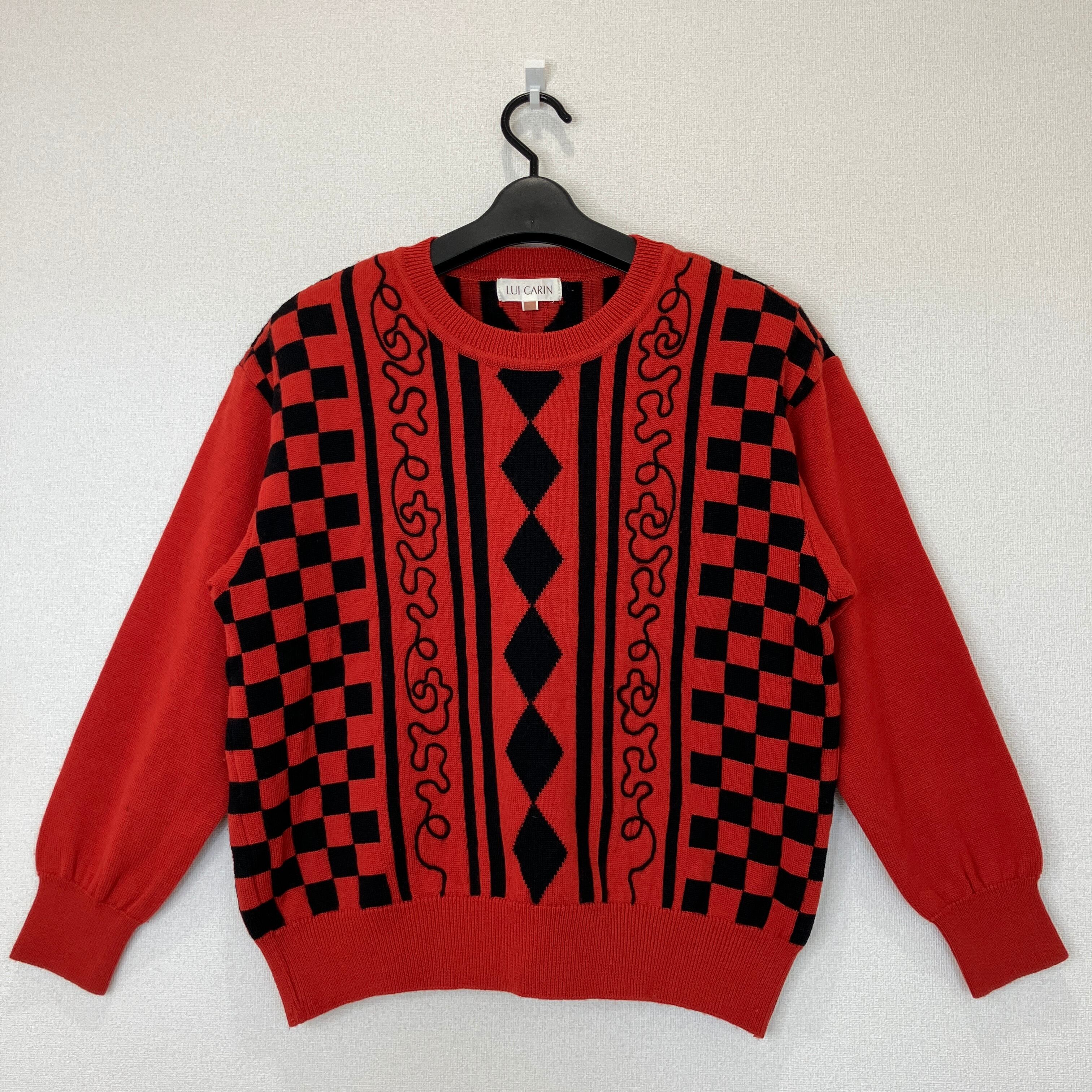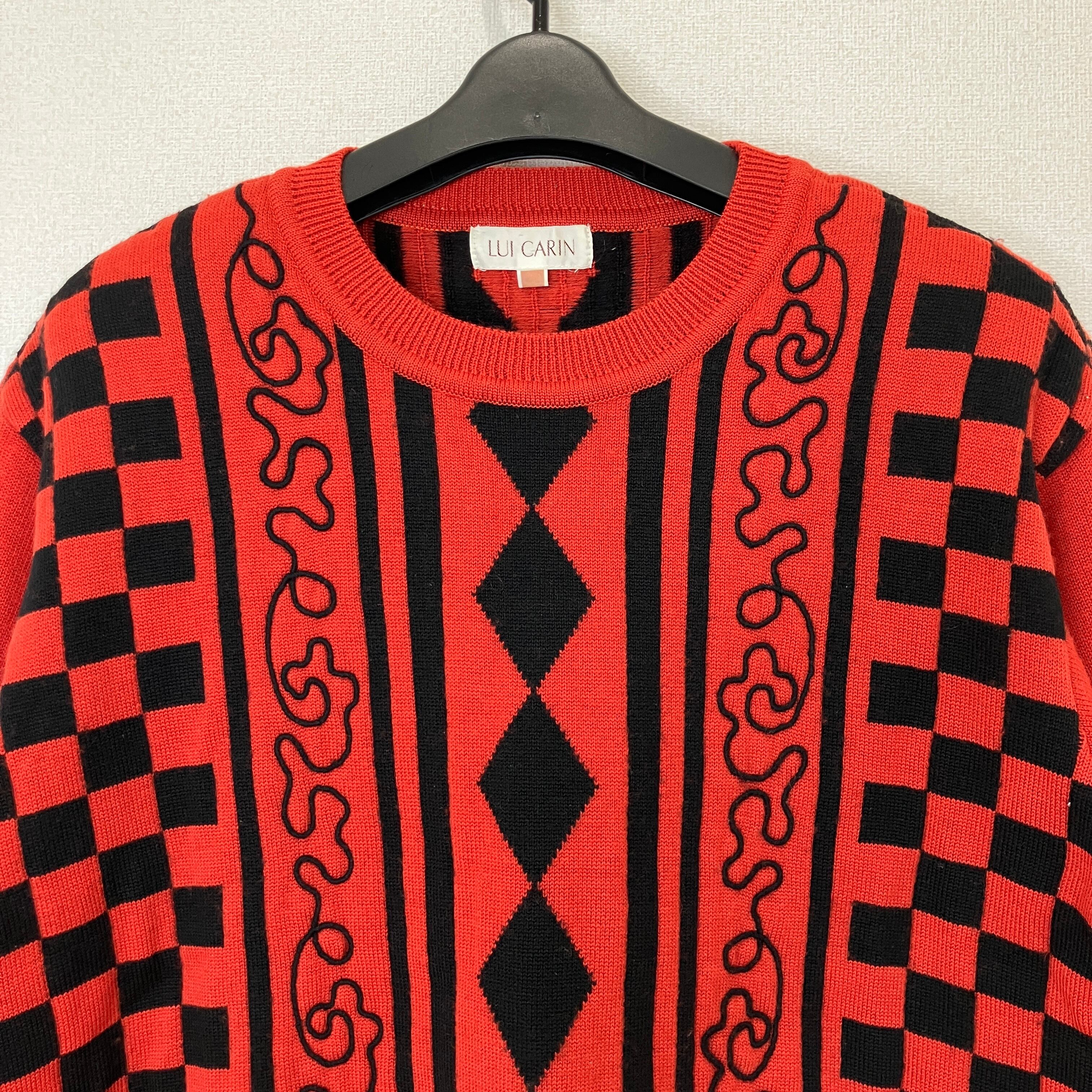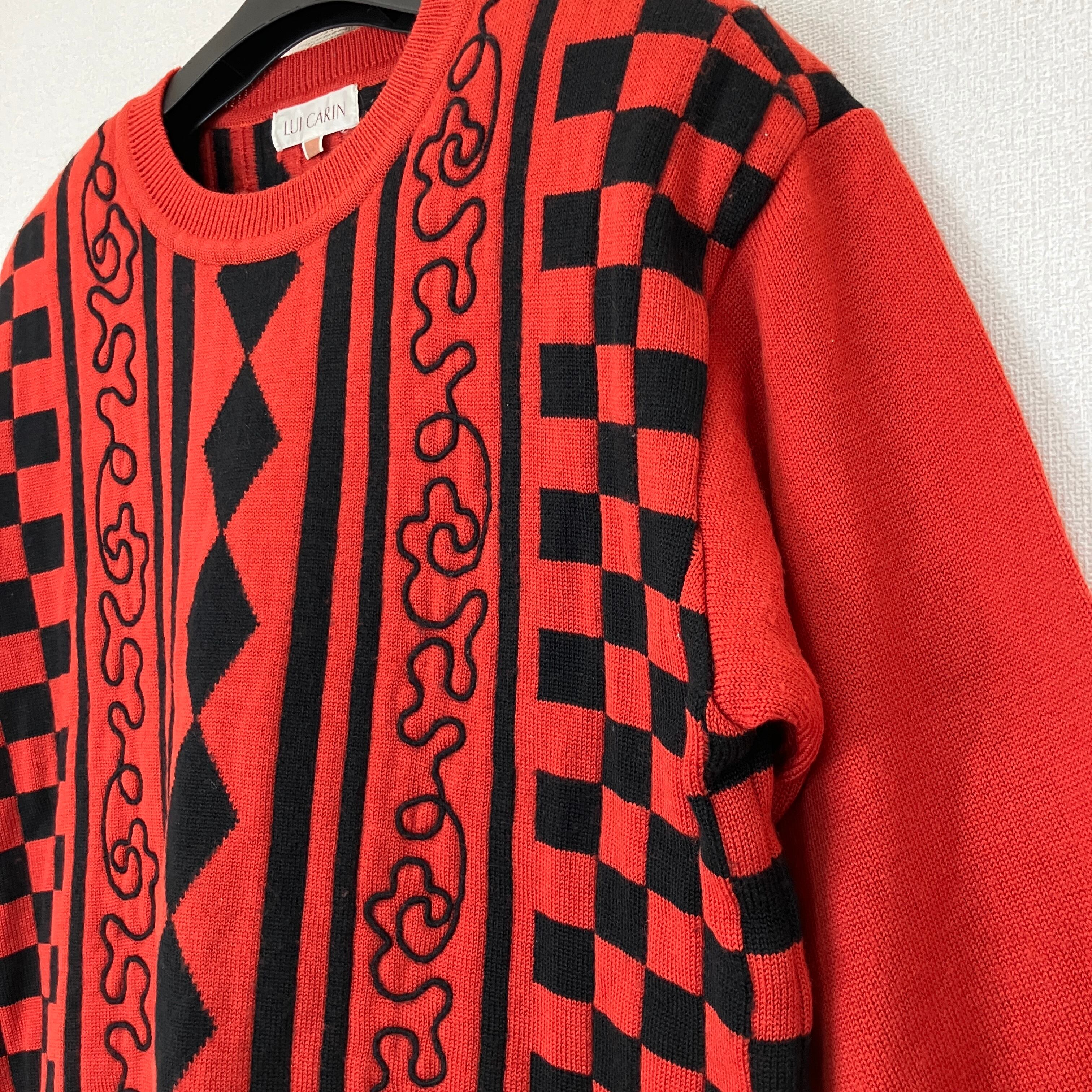 LUI CARIN(ルイ・カラン)幾何学柄ニット セーター ウール100% レッド ブラック レトロ