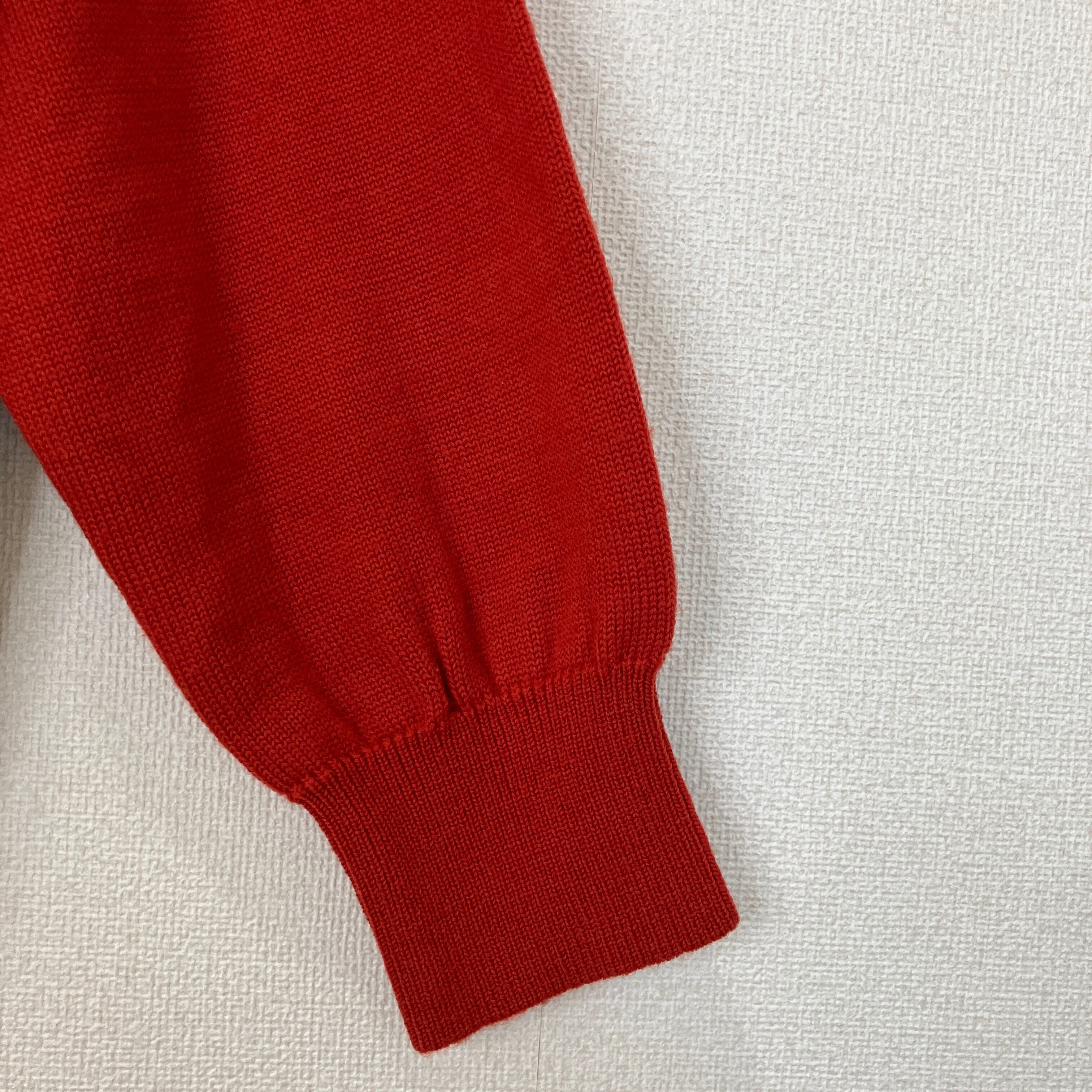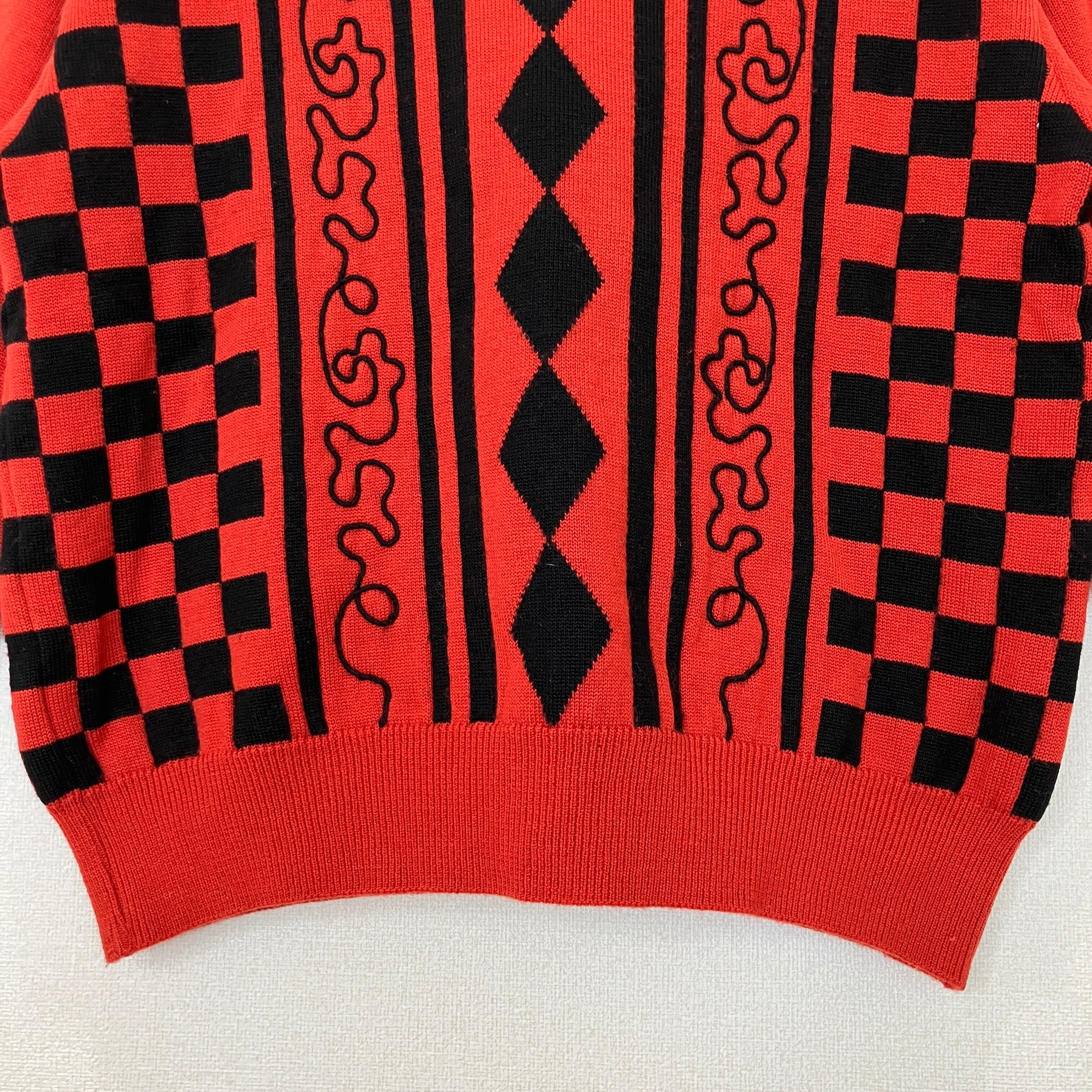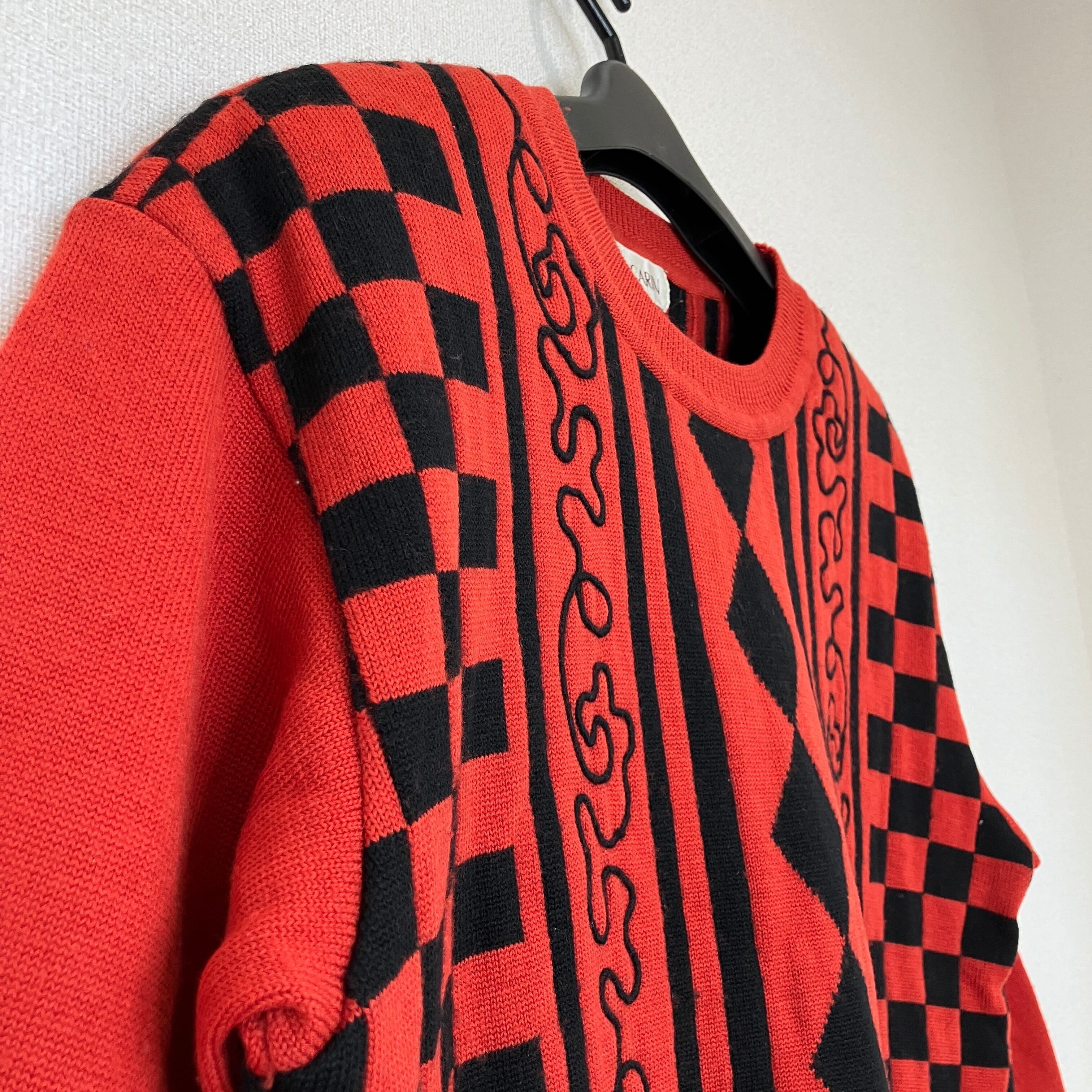 鮮やかなレッドとブラックのコントラストが目を引く、レトロな雰囲気漂う幾何学柄のニットです。