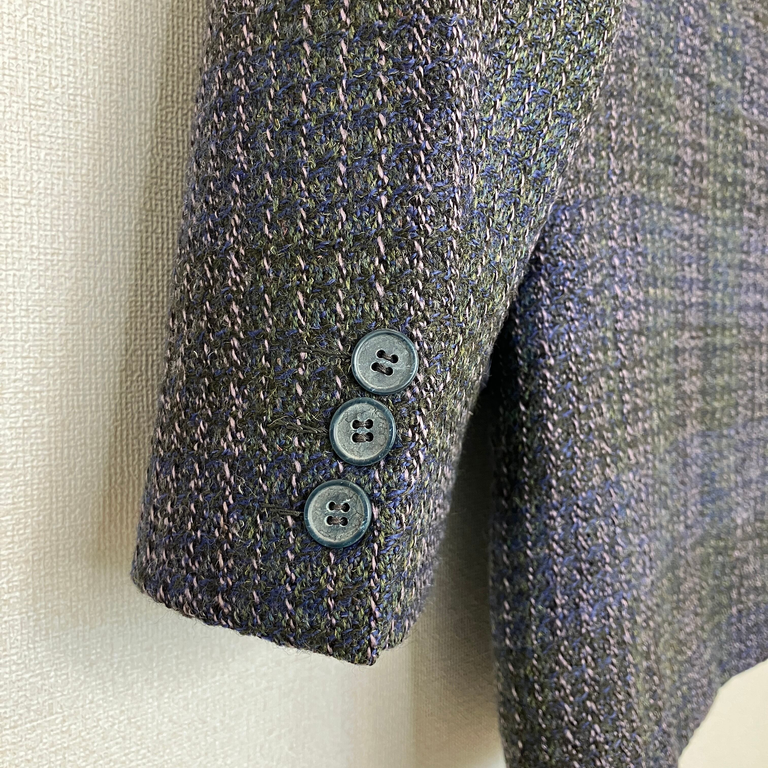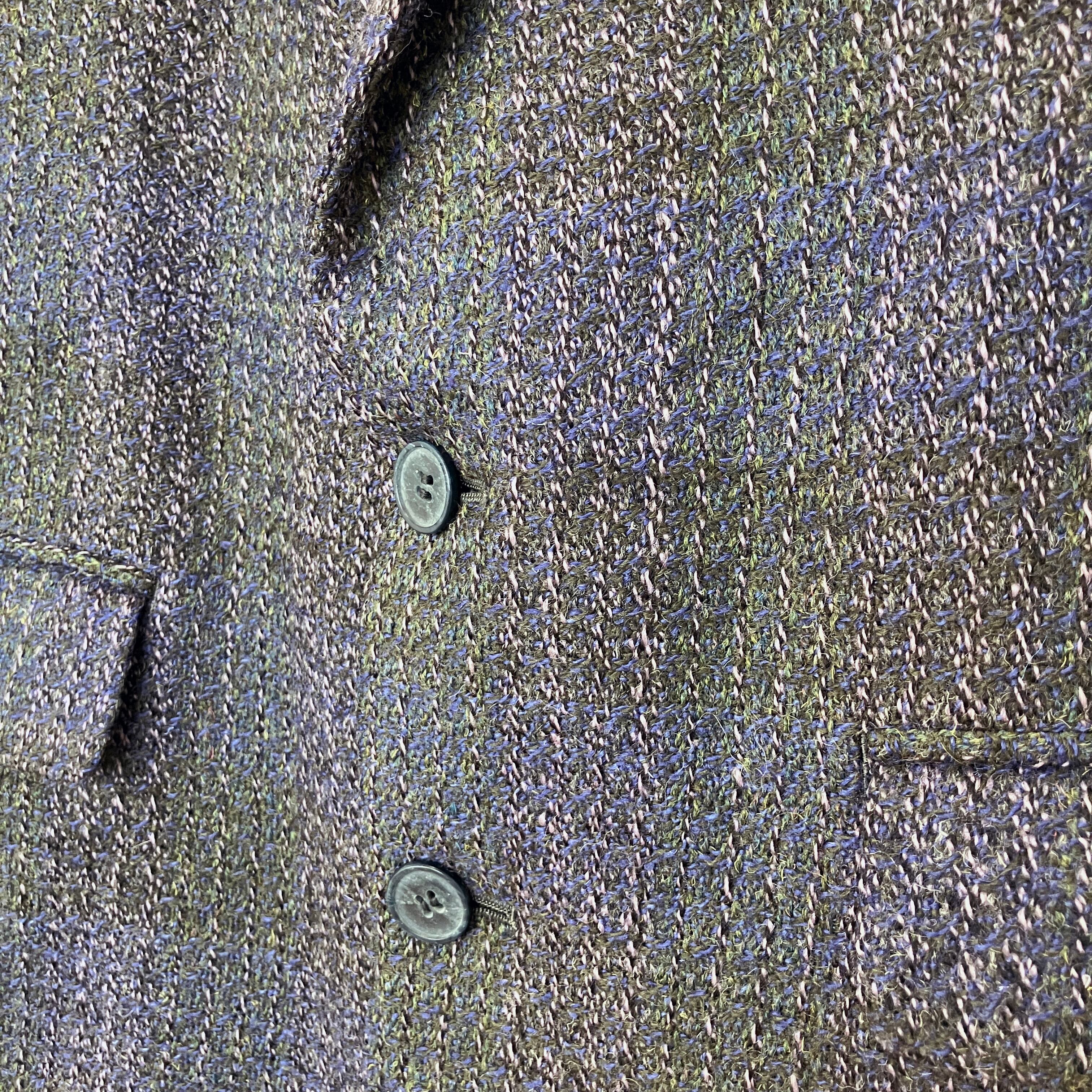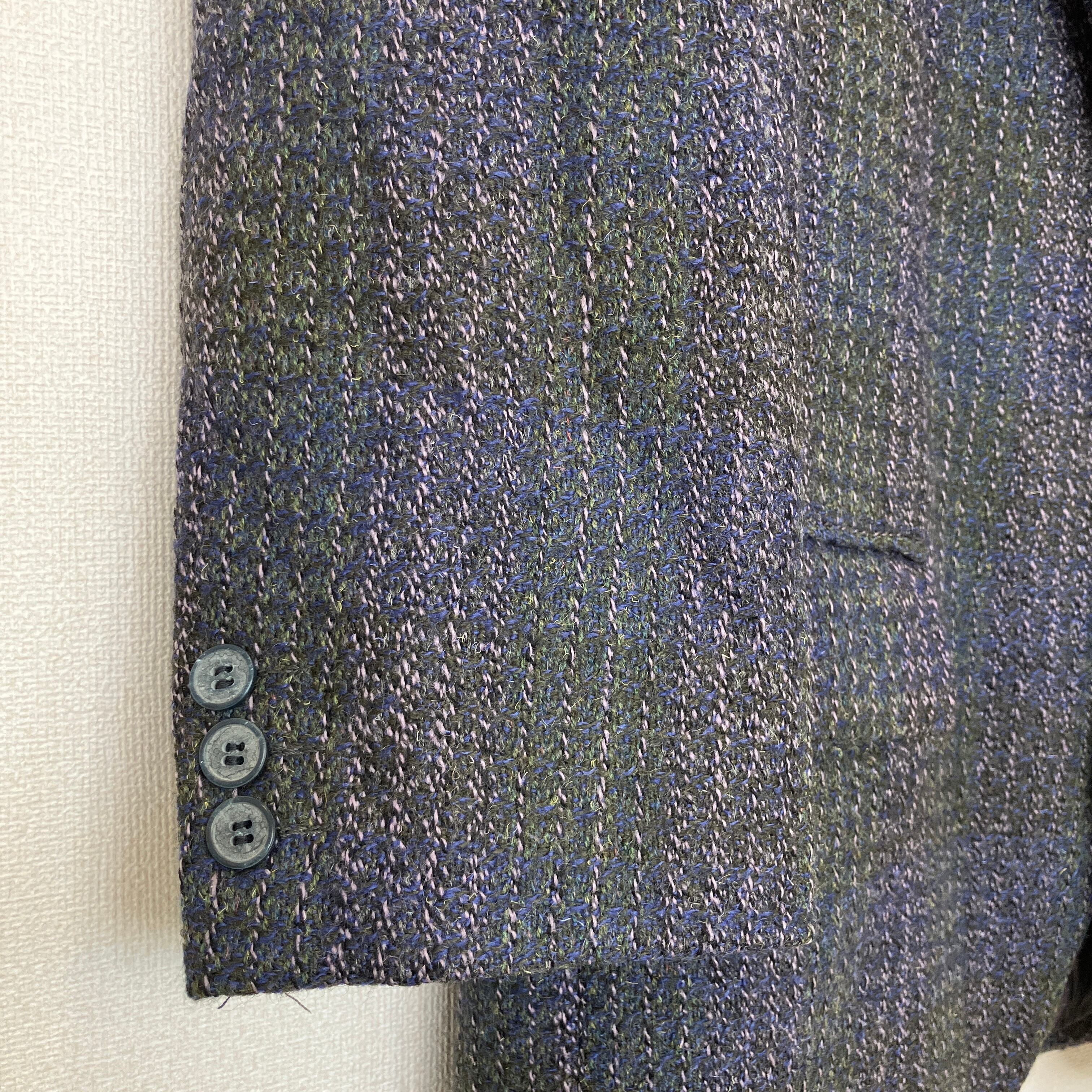 落ち着いたパープルやグリーン、ネイビーが混ざり合った奥行きのある配色が特徴的な、CHRISTIAN AUJARD HOMMEのテーラードジャケットです。