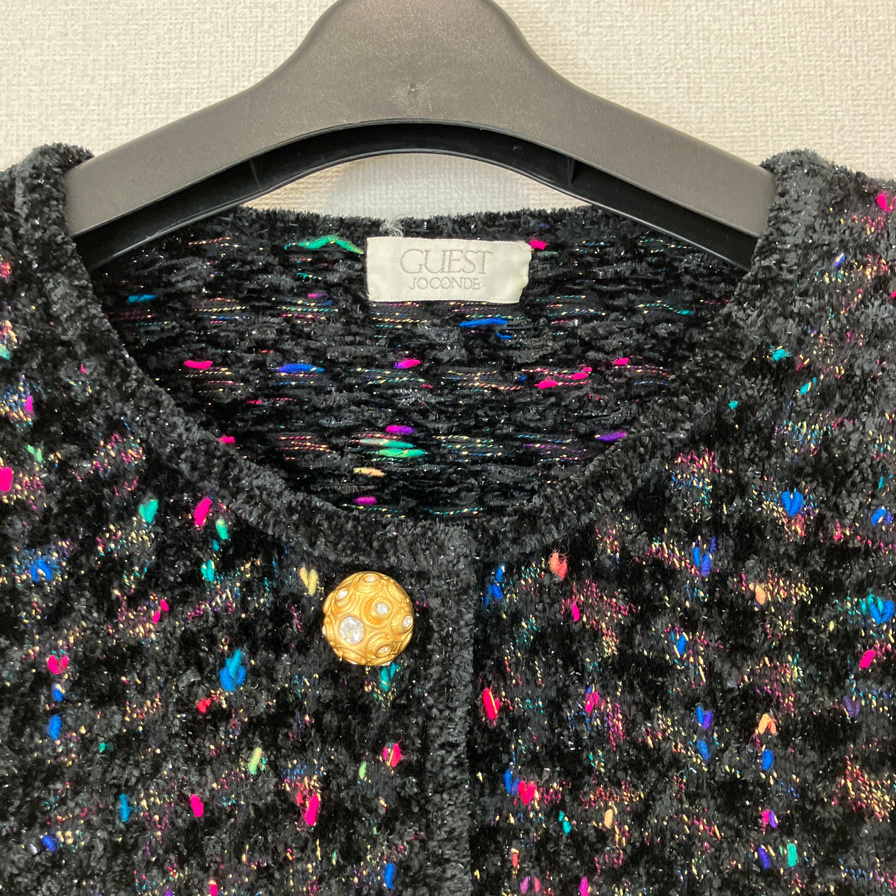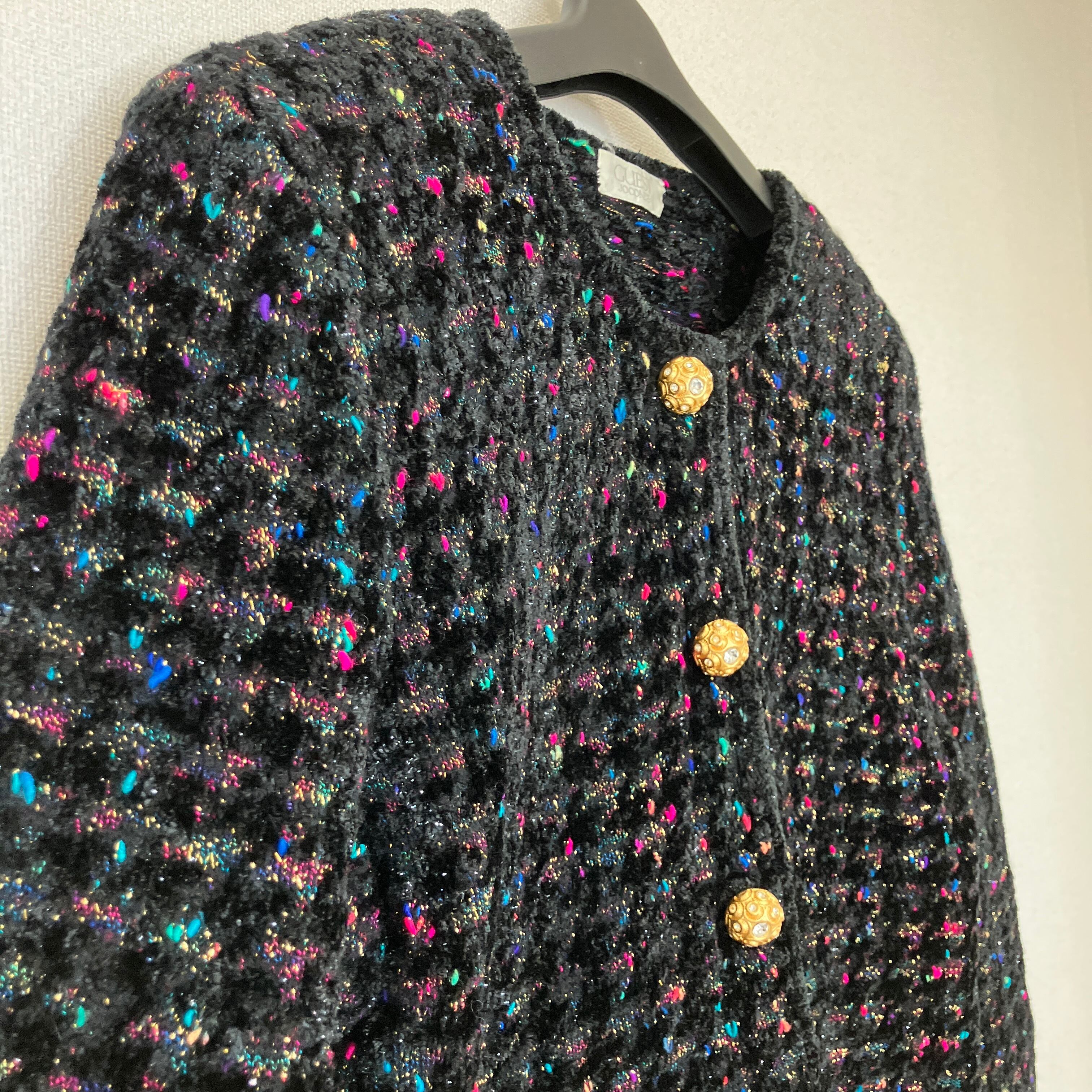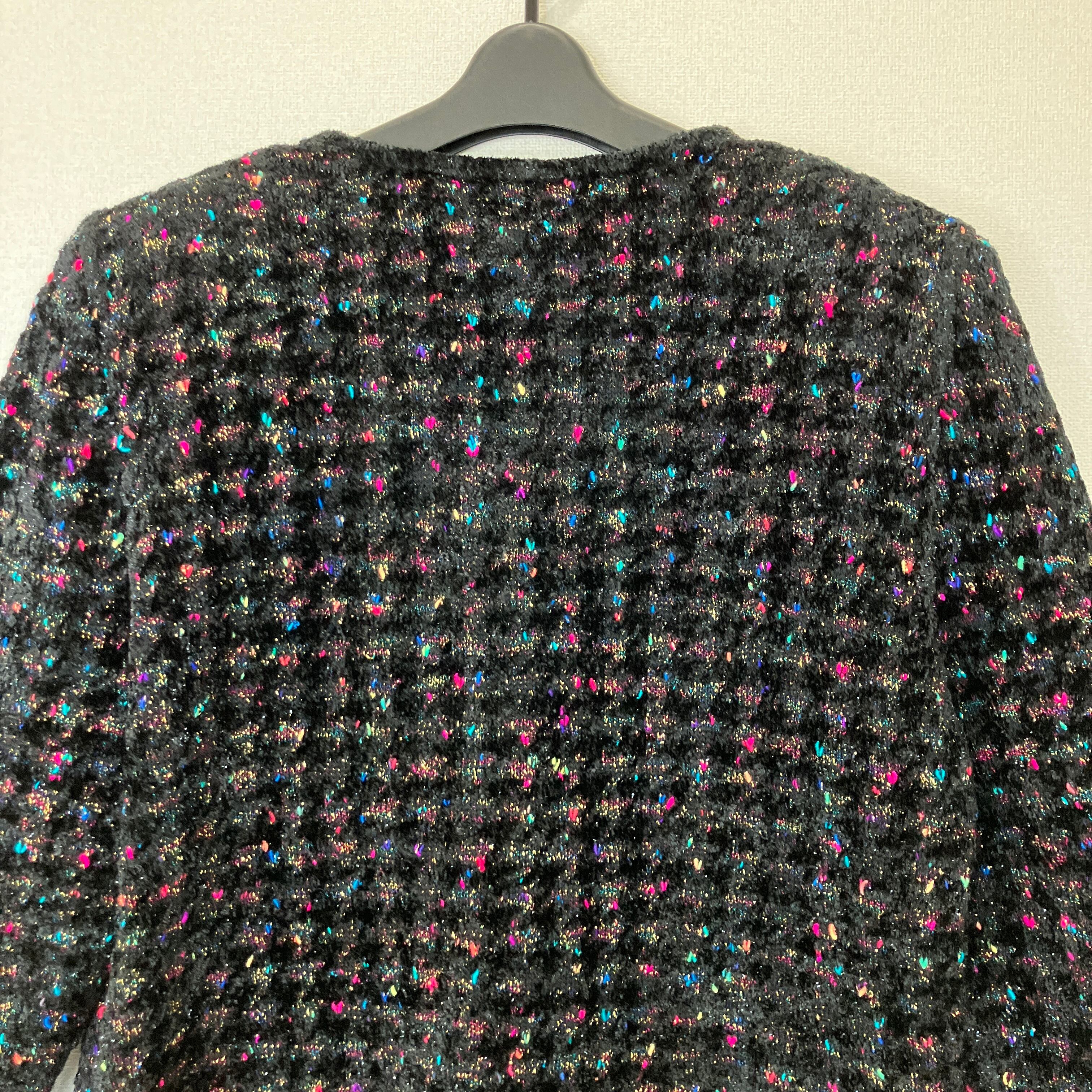 ブラックをベースに、ピンクやブルー、イエローなどのカラフルな糸とラメが編み込まれた、華やかなノーカラージャケットです。