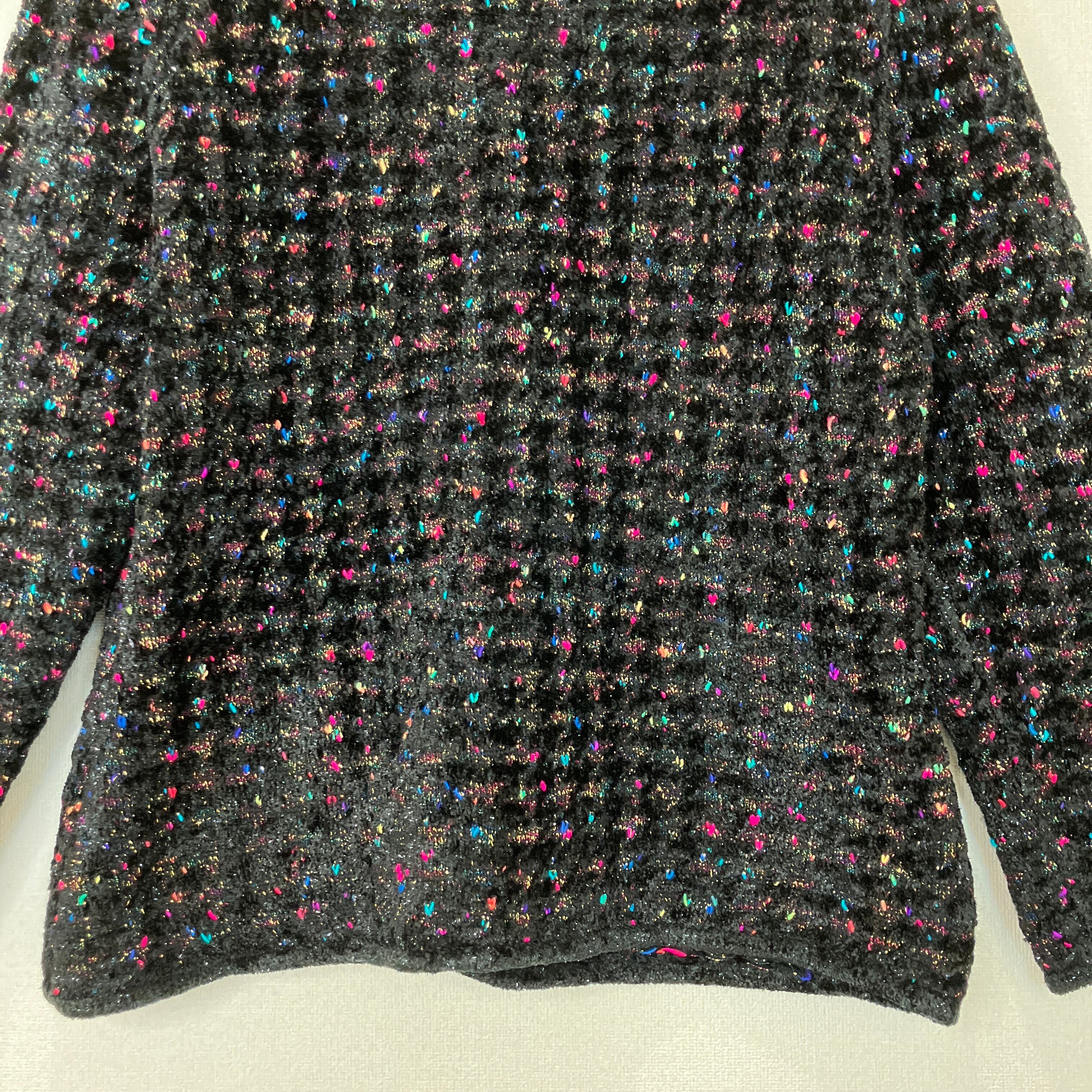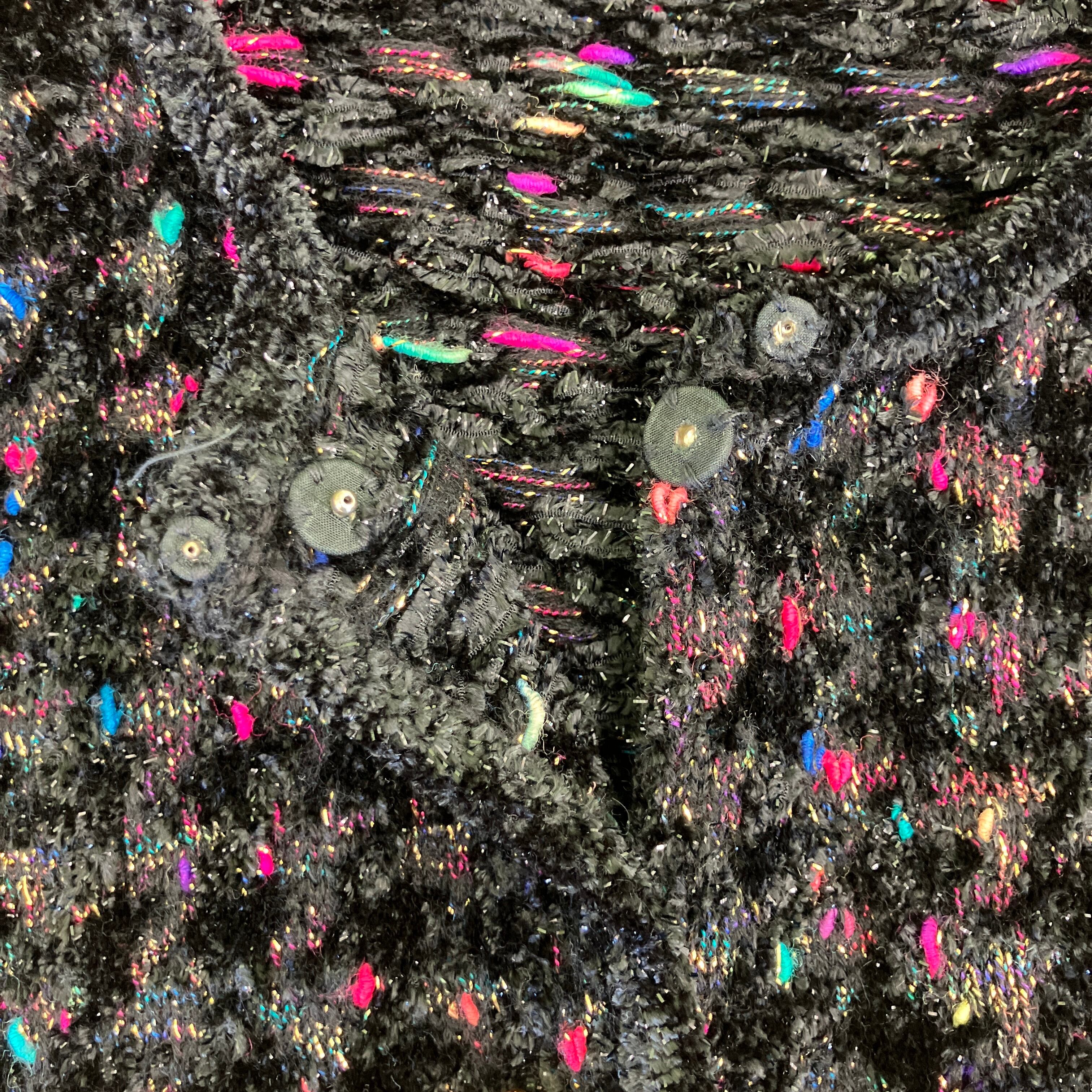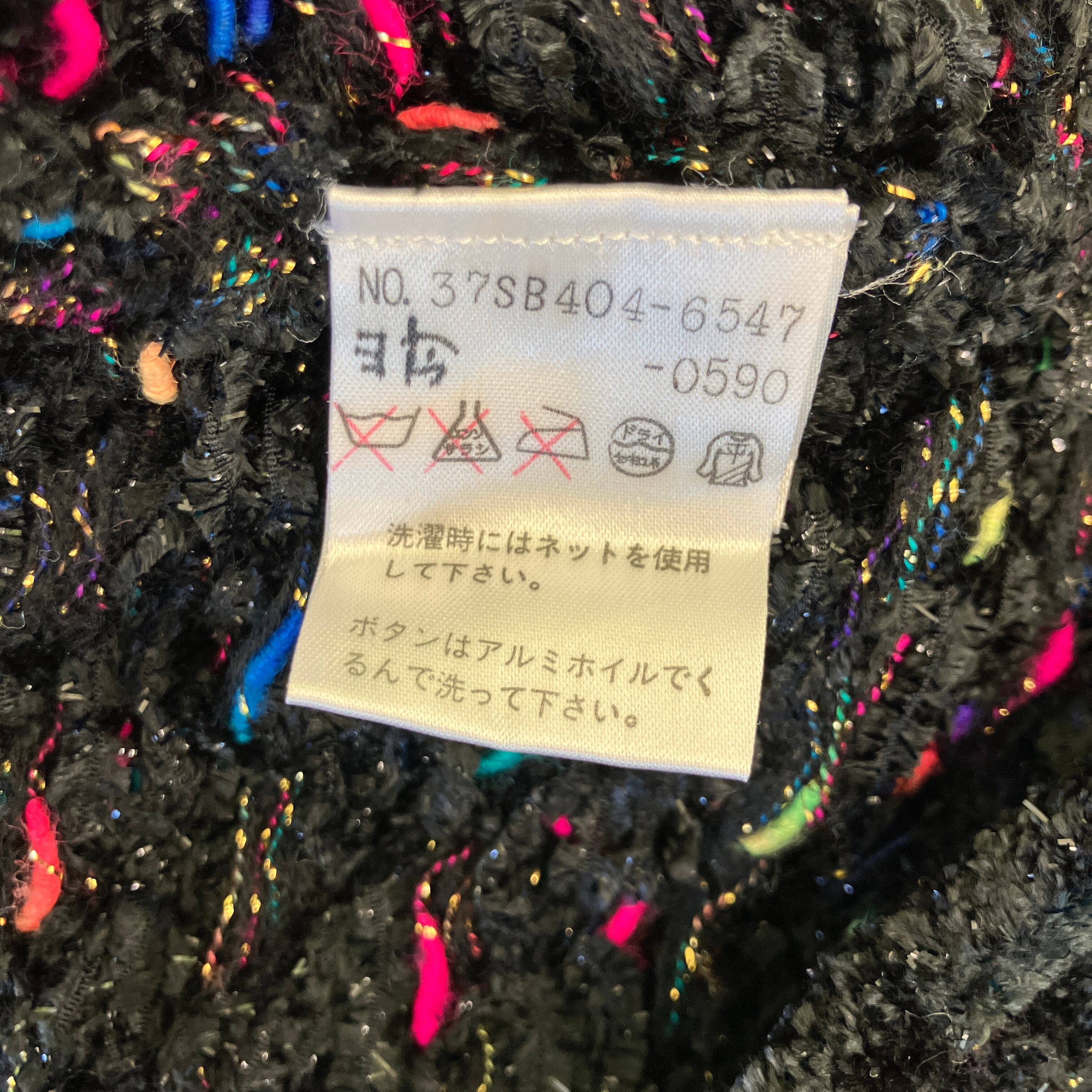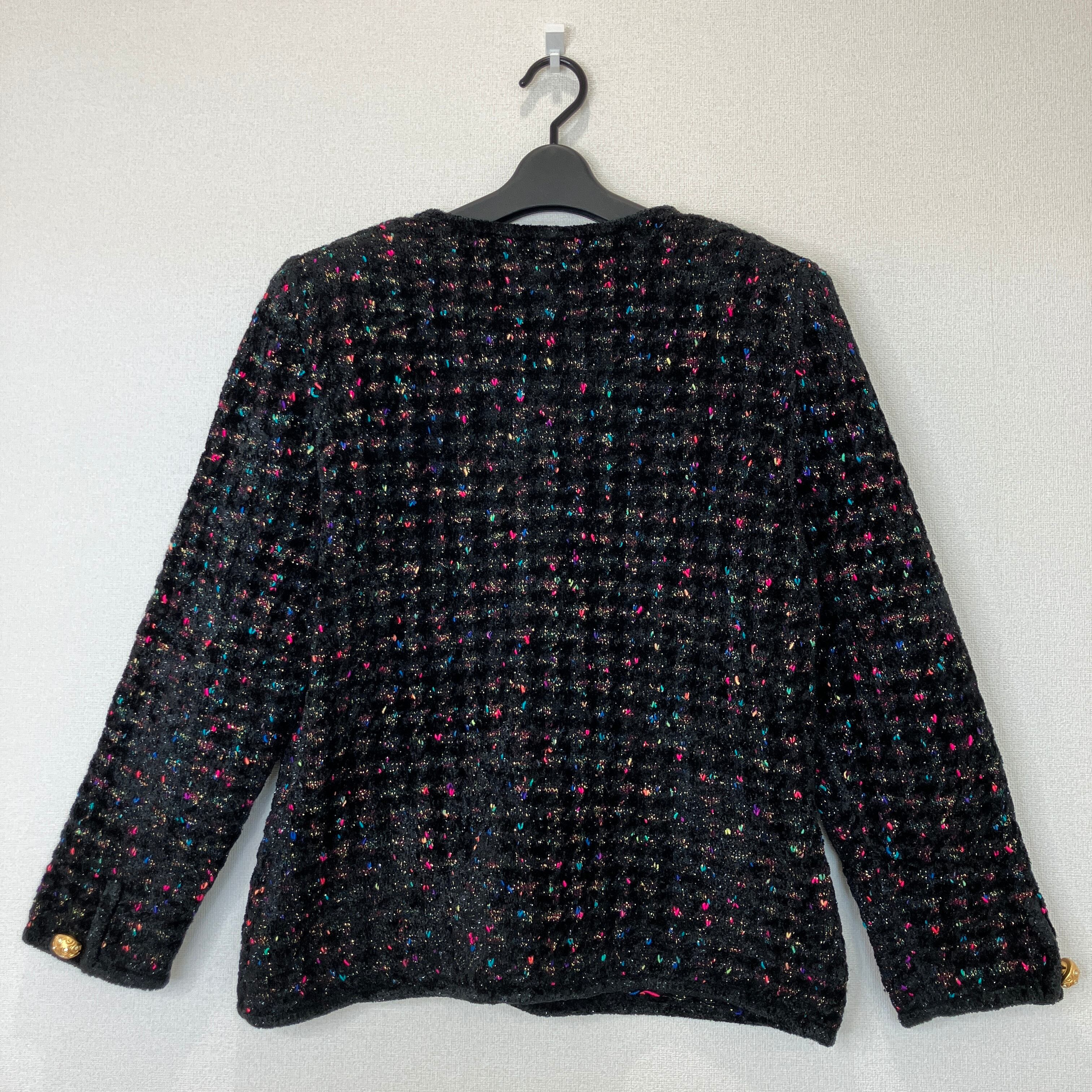 ブラックをベースに、ピンクやブルー、イエローなどのカラフルな糸とラメが編み込まれた、華やかなノーカラージャケットです。