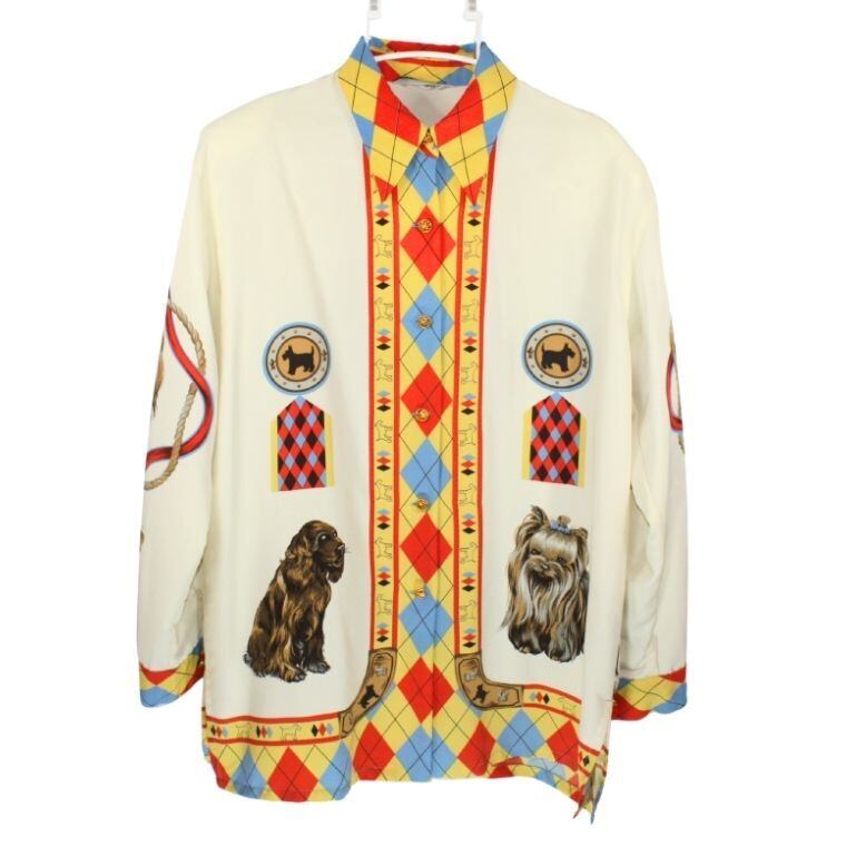 EXOTIC BLUE 総柄ブラウス 犬柄 レトロ デザイン 長袖 レディースM相当