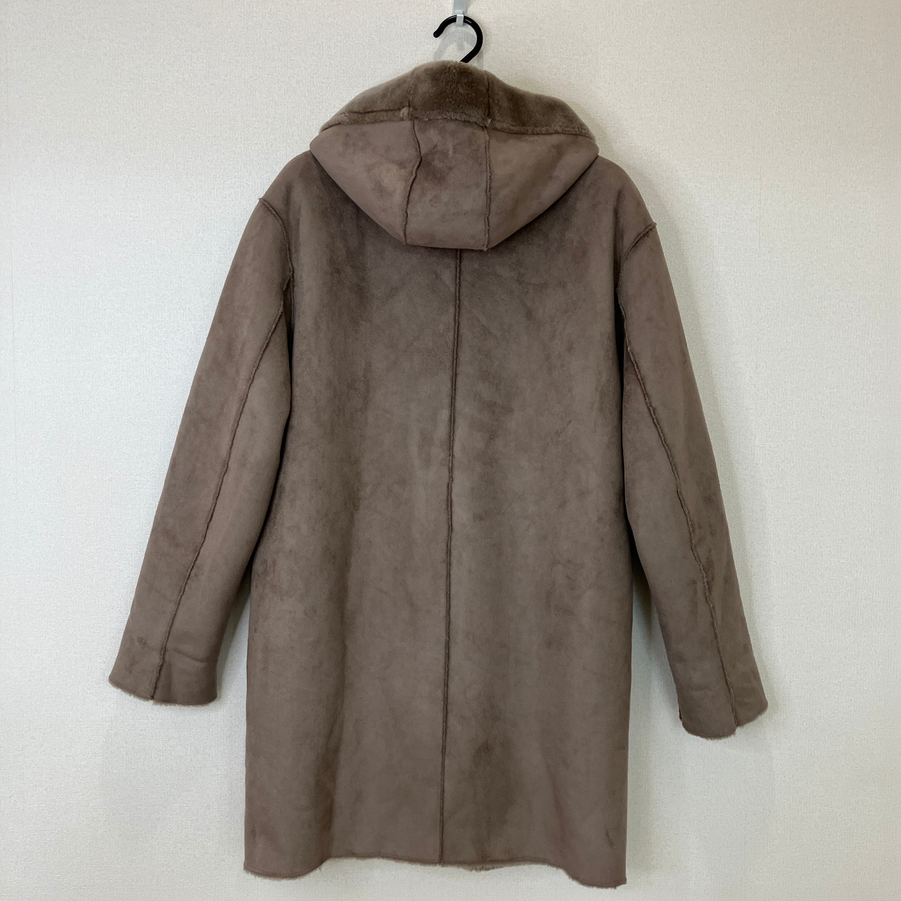 柔らかな肌触りのフェイクムートンを使用した、フード付きのロングコートです。