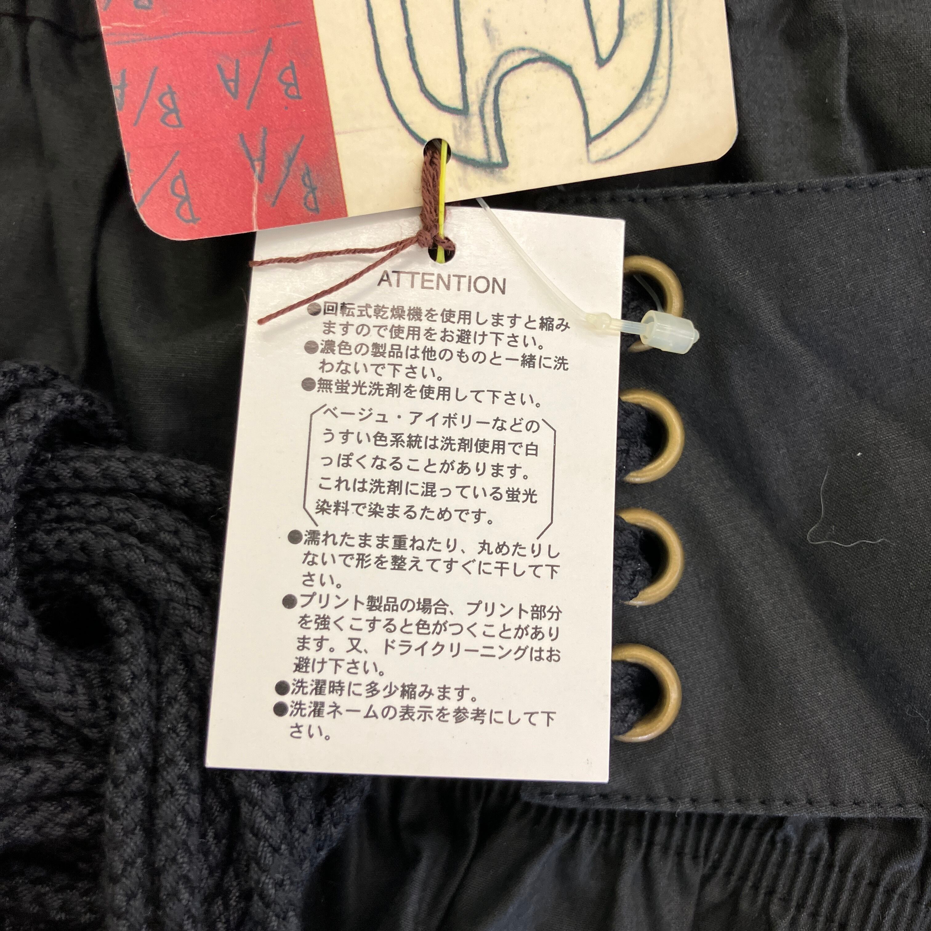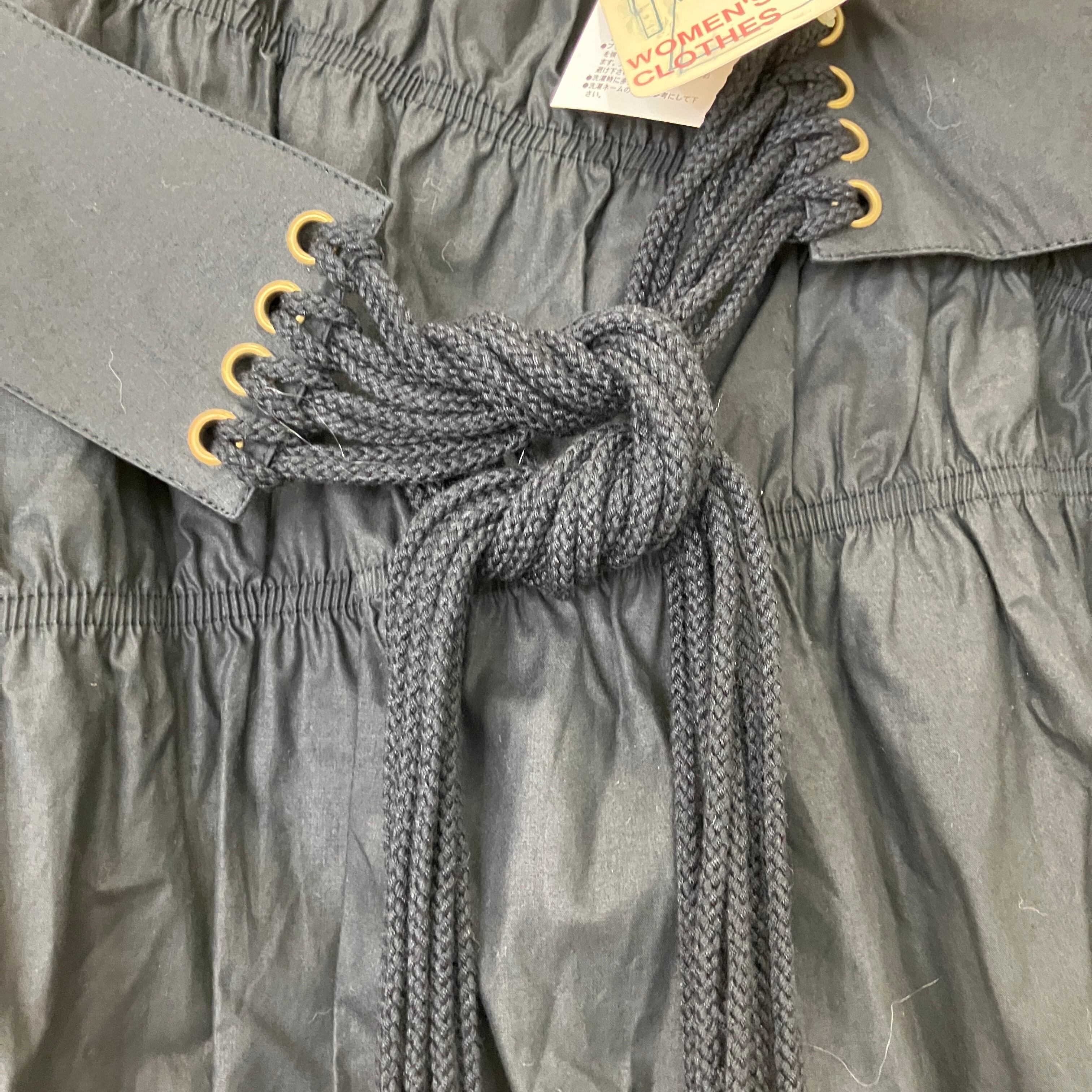 ウエストのシャーリングデザインと、太めの共布ベルトに太いロープ紐を通した独特なウエストデザインが特徴的。