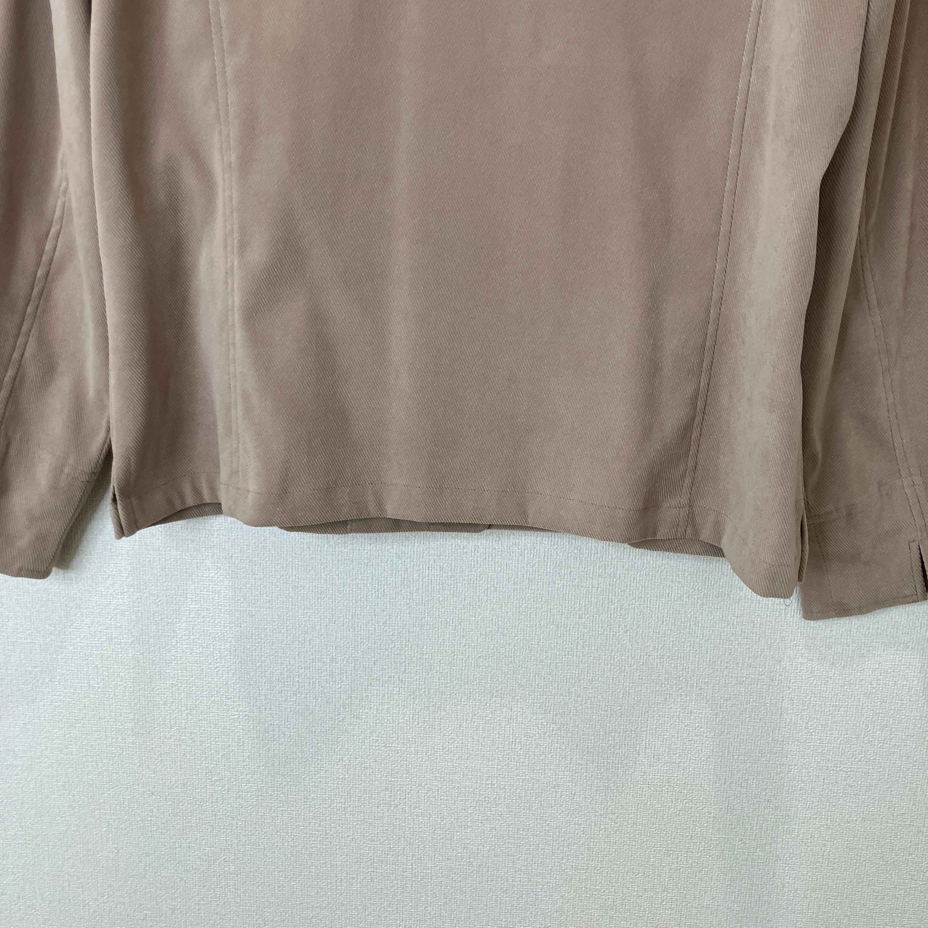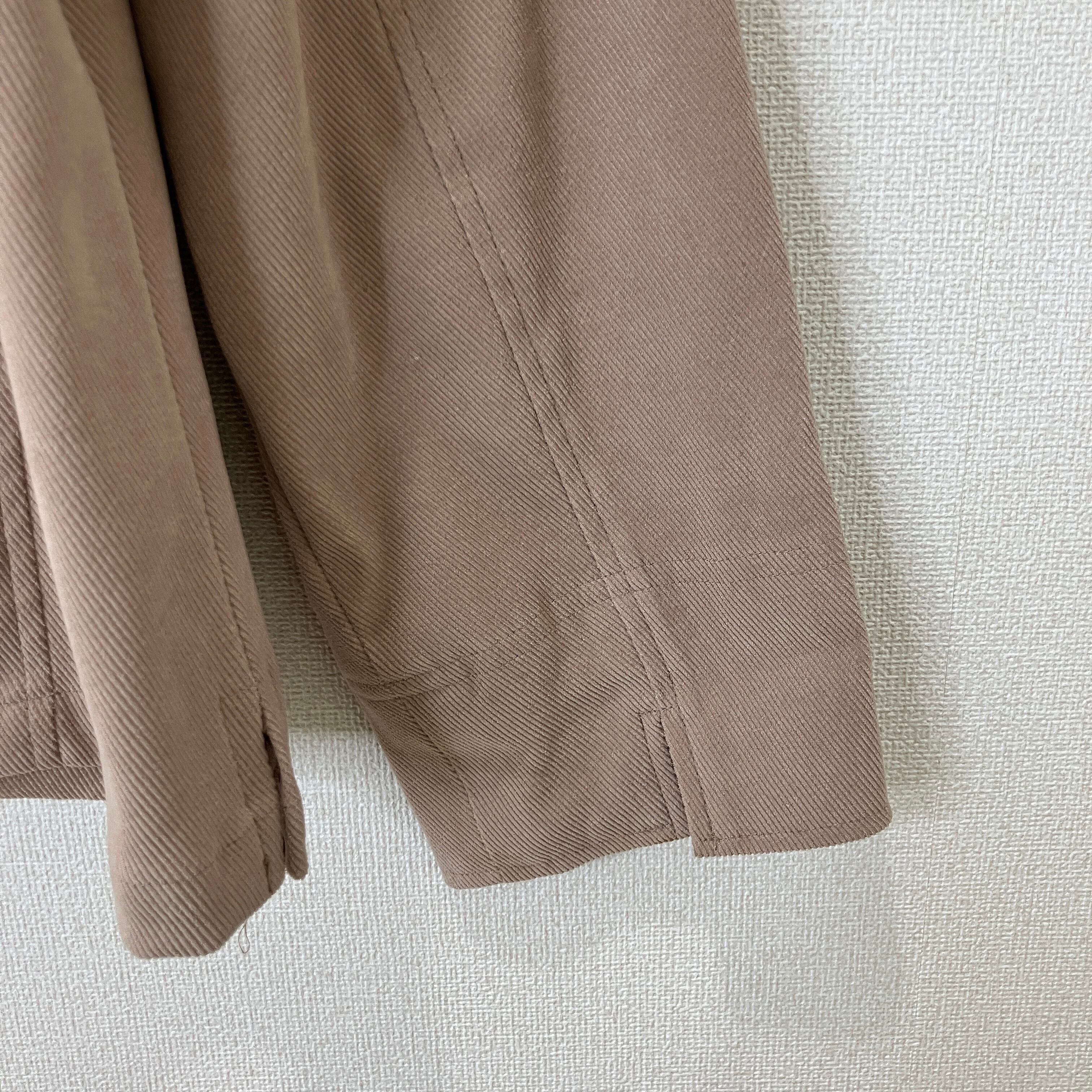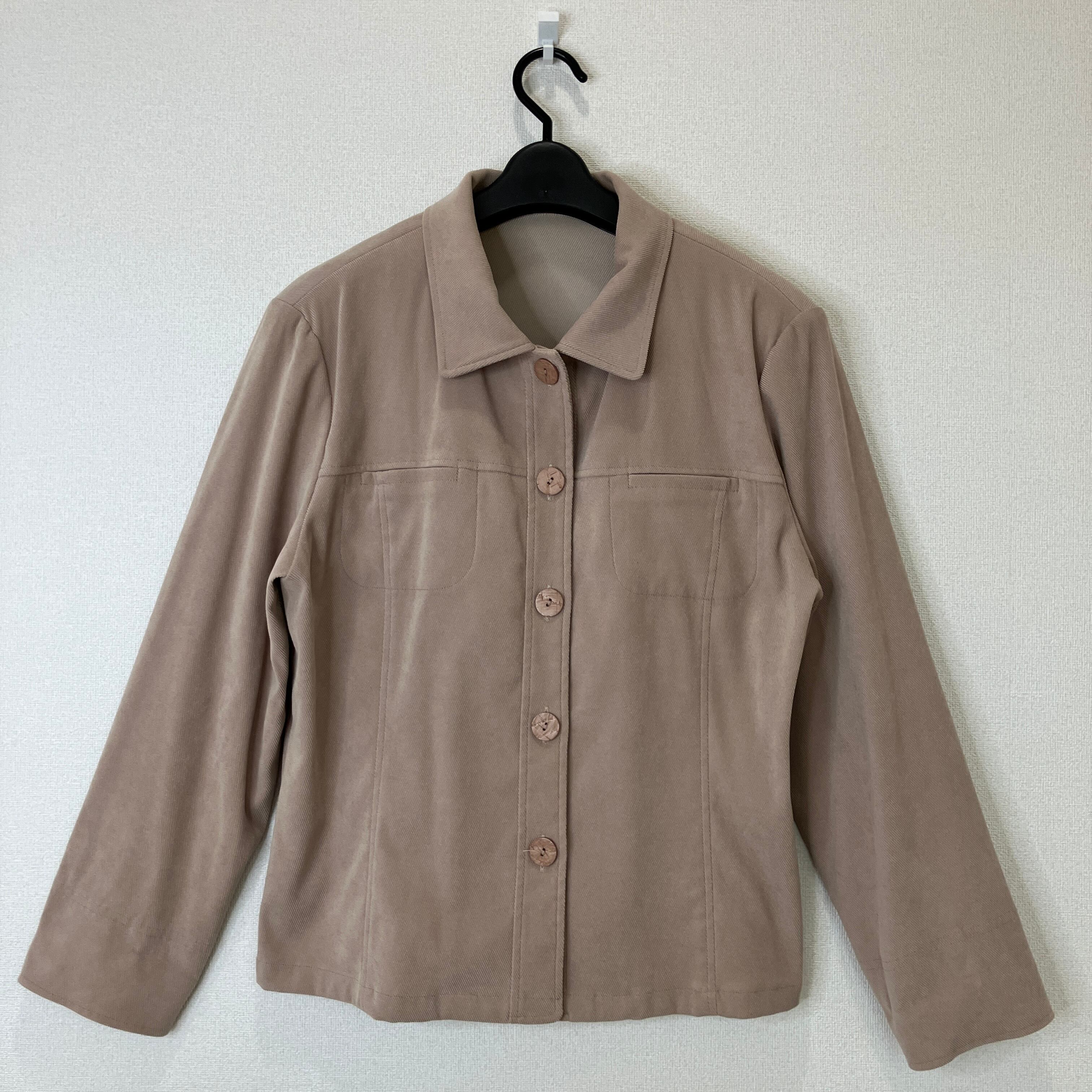 落ち着いたベージュカラーのシャツジャケットです。コーデュロイのような畝(うね)のある柔らかな生地感で、季節の変わり目の羽織りとして重宝します。