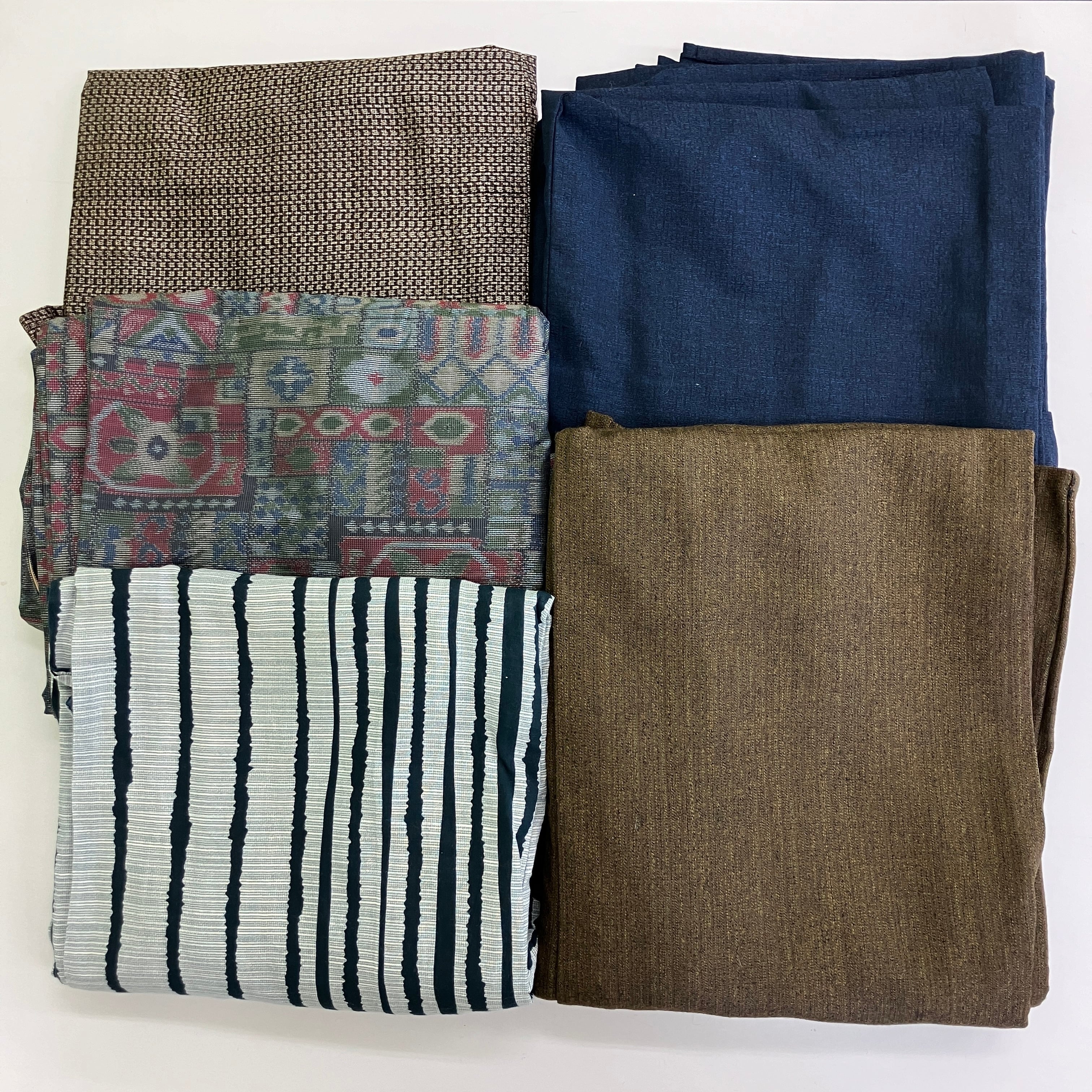 落ち着いた色合いの無地や、モダンなストライプ、幾何学模様などバリエーション豊かな古着物5点セットです。
